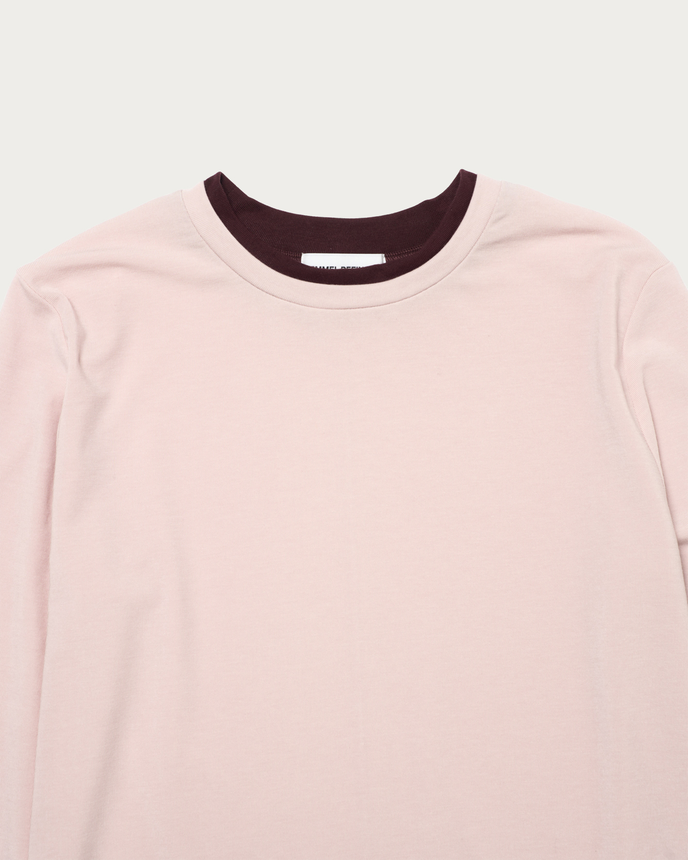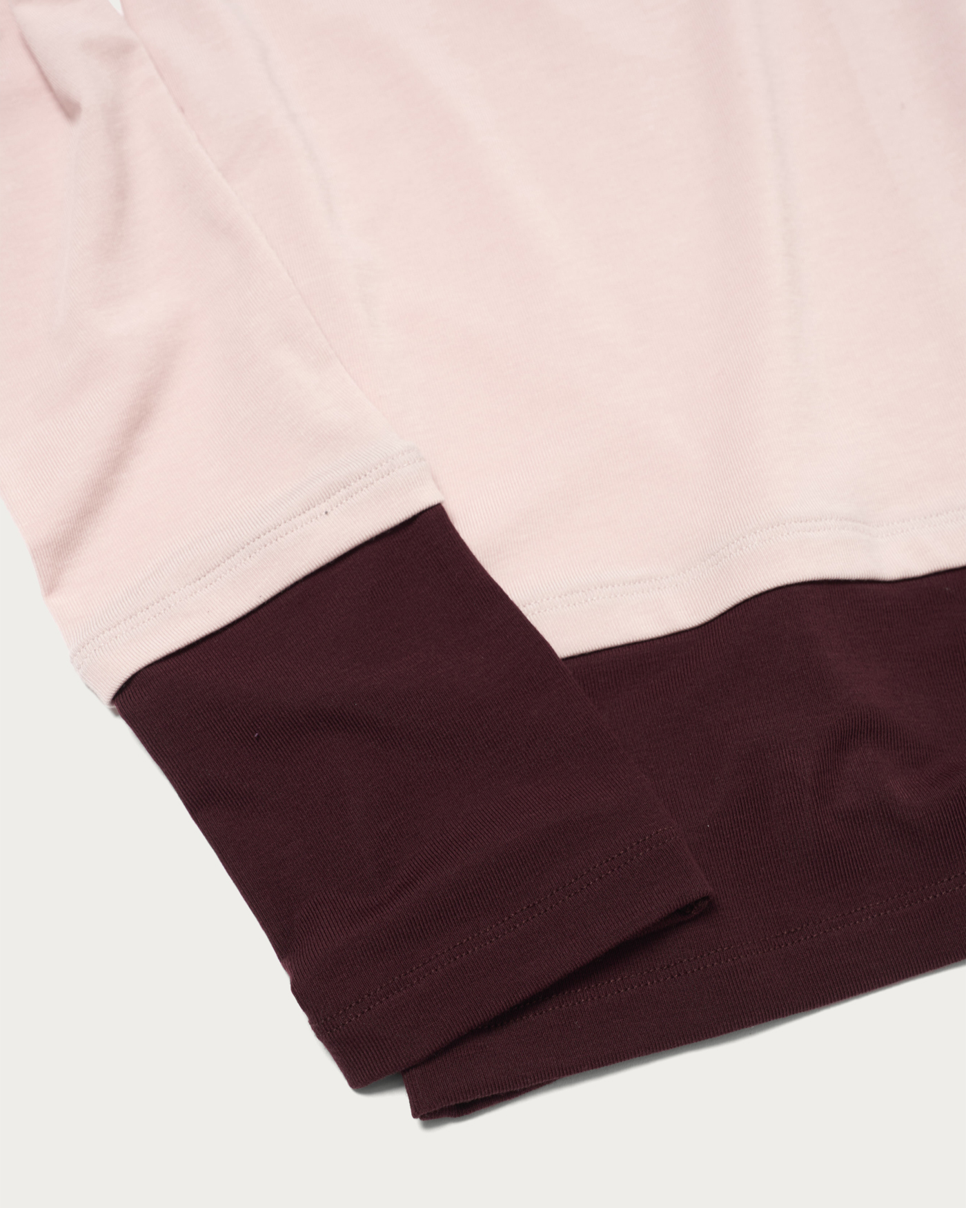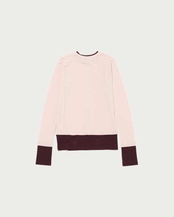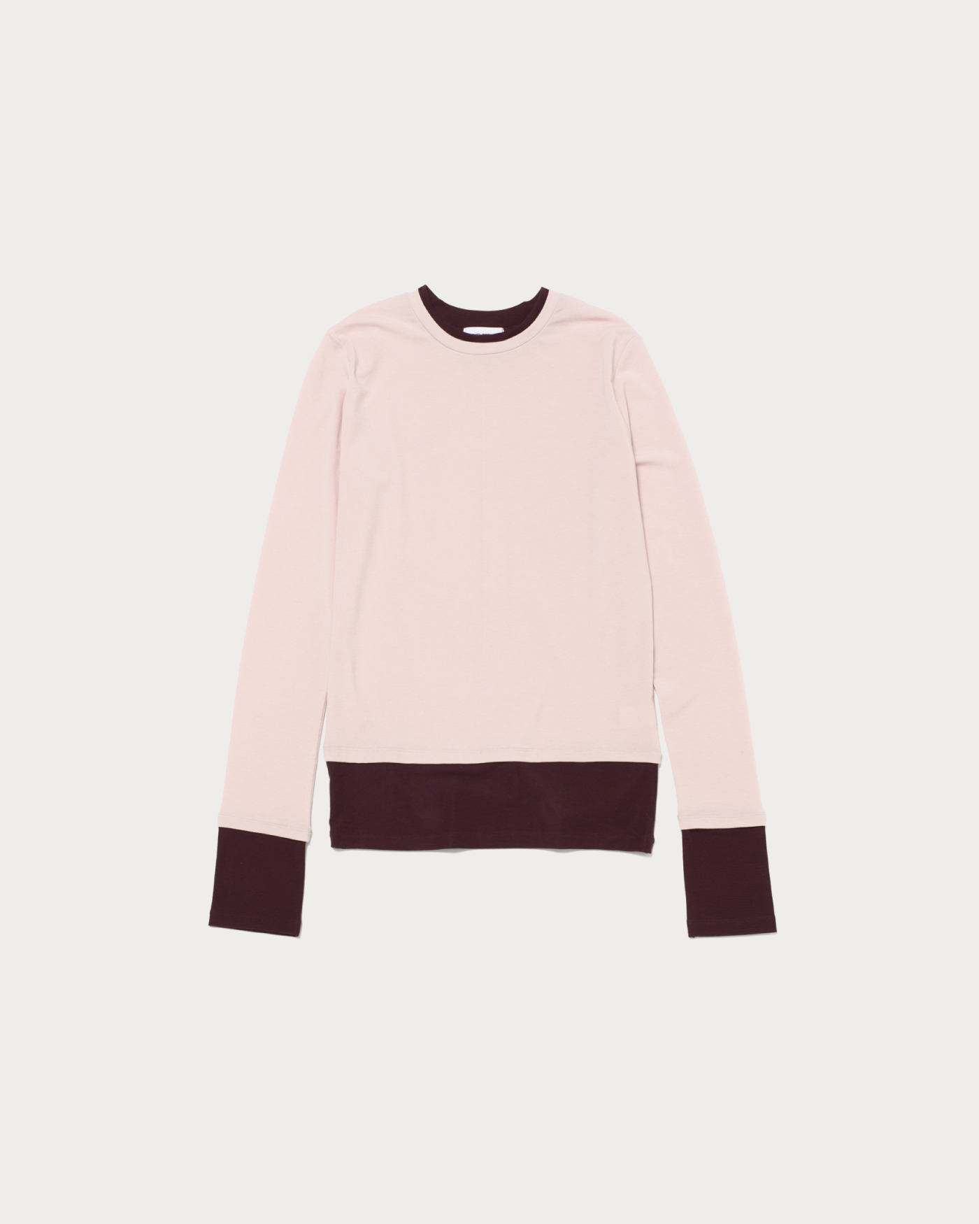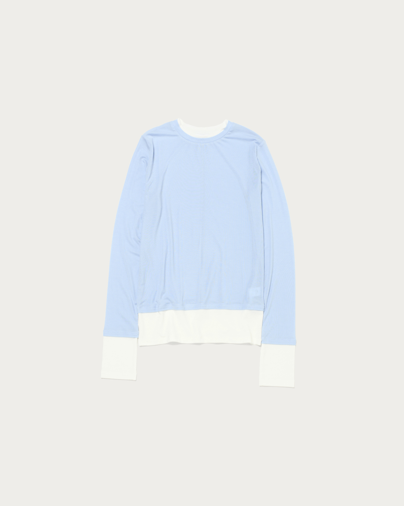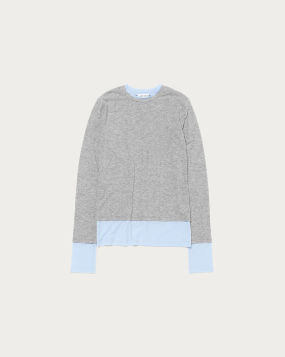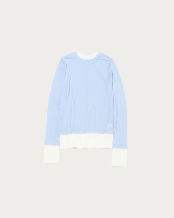 A long-sleeve T-shirt with layered-style color accents as its key detail. Made from a lightweight and soft-textured ribbed fabric, it offers a moderately compact silhouette that allows for a feminine fit. The design features an adorable style with the color-blocked cuffs and hem gathered for a charming look.