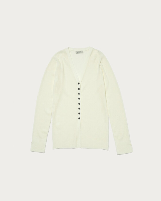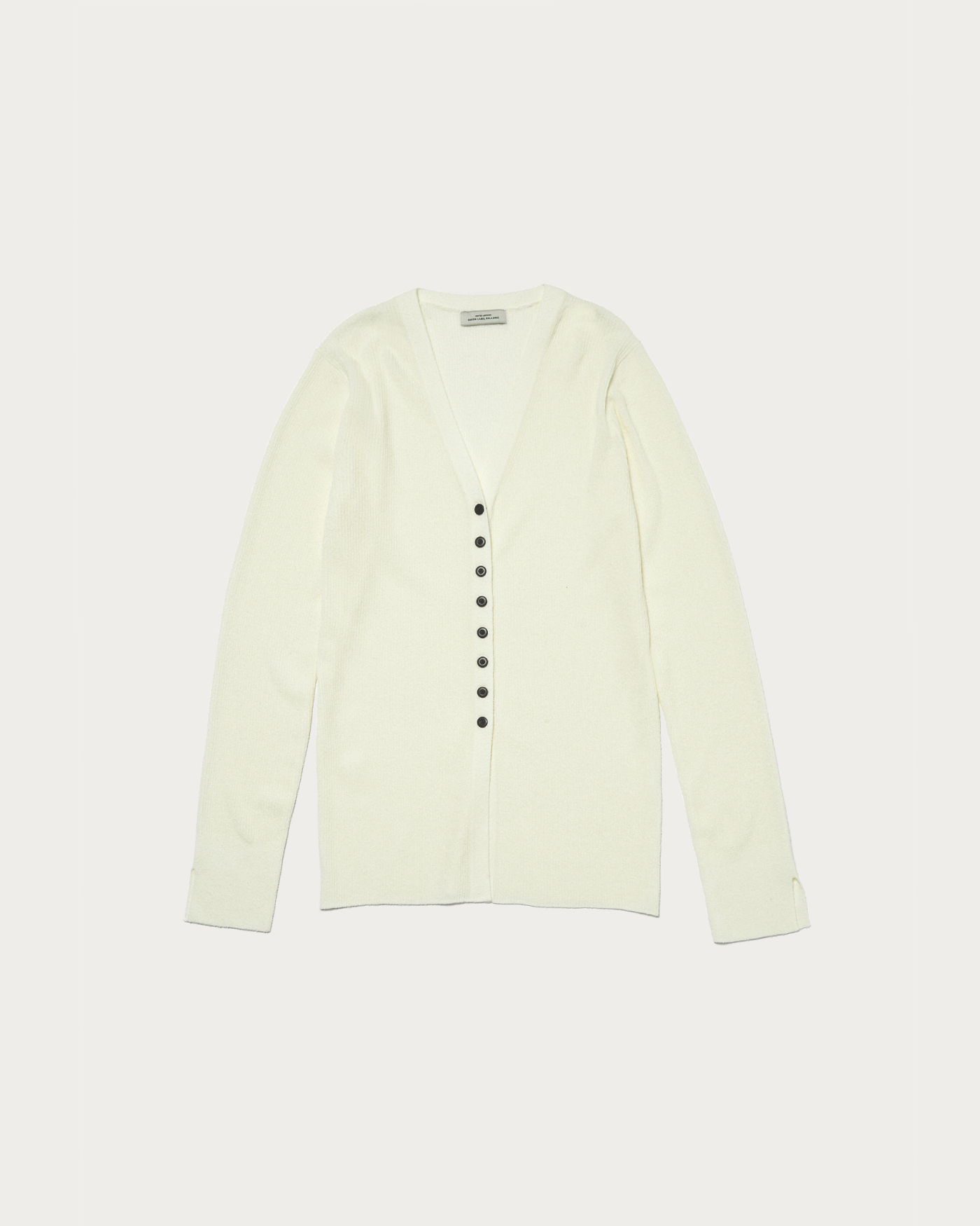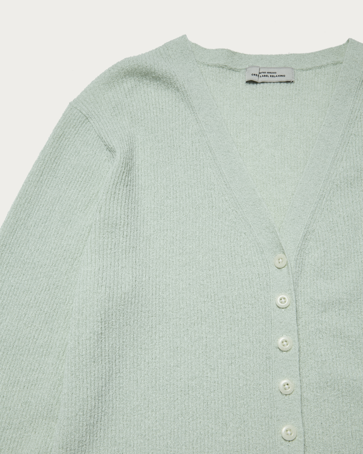 The cardigan, made from a soft and comfortable rib knit, features a V-neck that gives a clean look around the face. Despite its simple design, the buttons on the front add just the right amount of accent. Subtle slits at the cuffs add a touch of effortless style.