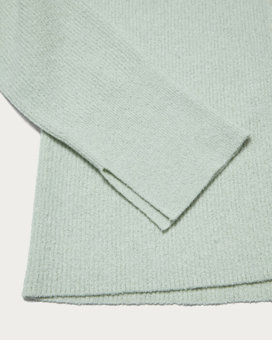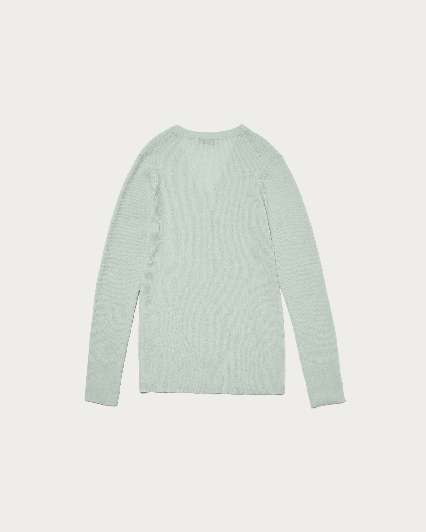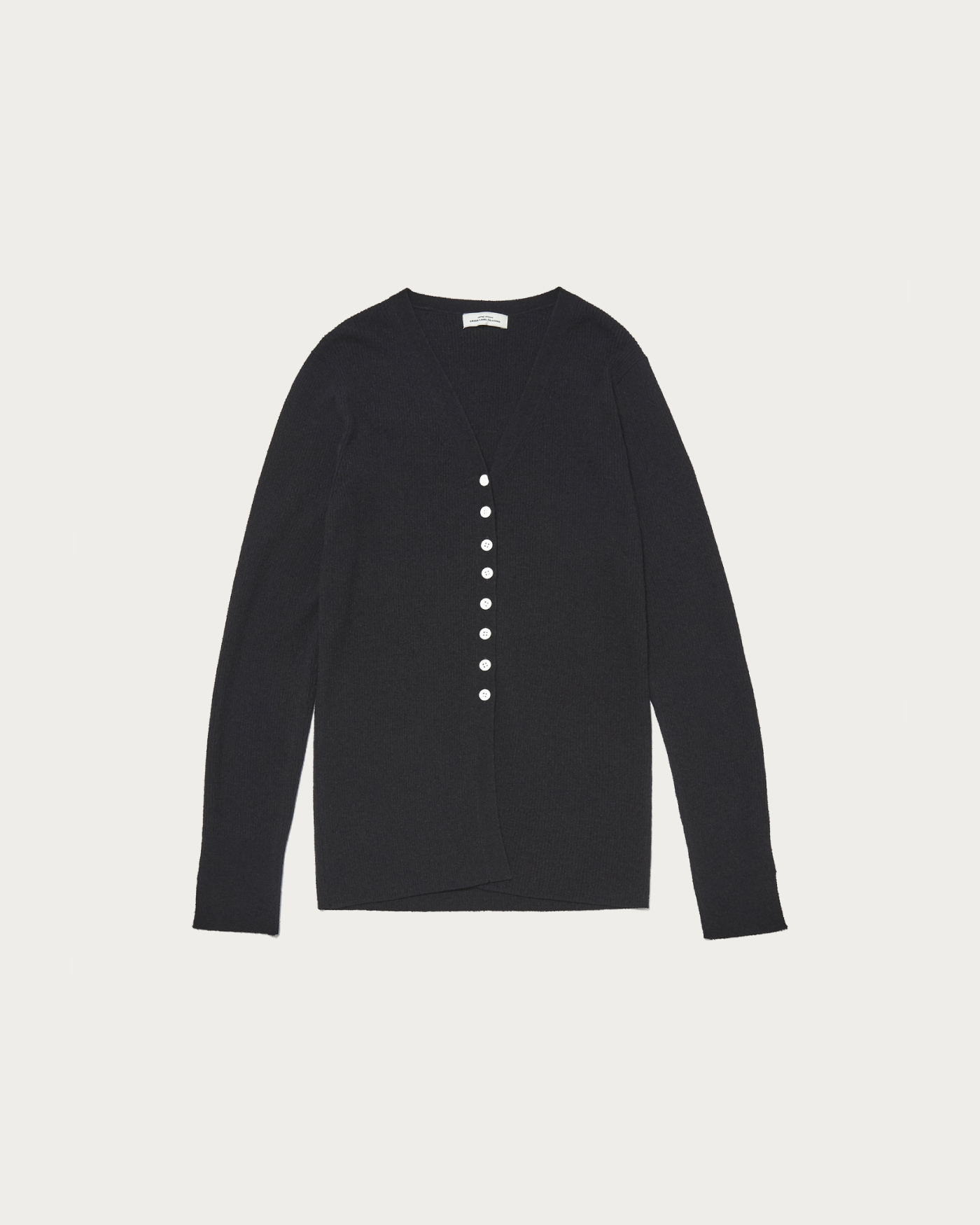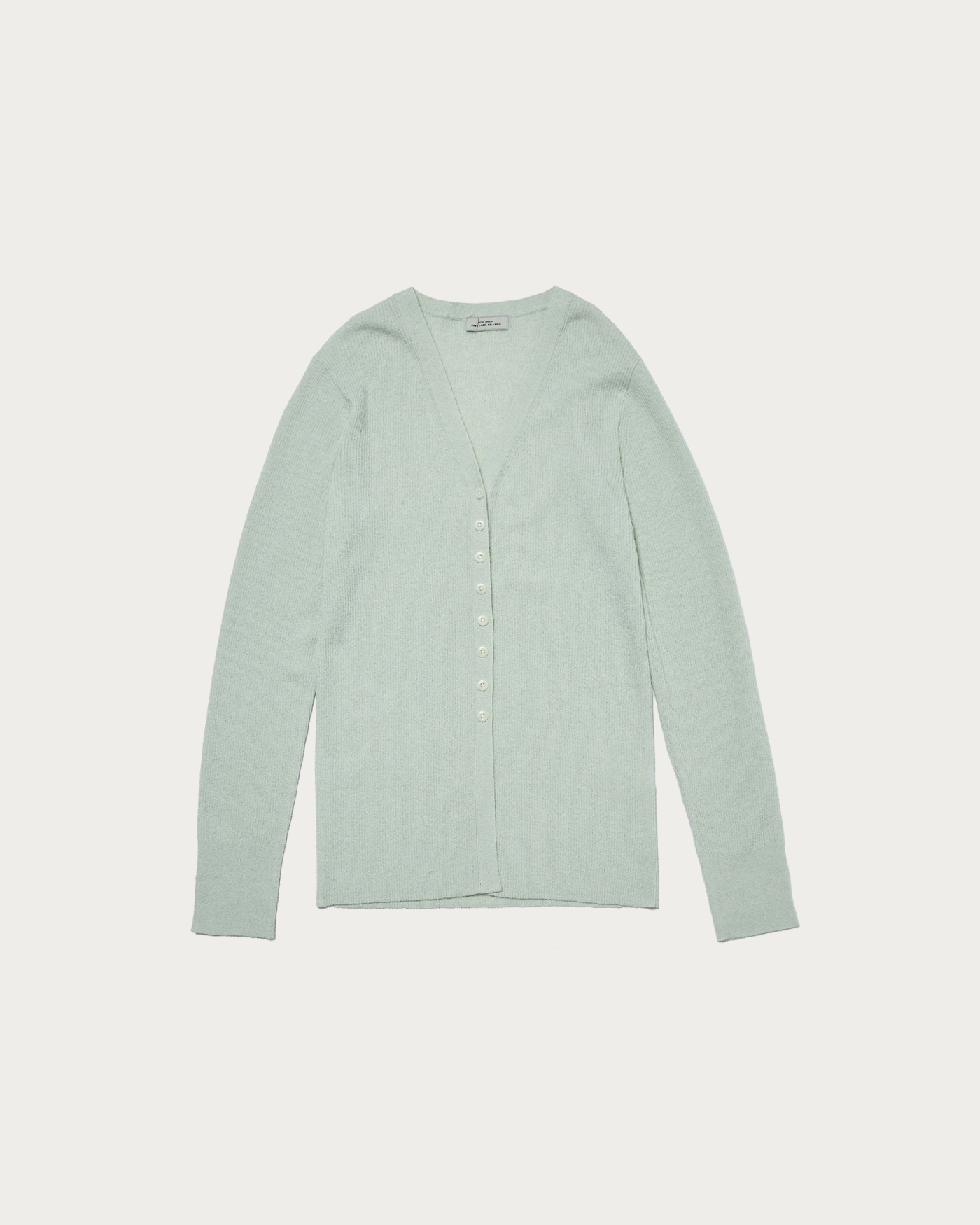 The cardigan, made from a soft and comfortable rib knit, features a V-neck that gives a clean look around the face. Despite its simple design, the buttons on the front add just the right amount of accent. Subtle slits at the cuffs add a touch of effortless style.