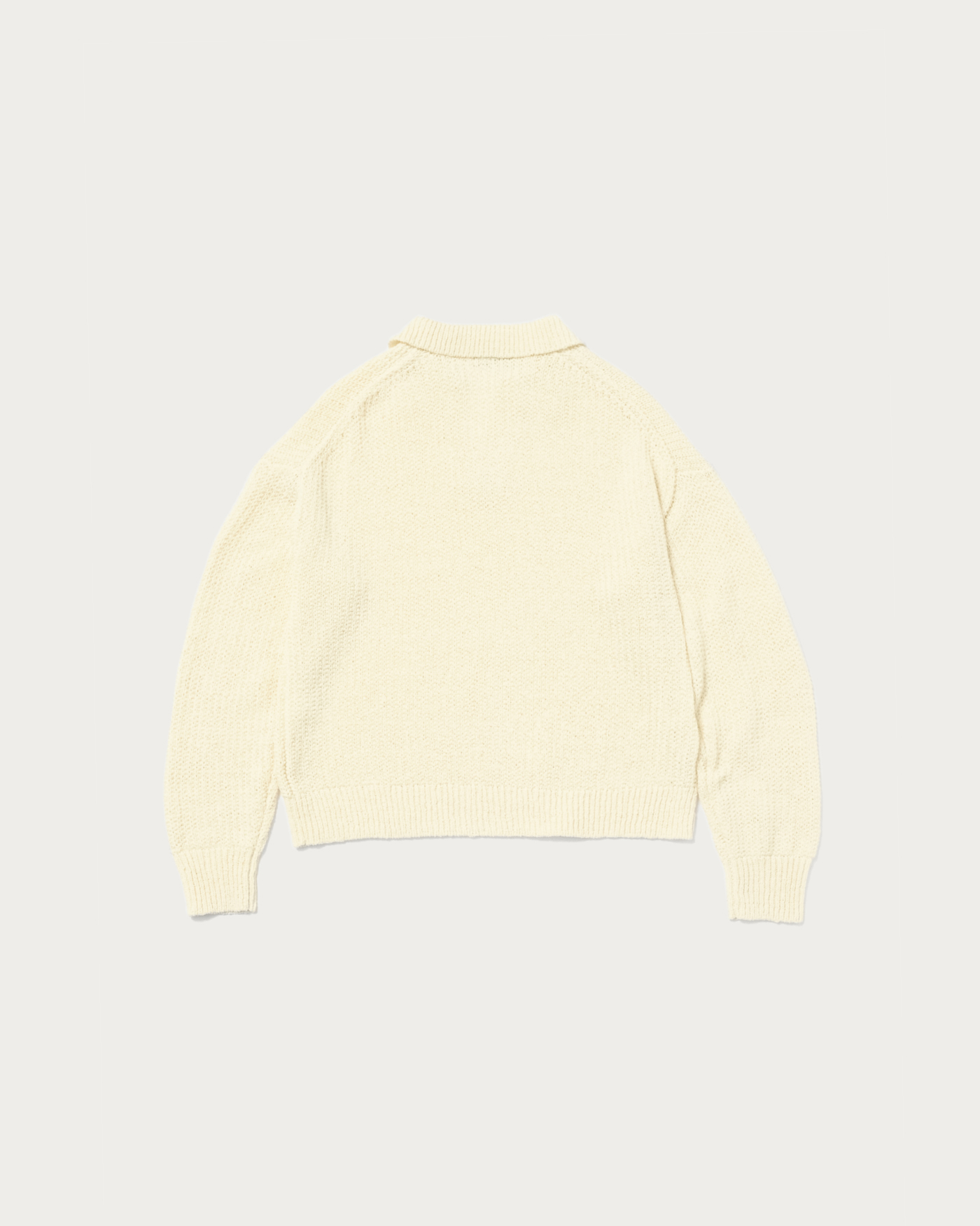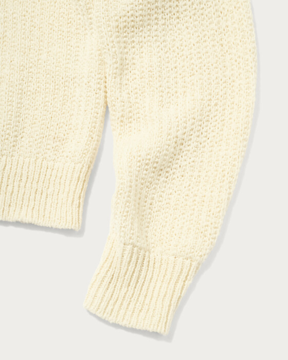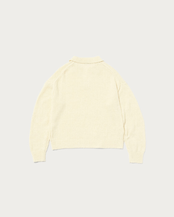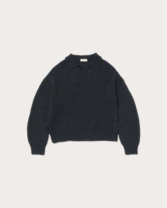 The skipper design tape yarn knit is a piece that combines casualness with elegance. Its unique textured knit, characteristic of the material, makes it a simple yet stylish accent to any outfit. The compact length is a key feature, making it easy to pair with trendy wide-leg pants.