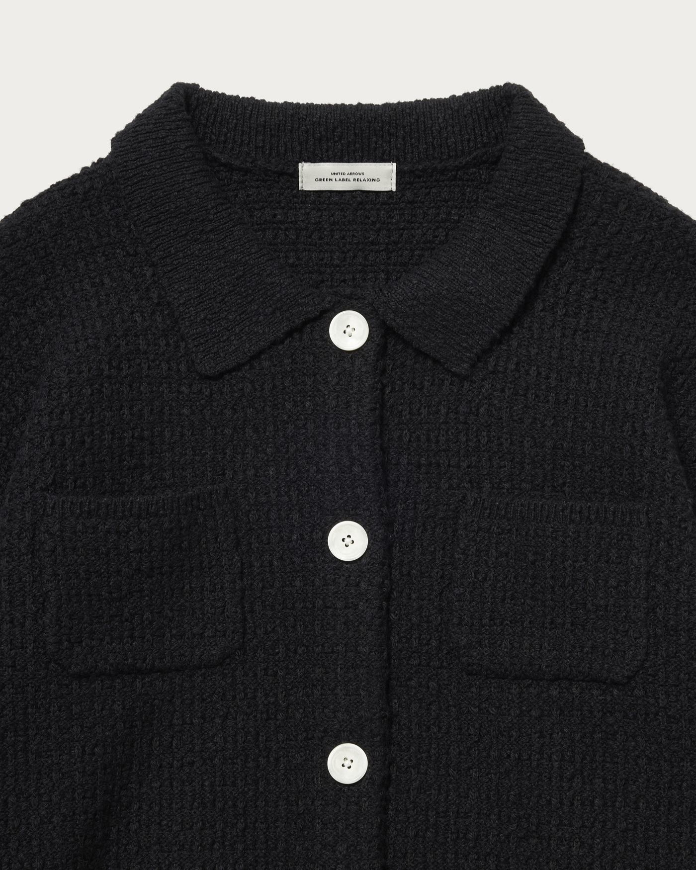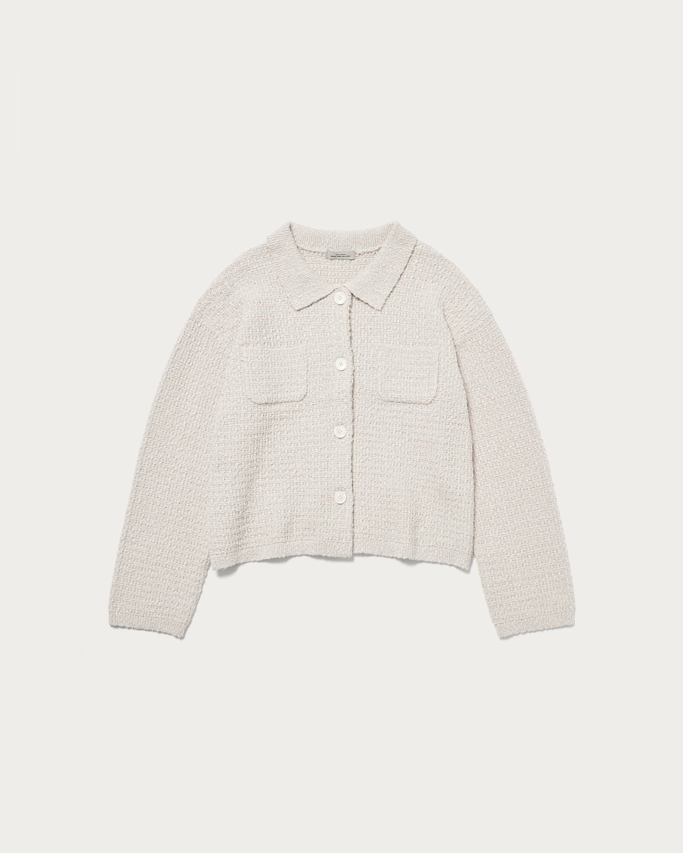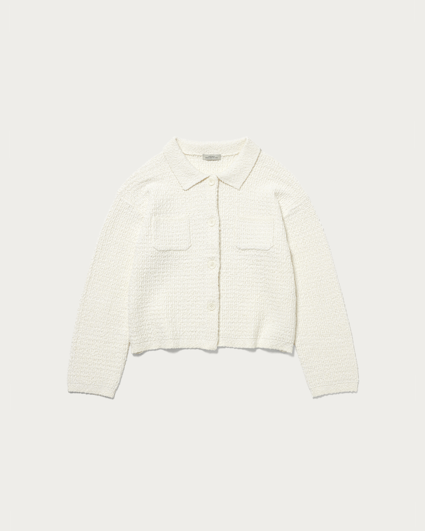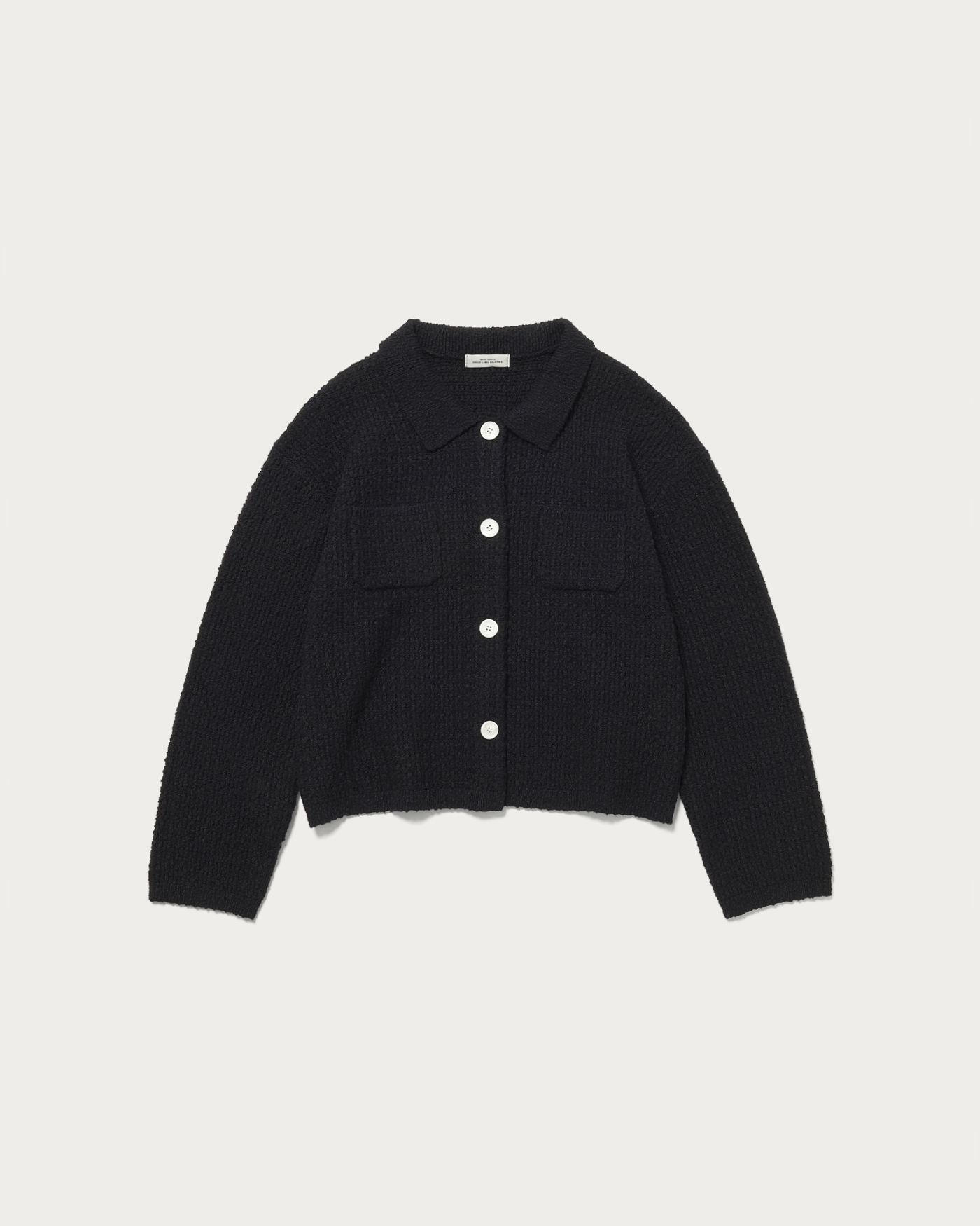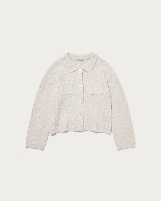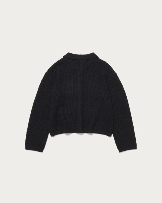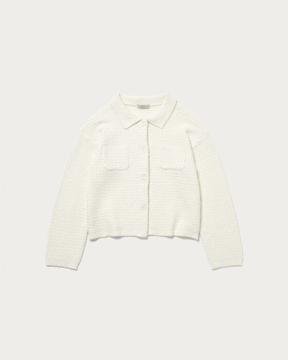 The polo knit cardigan, made from textured bouclé material, has a strong presence and features a compact length for a well-balanced look. Its sleek and defined silhouette is a key highlight. While simple, the chest pocket adds a subtle accent.