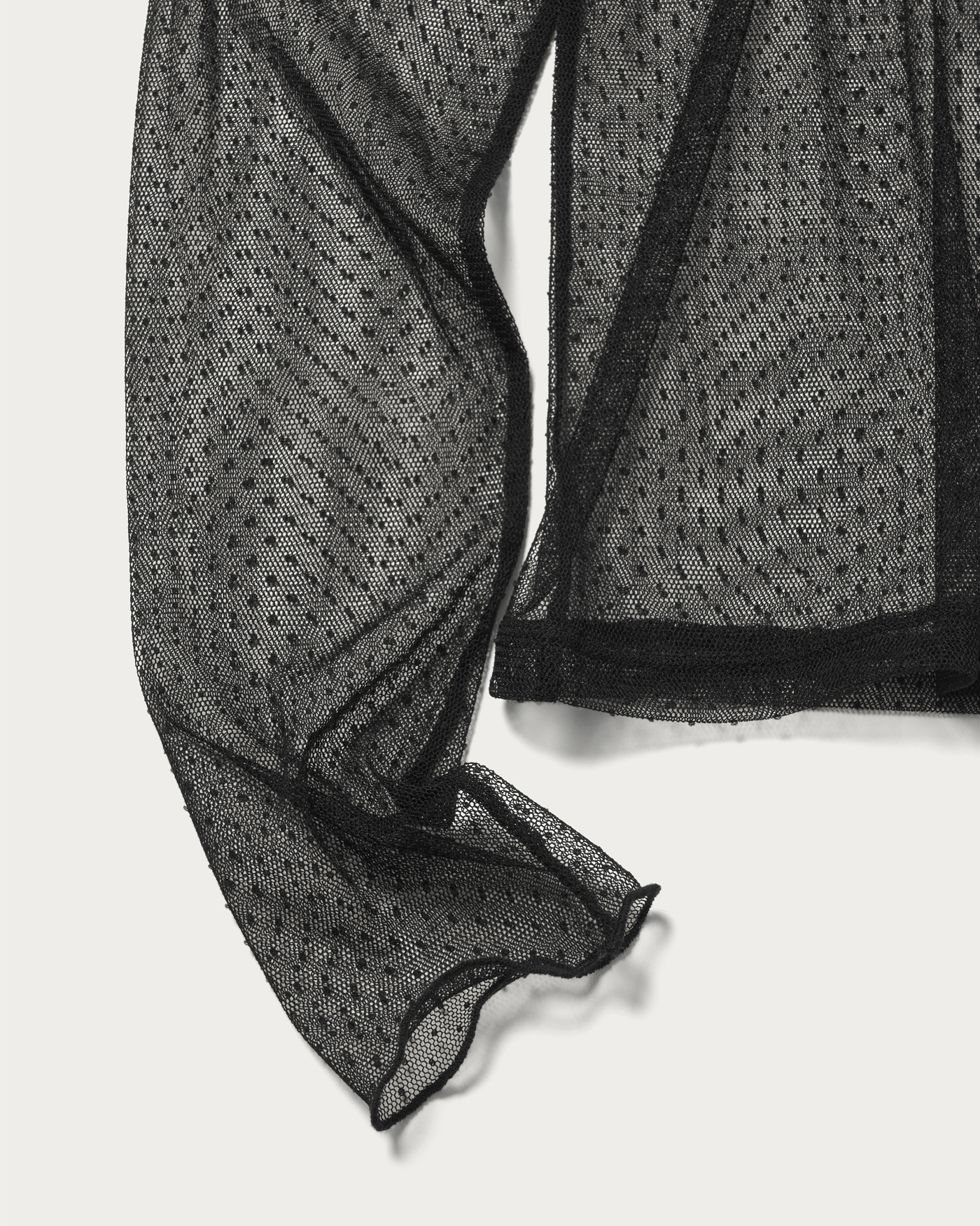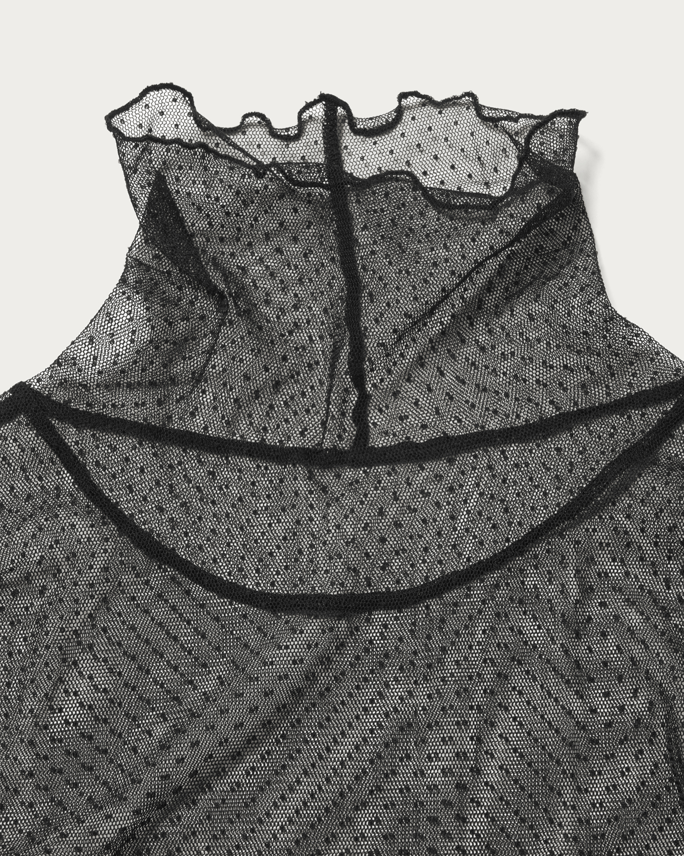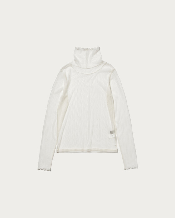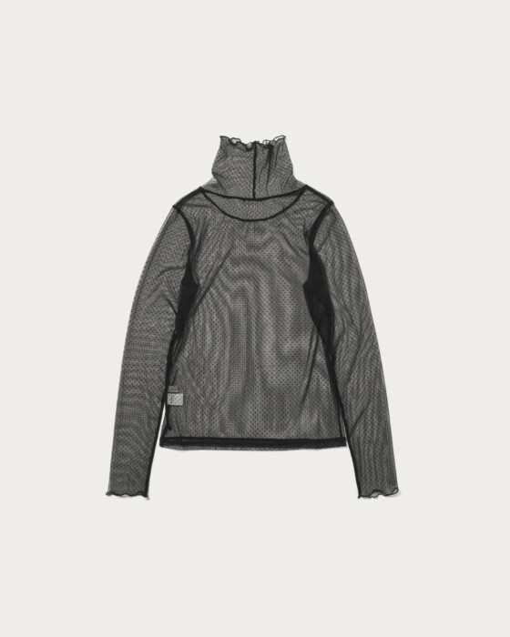 A turtleneck cut-and-sew that achieves a trendy look just by layering. Made with tulle material, it has a moderate sheer quality, and the small dot pattern gives a glamorous impression. It can be worn with knits or sweatshirts on still chilly days, and paired with shirts in early spring, making it a versatile piece for a long season.