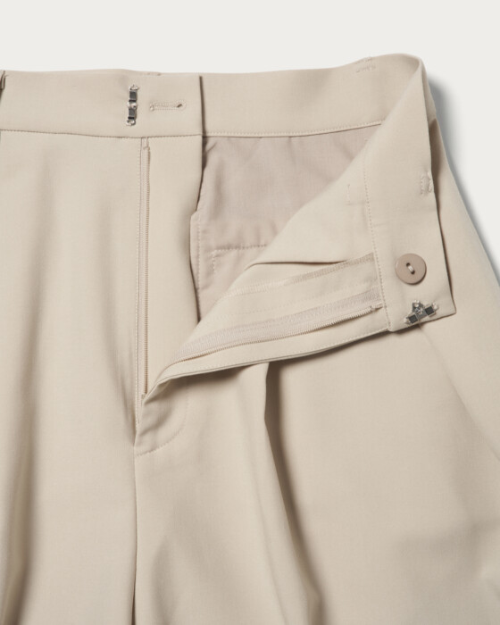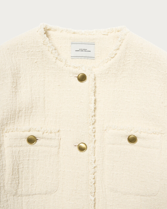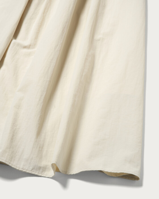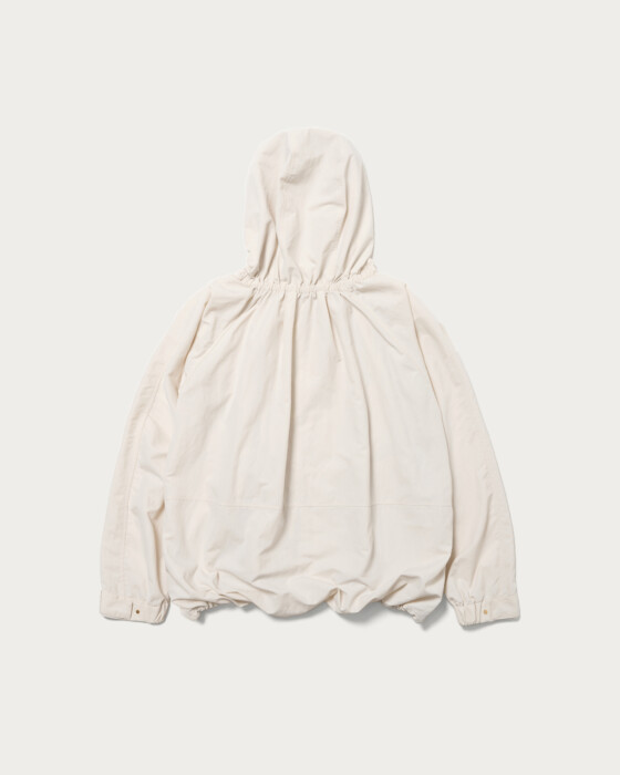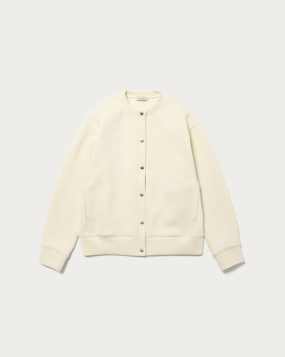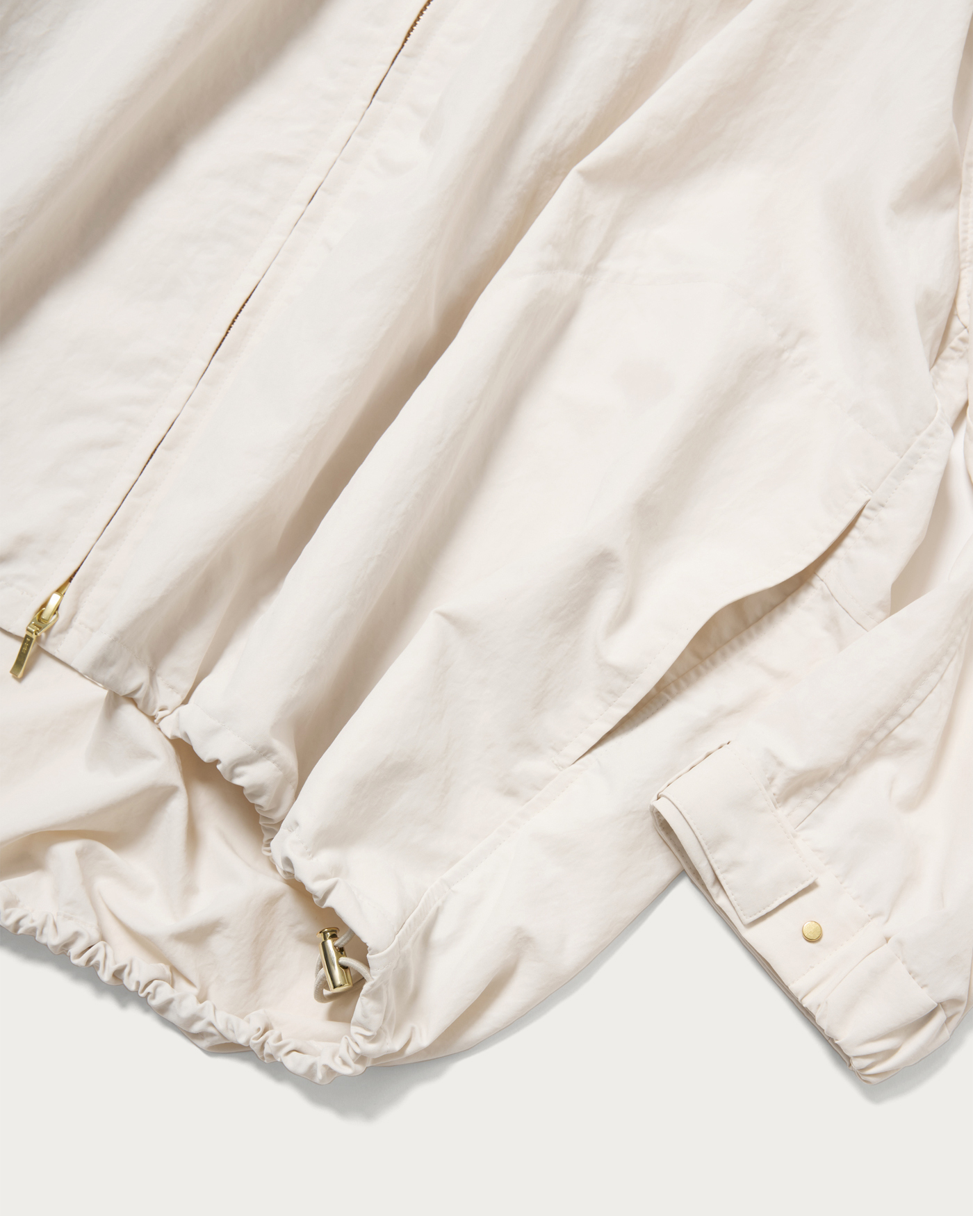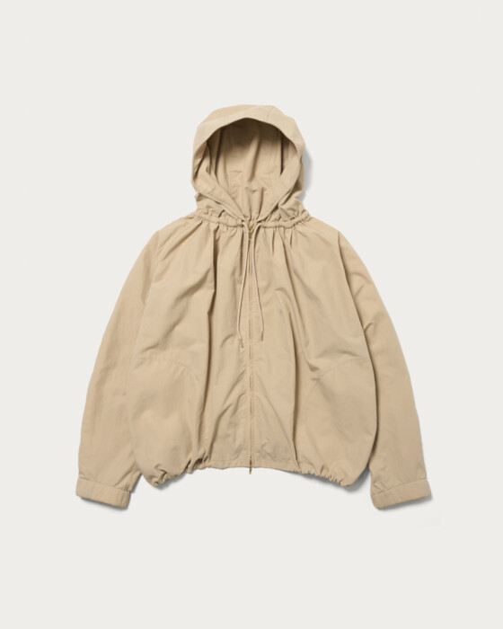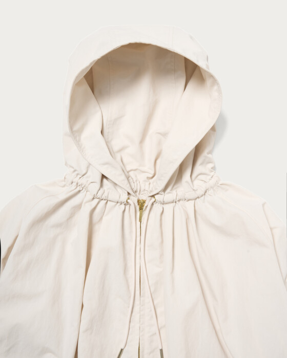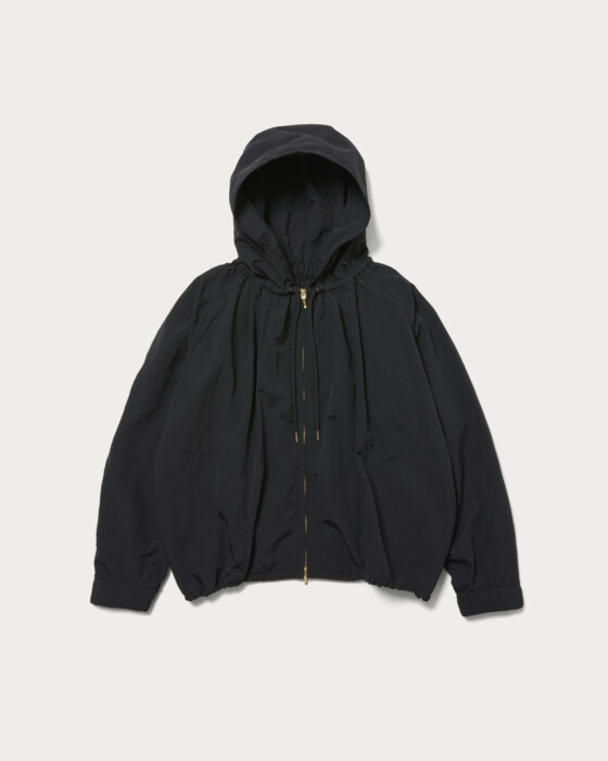 The food blouson, which tends to lean towards a casual style, is given a feminine touch with a cocoon silhouette that takes advantage of the fabric's firmness and softness. The use of gold zippers and gathers adds a touch of elegance. This piece can be worn in various styles depending on the items you pair it with.