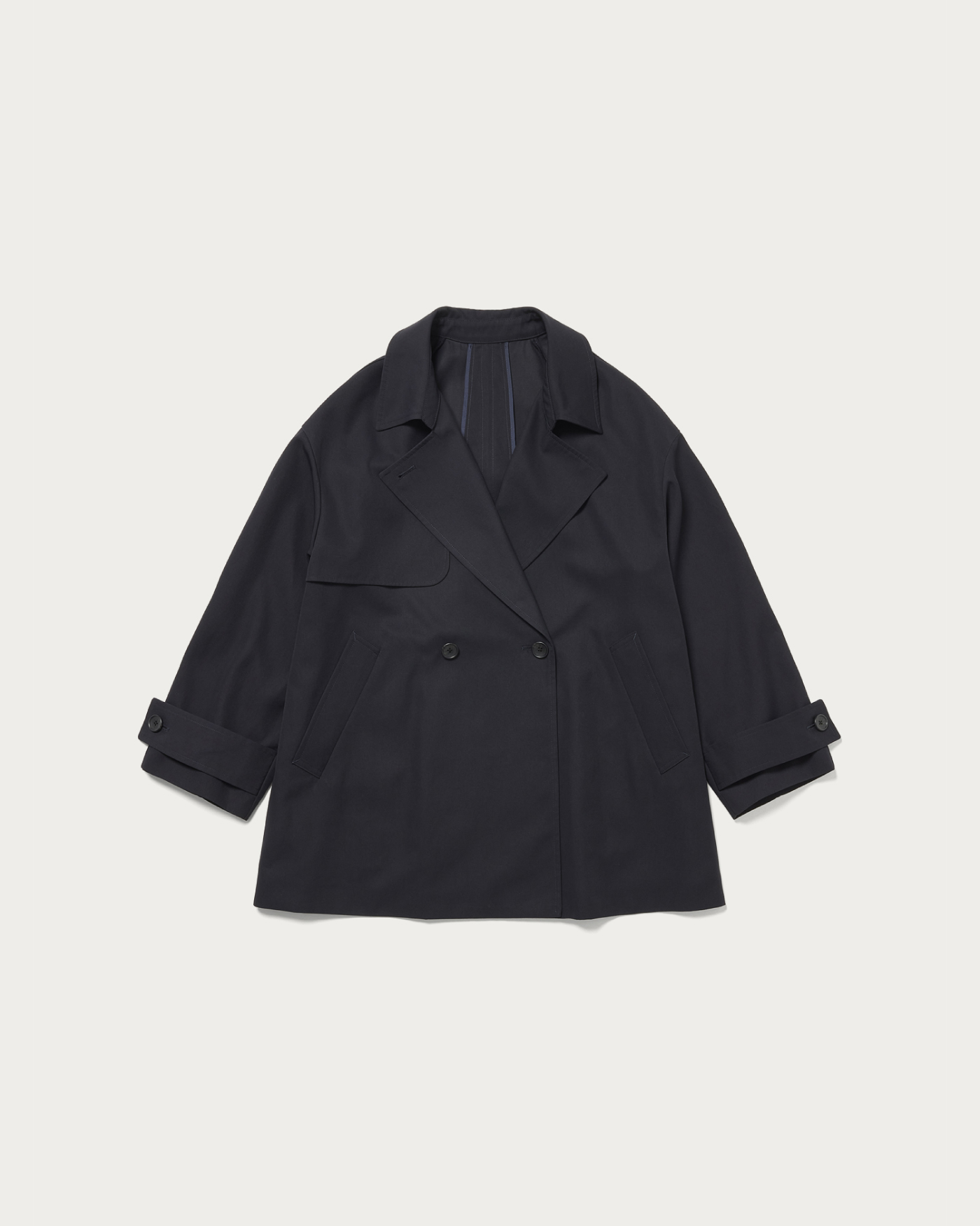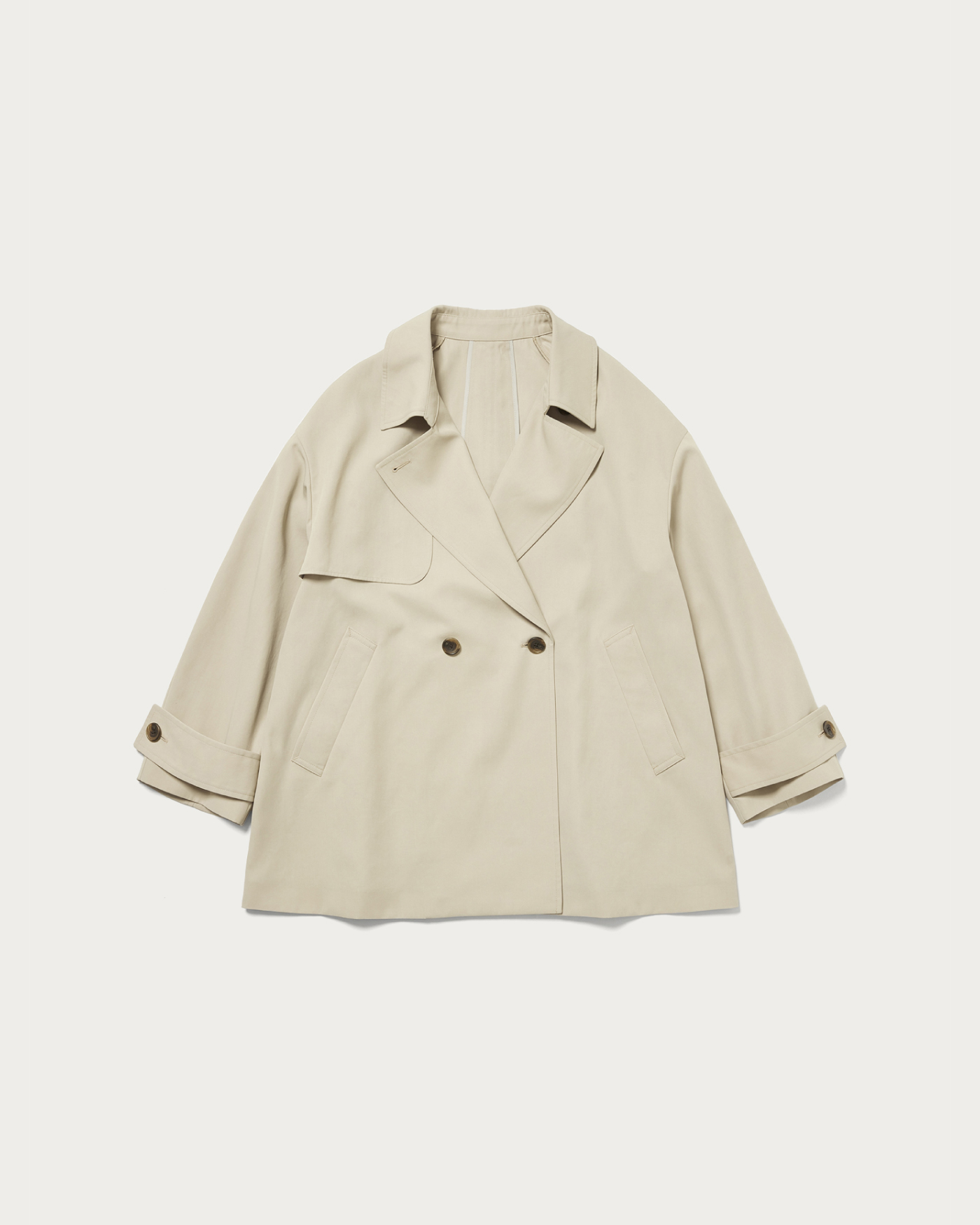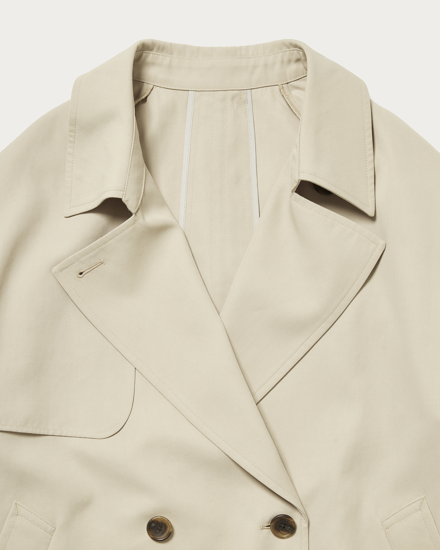 The mid-length coat, featuring a silhouette that gracefully flares towards the hem, is captivating with its trench coat details. The fabric, characterized by a moderate firmness and a dry touch, comes with the added benefit of water-repellent functionality. With a chin strap, it can also be worn as a stand-up collar, making it a trendy design.