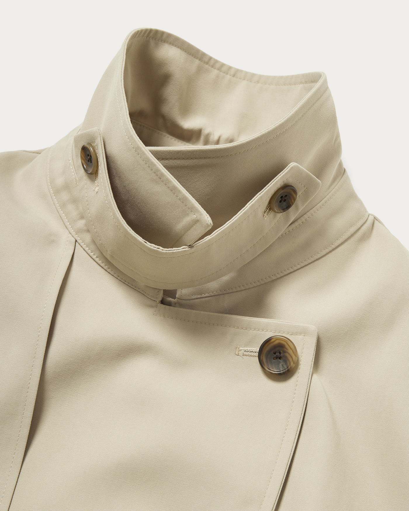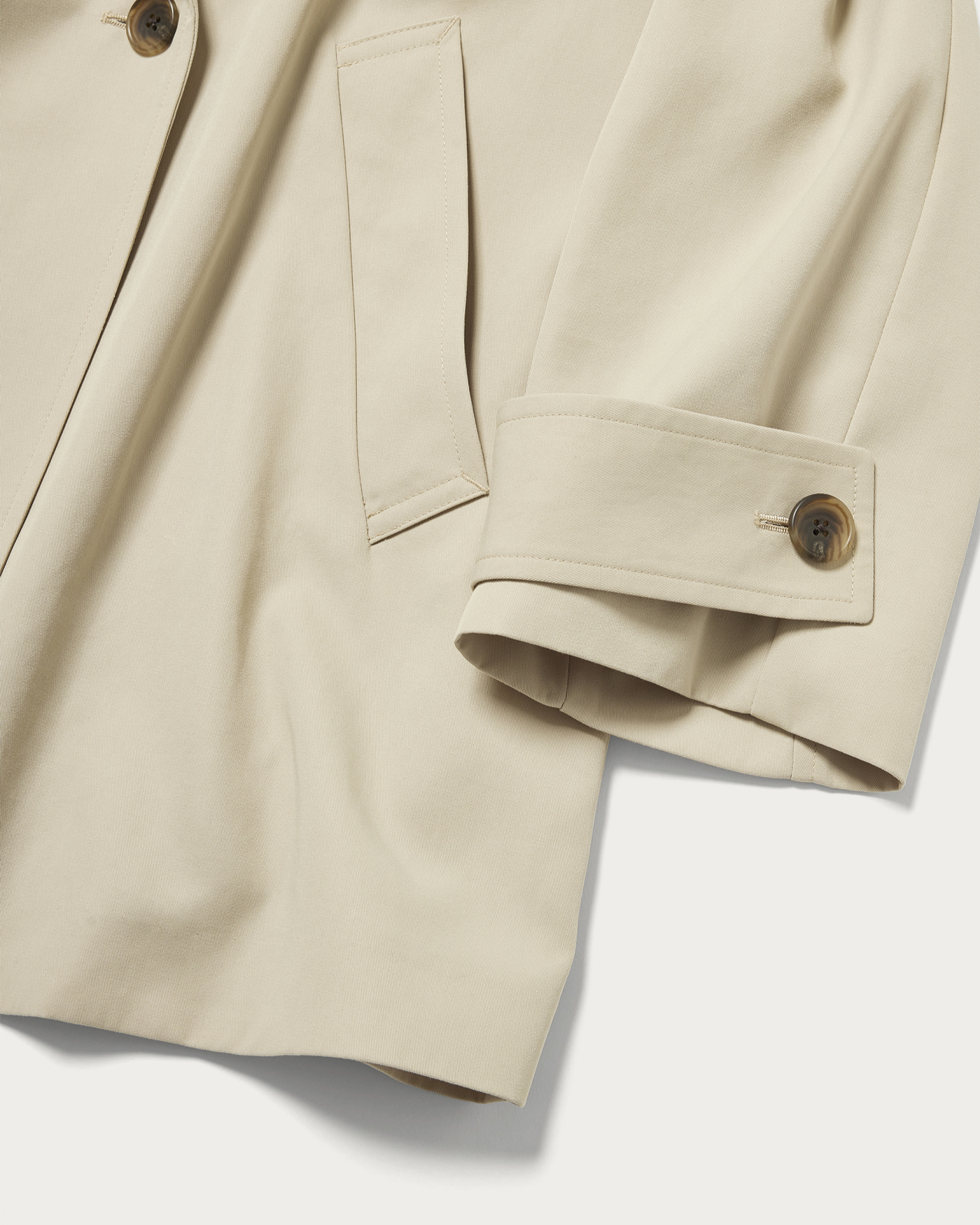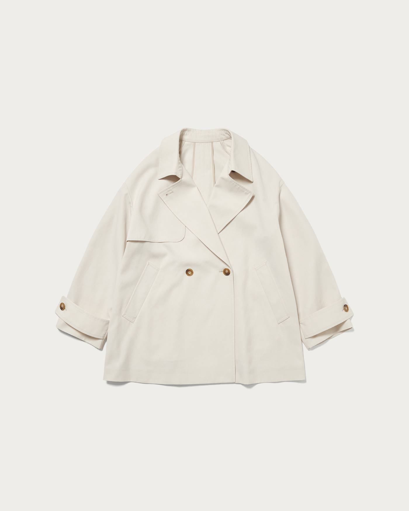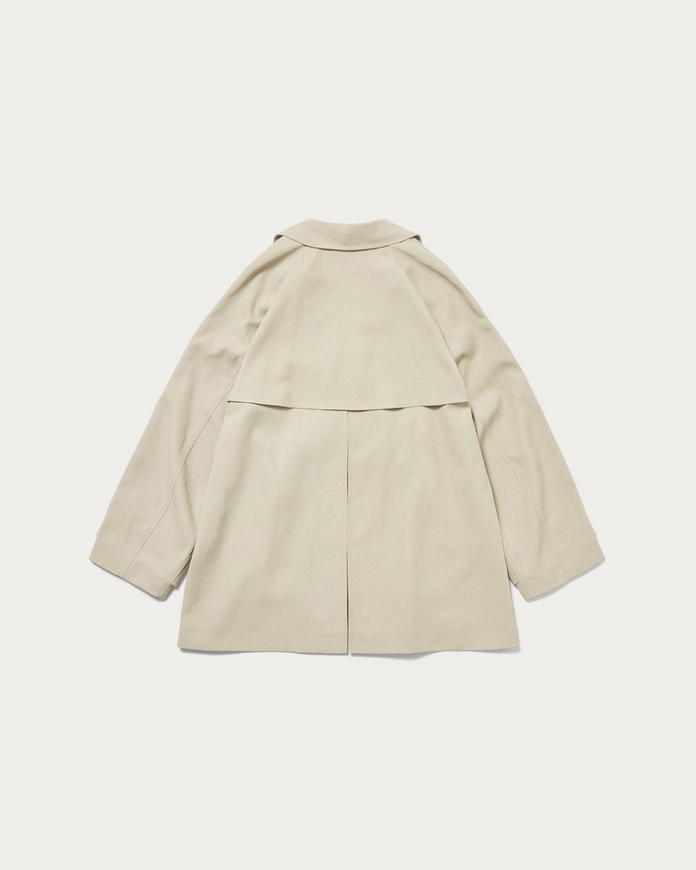 The mid-length coat, featuring a silhouette that gracefully flares towards the hem, is captivating with its trench coat details. The fabric, characterized by a moderate firmness and a dry touch, comes with the added benefit of water-repellent functionality. With a chin strap, it can also be worn as a stand-up collar, making it a trendy design.