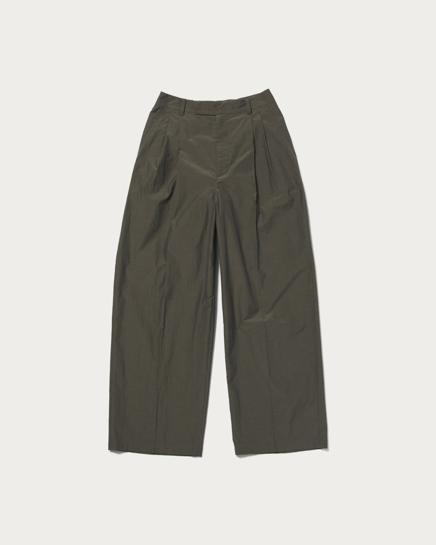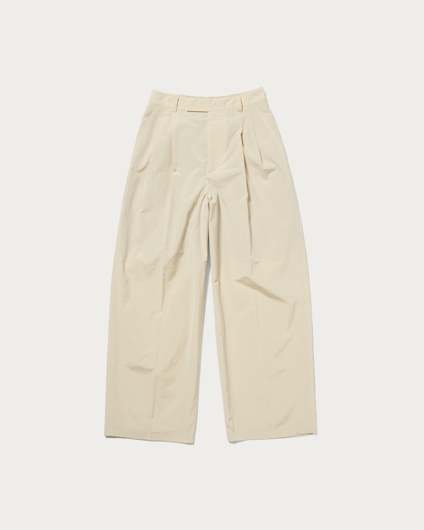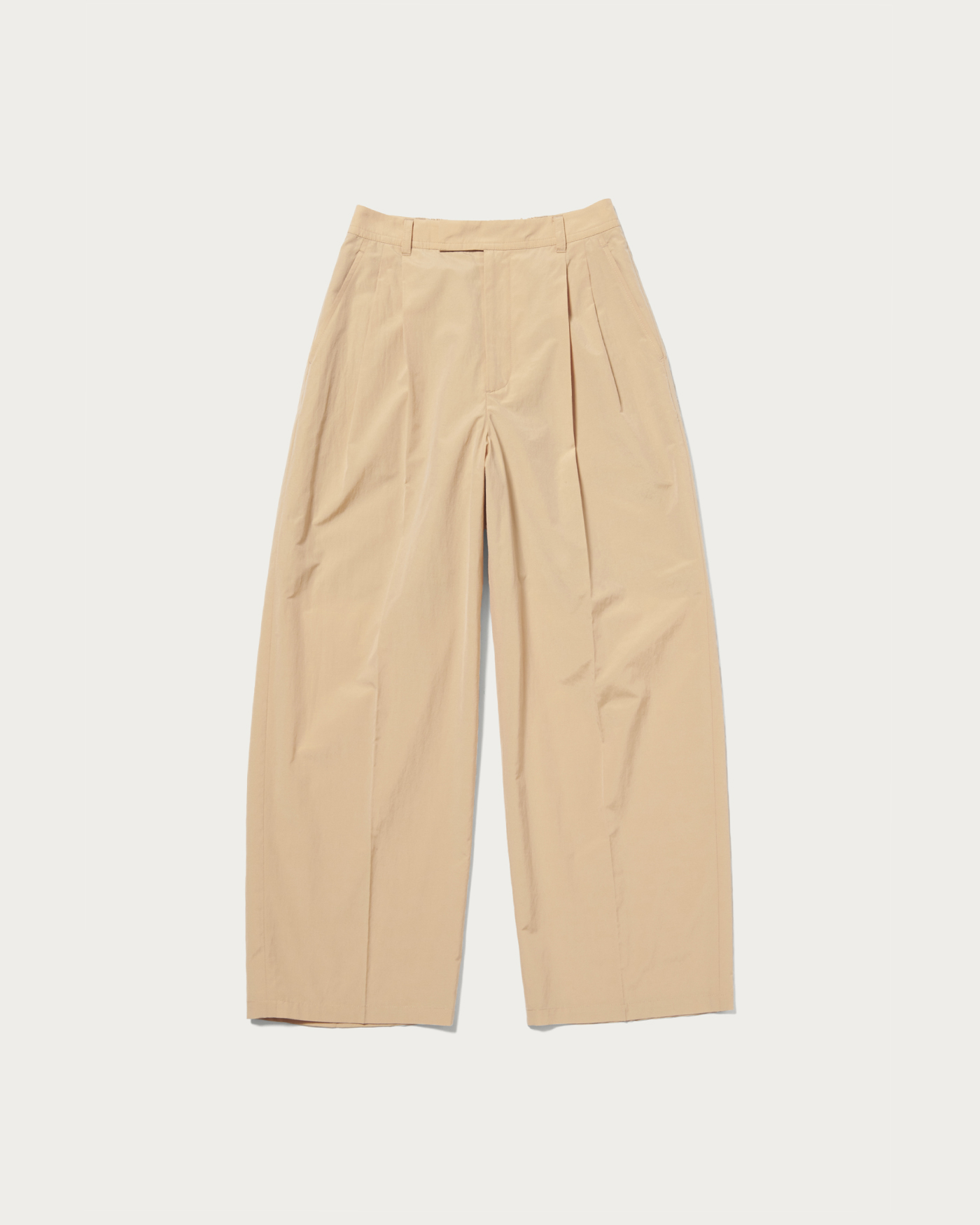 Wide pants made from cotton polyester fabric by Italy's FAbRICA. We've crafted these two-tuck pants to highlight the unique firmness of the material, giving them a distinct shape. The tucks are designed in a way that prevents excessive volume, making this piece stand out on its own. We also recommend styling it as a set with other items made from the same material.