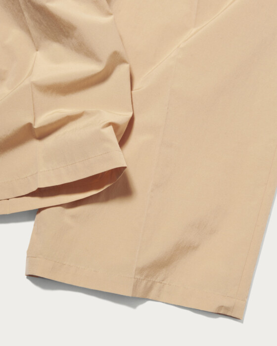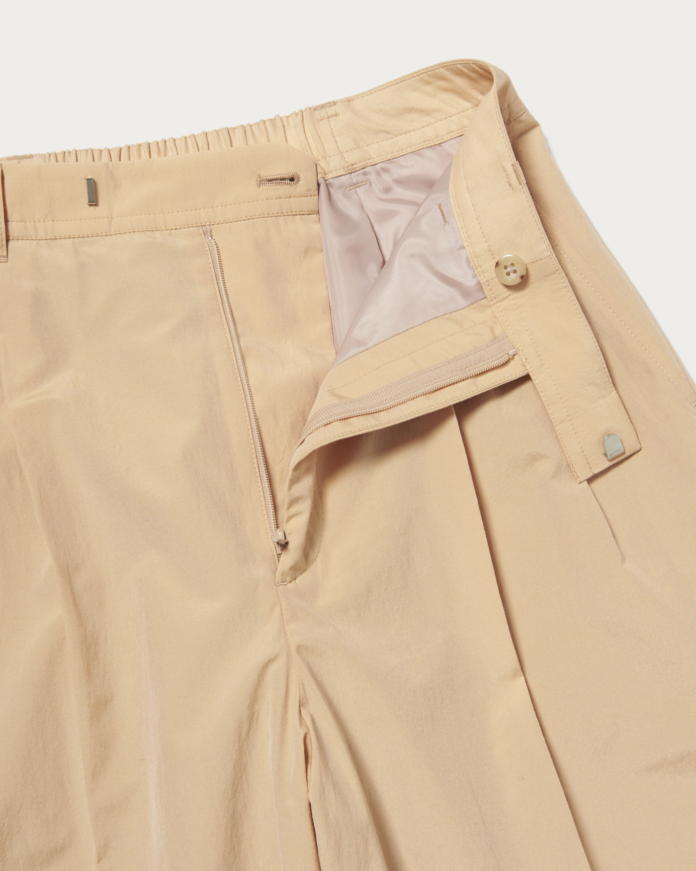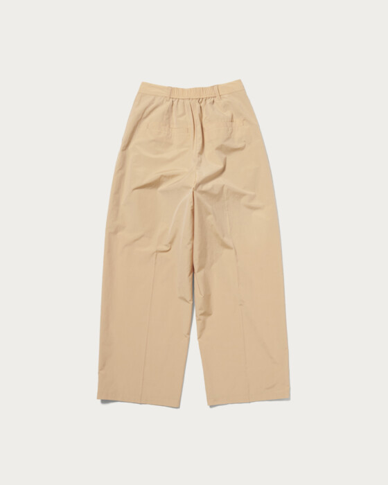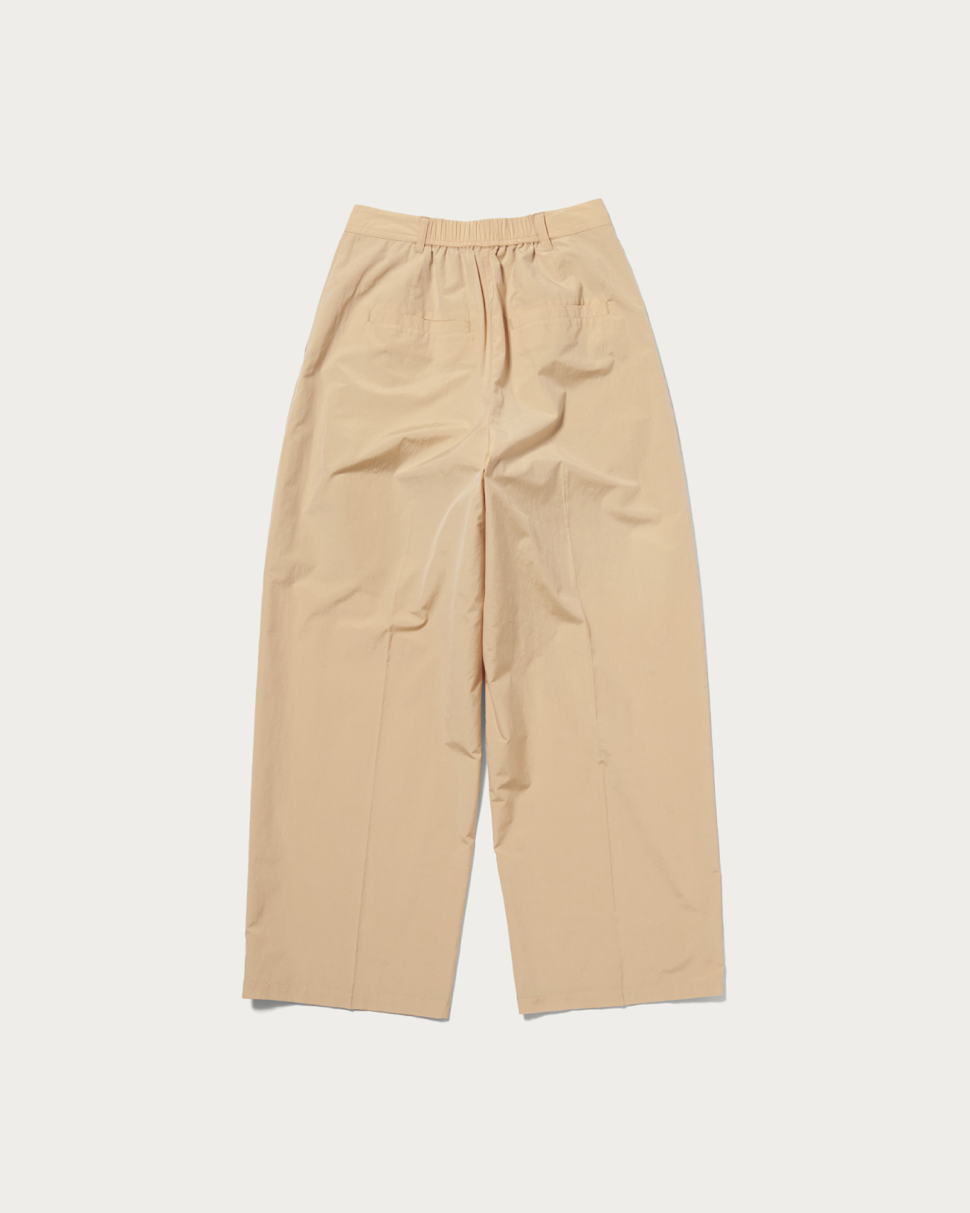 Wide pants made from cotton polyester fabric by Italy's FAbRICA. We've crafted these two-tuck pants to highlight the unique firmness of the material, giving them a distinct shape. The tucks are designed in a way that prevents excessive volume, making this piece stand out on its own. We also recommend styling it as a set with other items made from the same material.