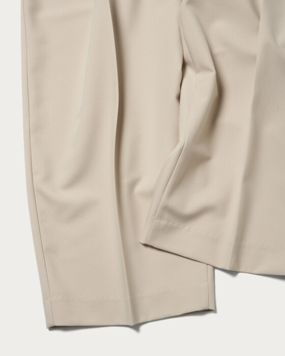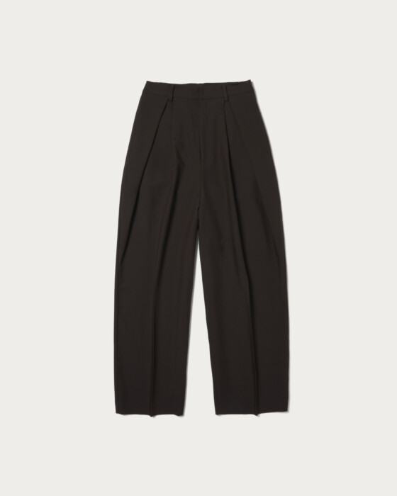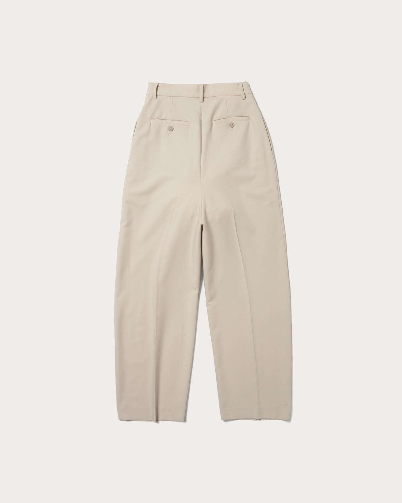 These pants feature a barrel silhouette and are made from a fabric with a drapey, glossy finish. They can be worn as a set with a 2-way blouse. The waist area includes pleats for a relaxed fit, and the hem is adjusted to a moderate slimness, making the barrel silhouette easy to wear.