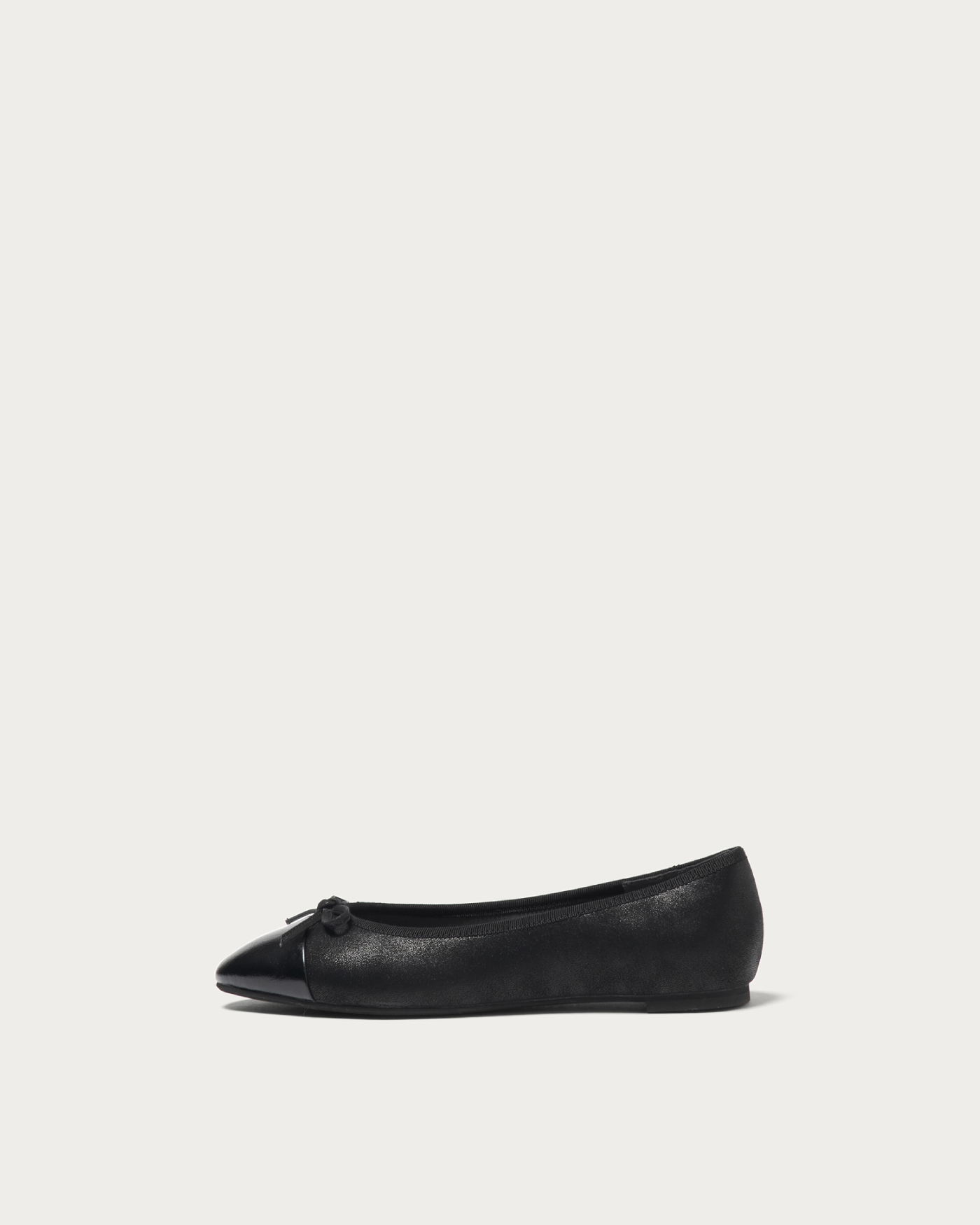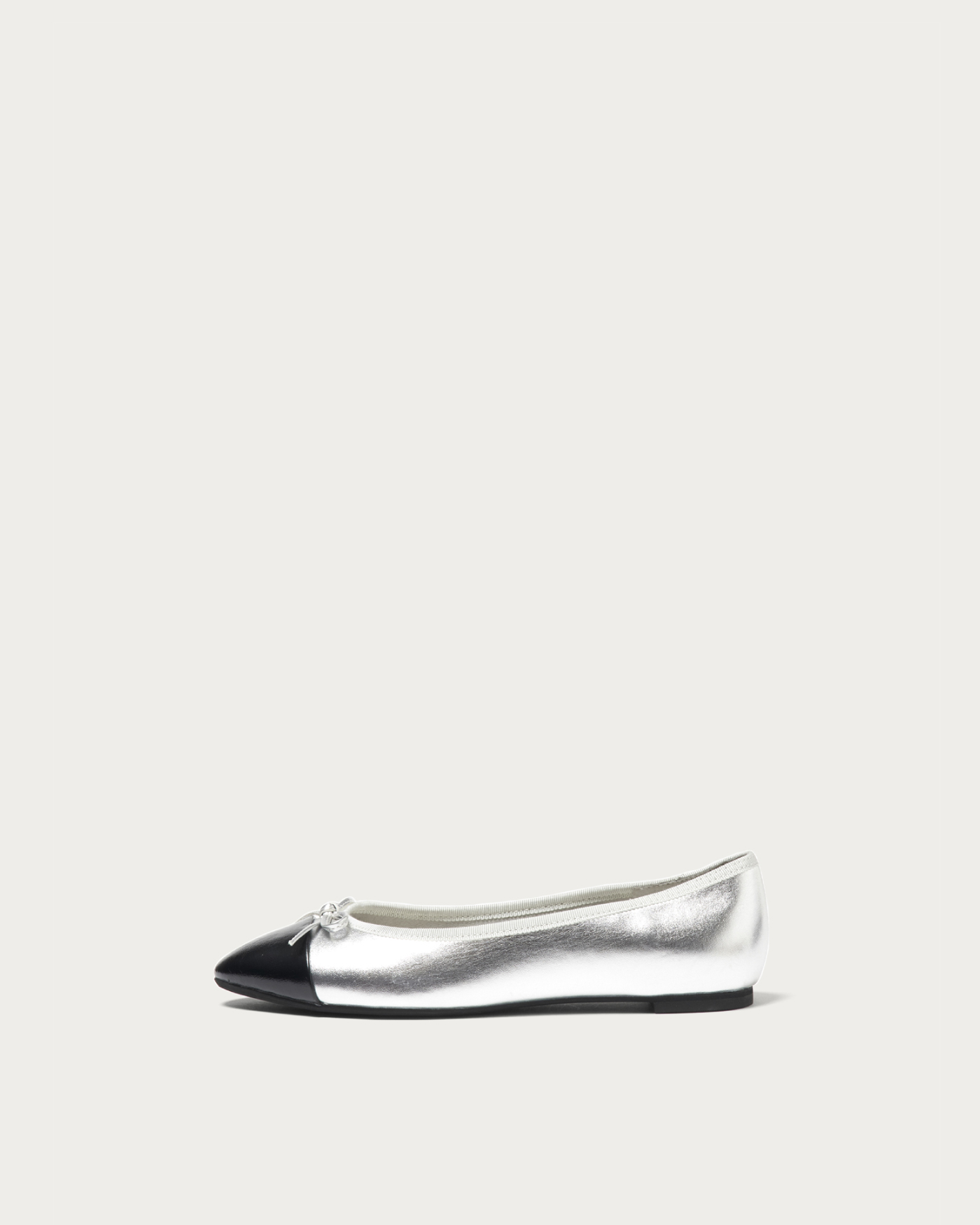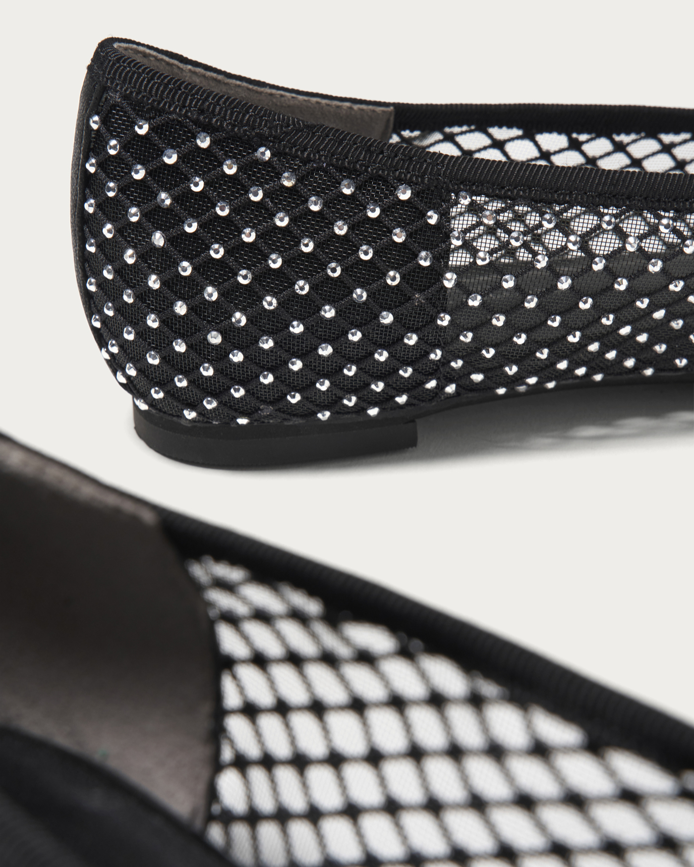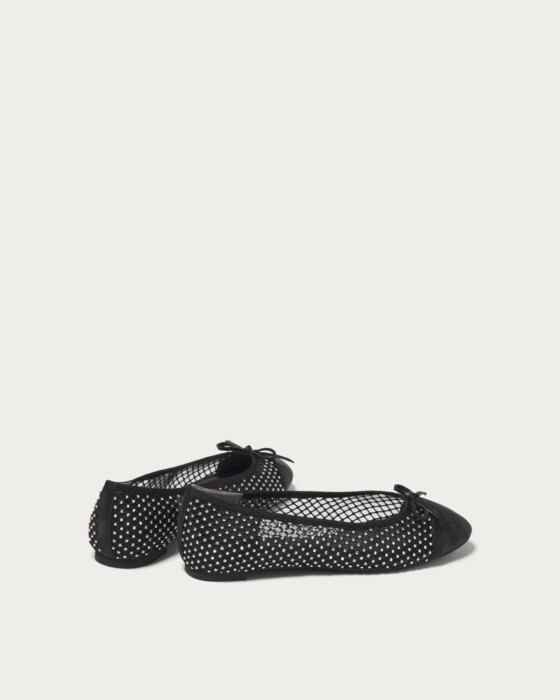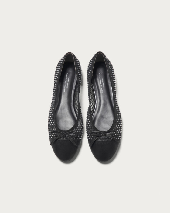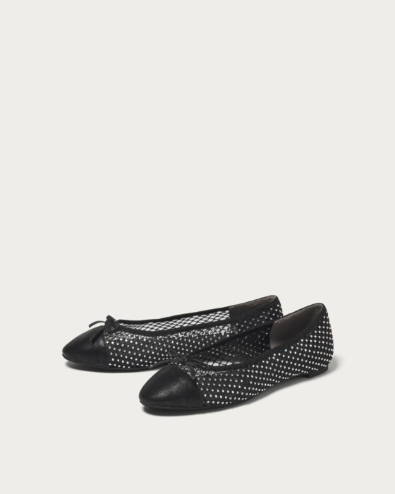 Introducing a new addition to our classic and popular ballet shoes, now available in spring materials. The toe cap is designed to be soft, while the heel area provides a secure and comfortable fit. We've used subtly textured materials that catch the light, net tulle adorned with rhinestones, and a silver and black toe, all offering a touch of sparkle within a neutral palette, perfect for the spring season.