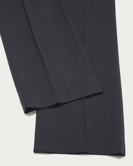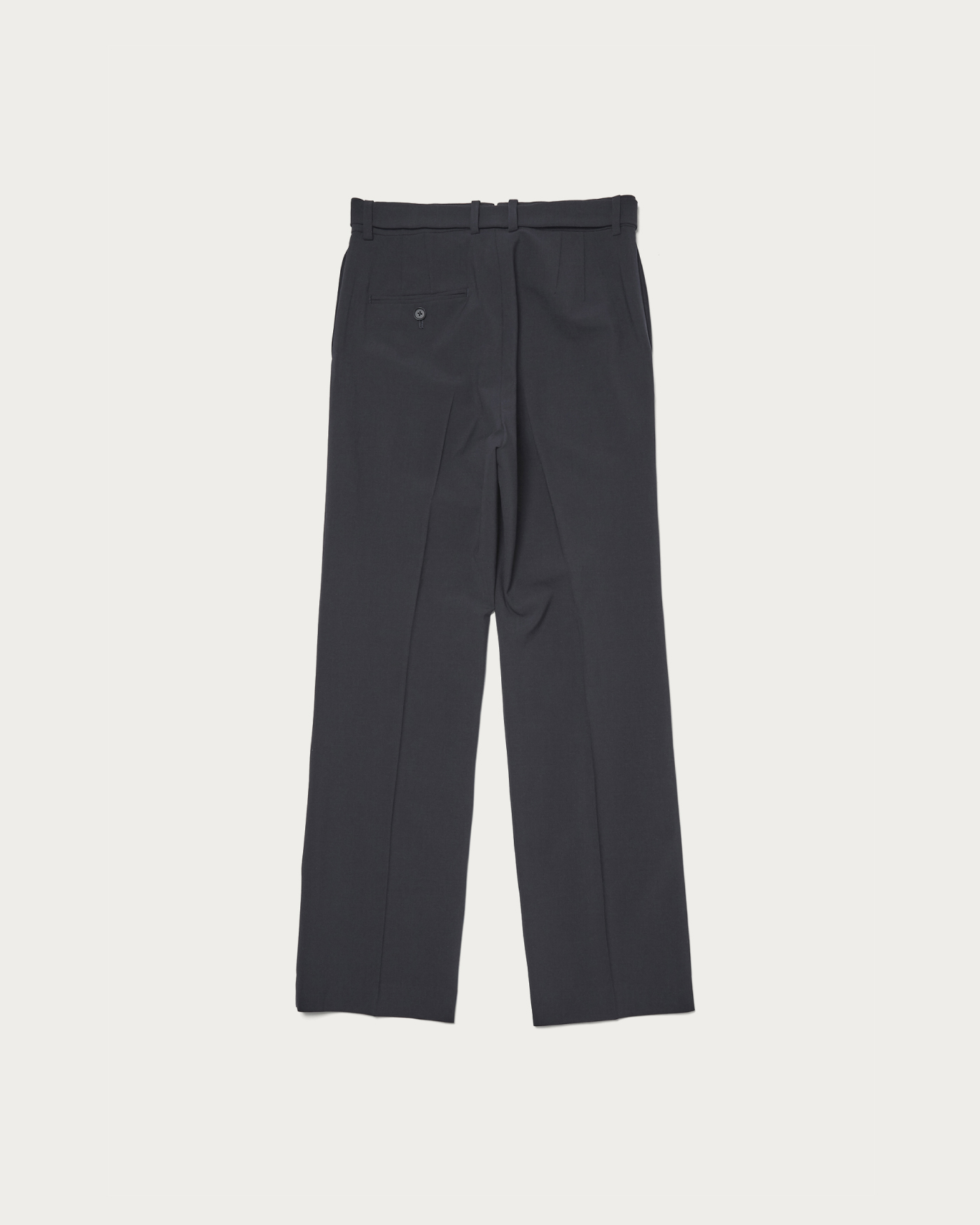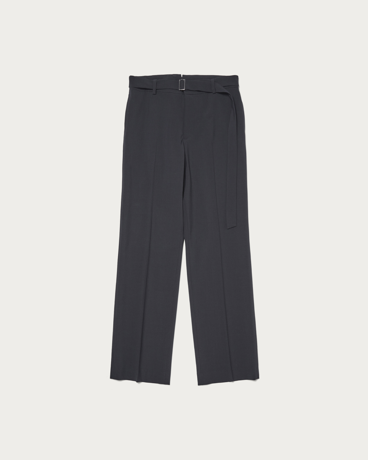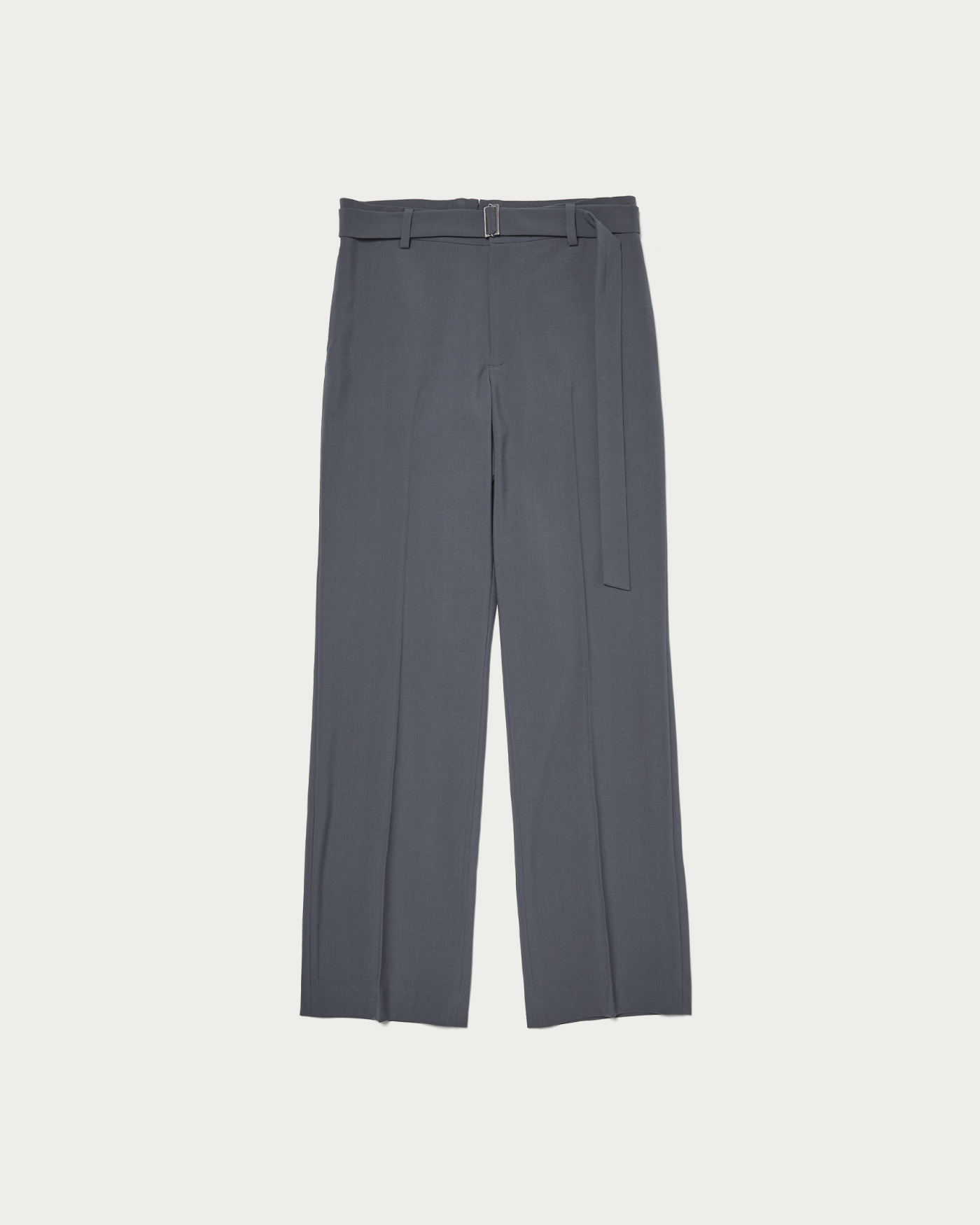 A sleek straight silhouette trouser. It features a low waist with a matching fabric belt as an accent. Made from a stretchy blend of polyester and wool, the fabric has a dry-touch texture, offering both resilience and softness.