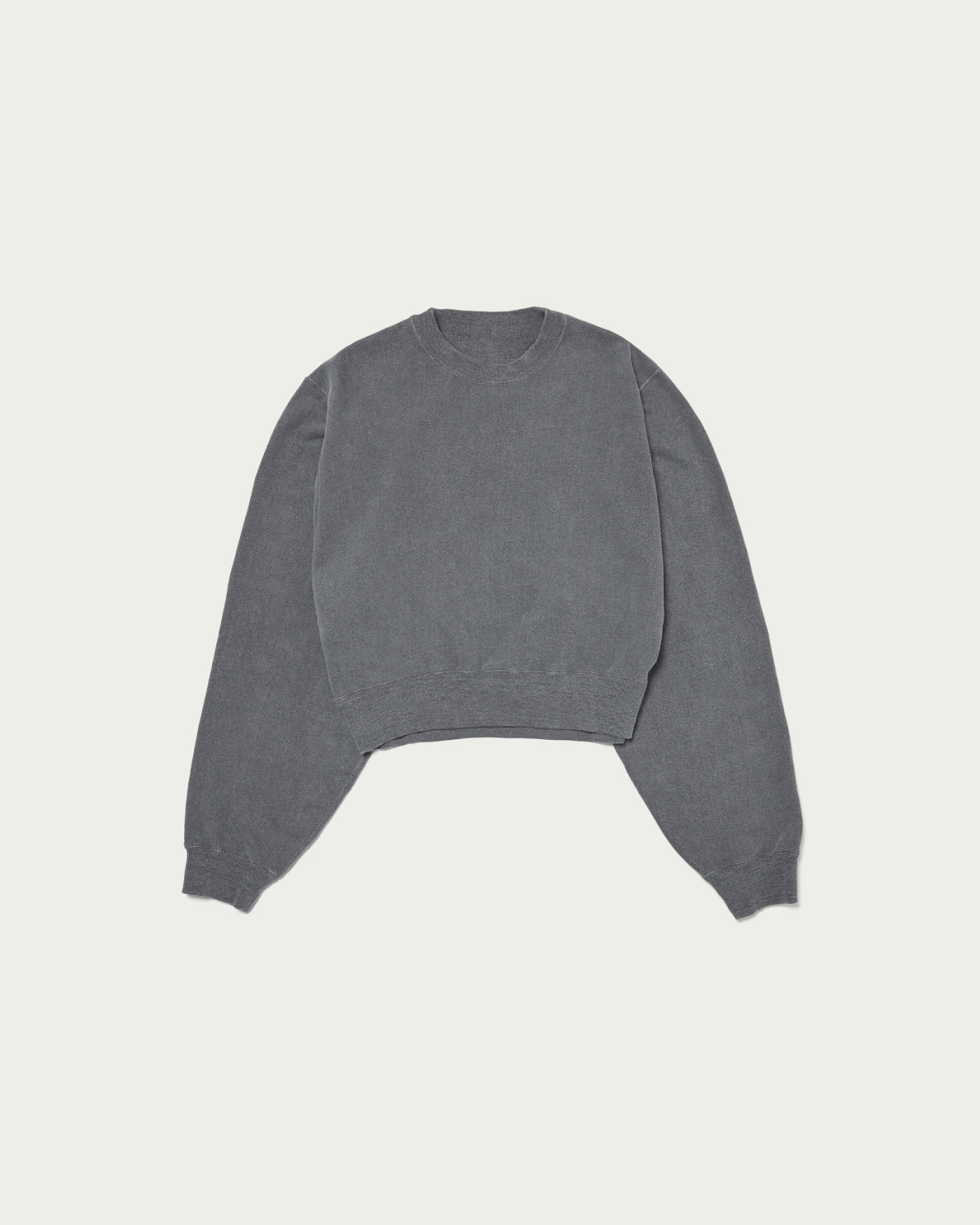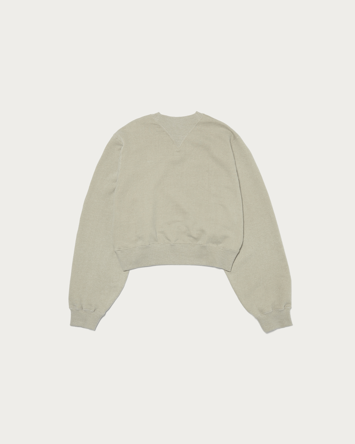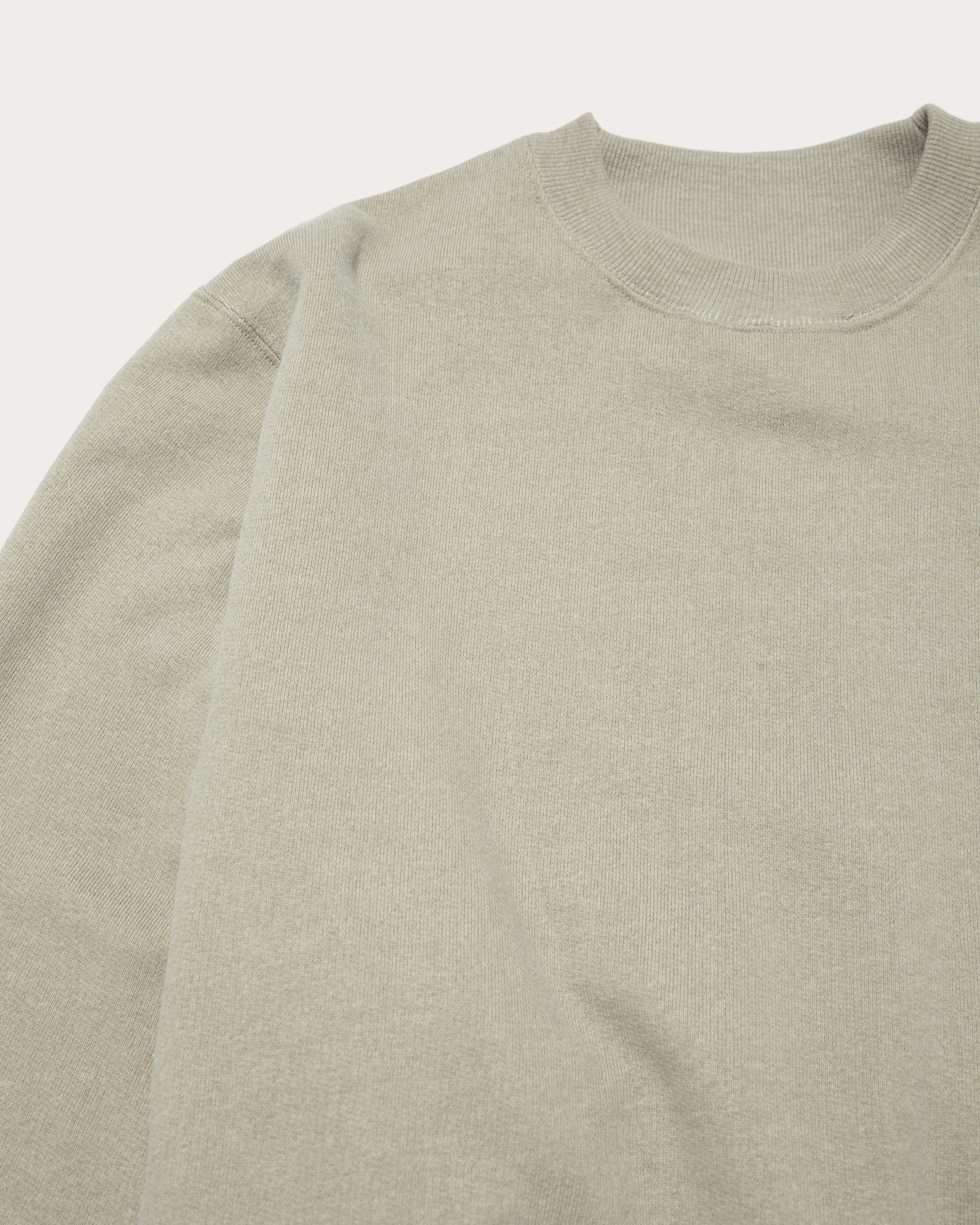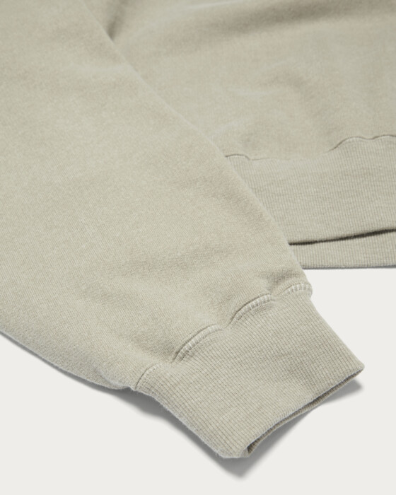 A sweat pullover with a vintage-inspired look that captivates. It features pigment dye prints on both sides and uses a fleece fabric that has been repeatedly washed to achieve a faded effect. The pullover is characterized by a clean, short length and a wide silhouette that exudes a relaxed vibe, offering a balanced and gentle body proportion. The hemline dips lower at the back, and the large gusset at the back neck adds a touch of nuance to its simple design.