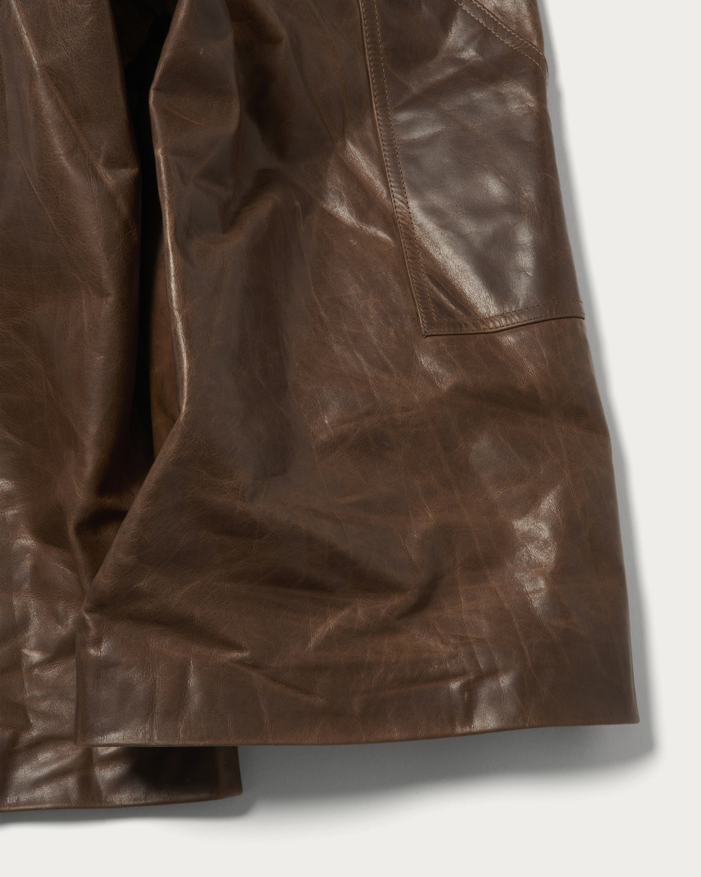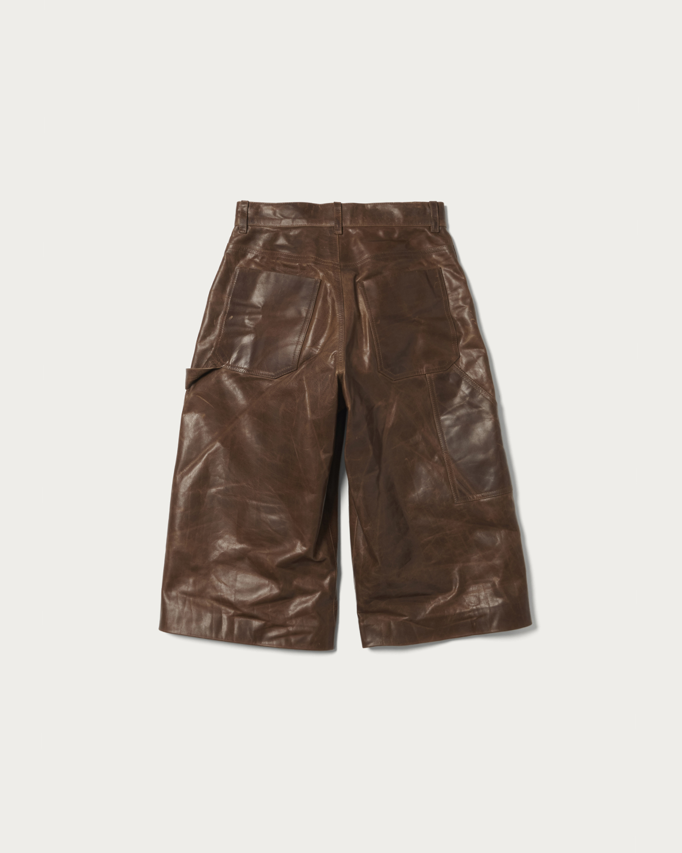 Leather culottes with painterly details. The combination of a sturdy width and below-the-knee length creates a fresh silhouette. The material is cow leather with a vintage finish, featuring a glossy surface and a nuanced color tone.