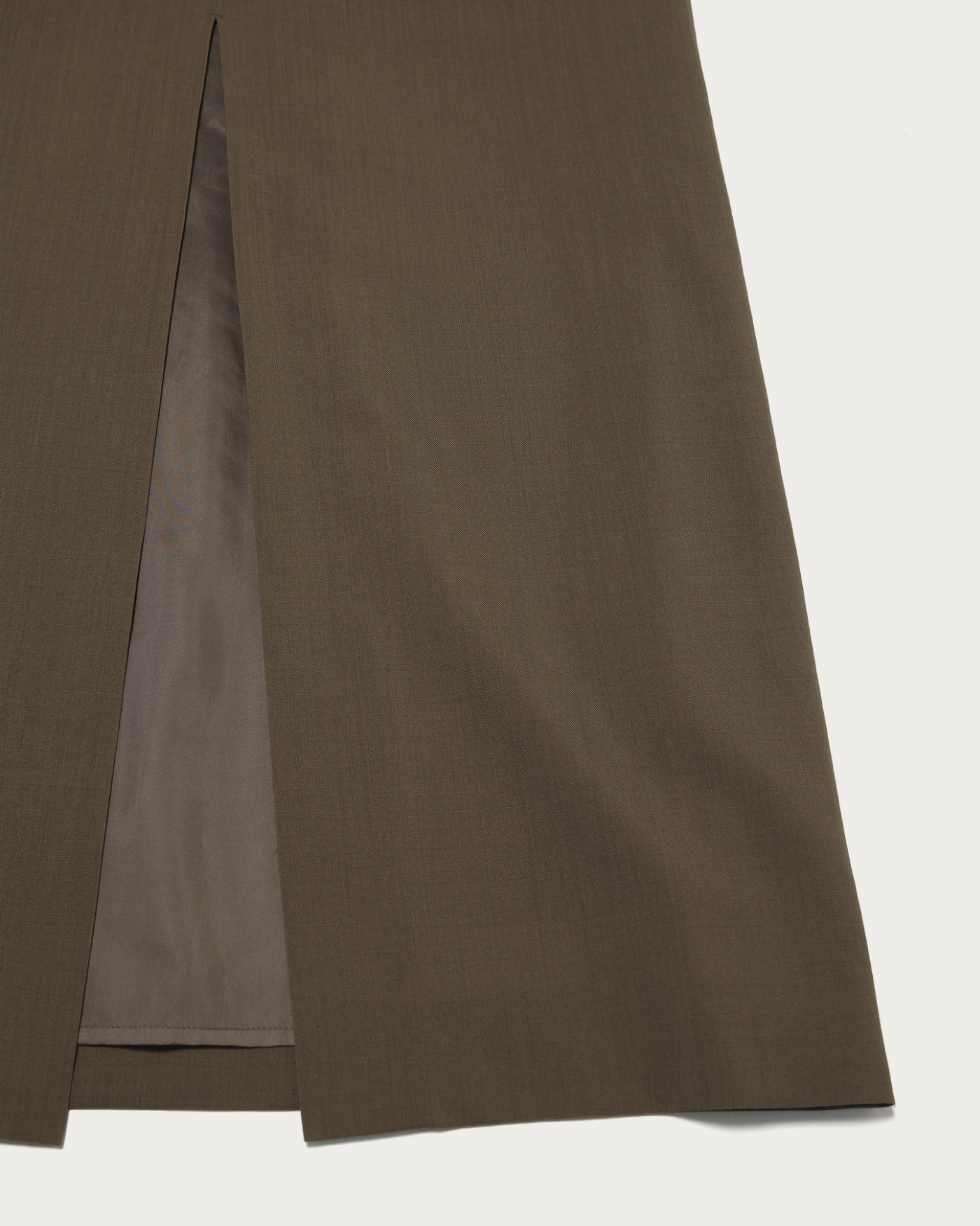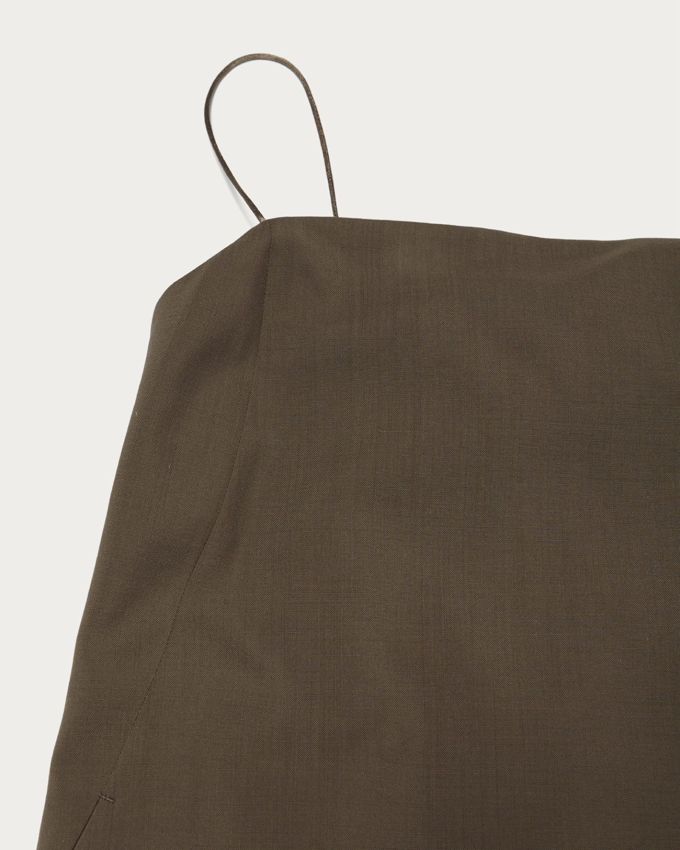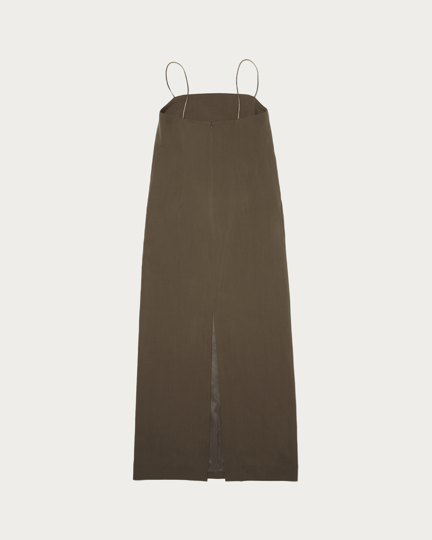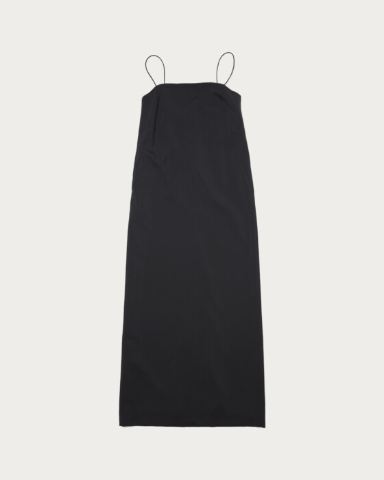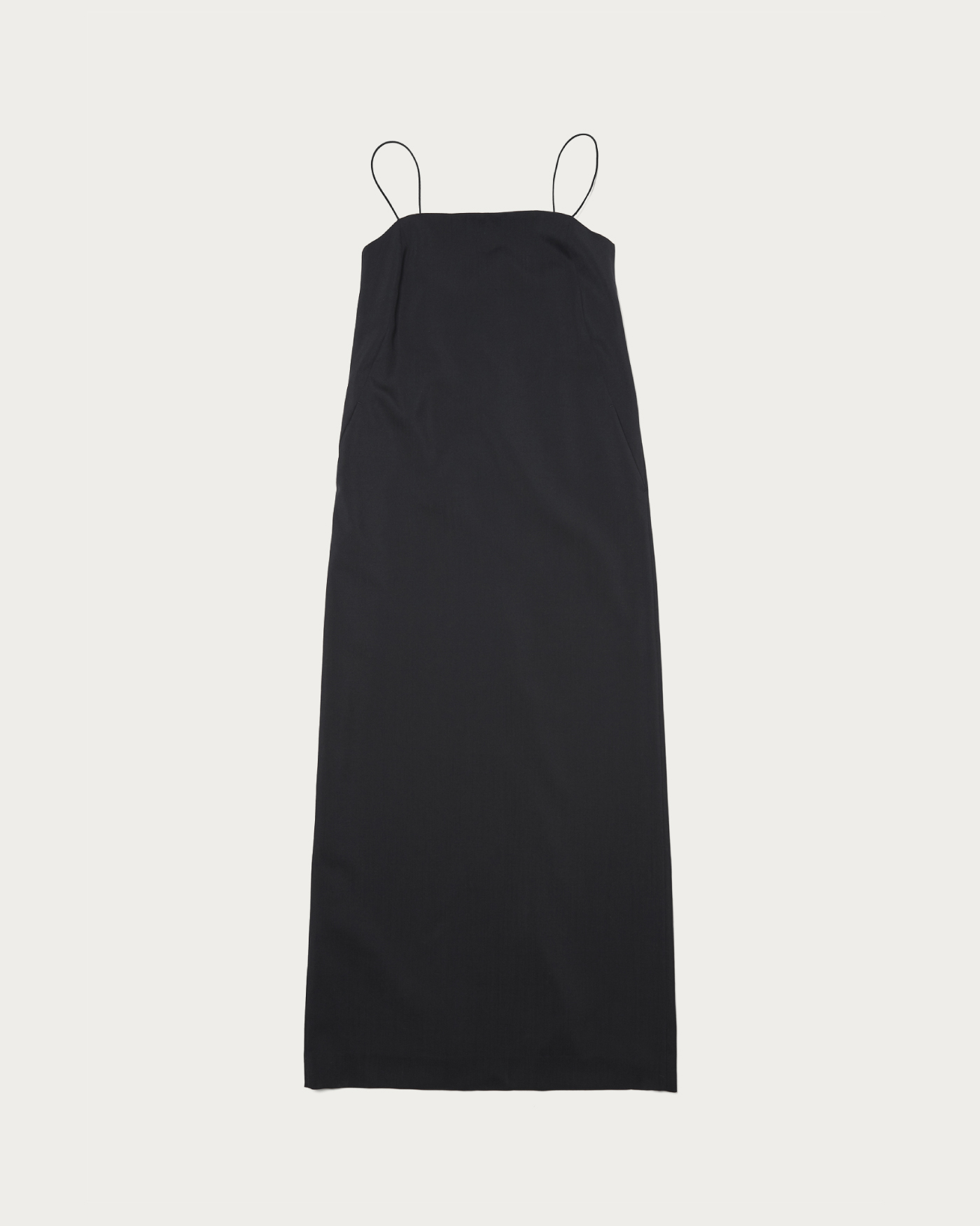 A satin-like thin shoulder strap and a gently curved neckline give this camisole dress a simple yet moody feel. It is made from 100% wool "toro" fabric that has been treated with an impregnation process to add a sense of firmness.