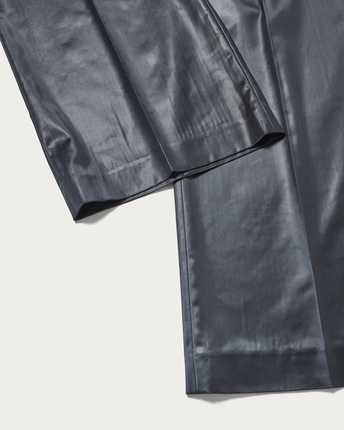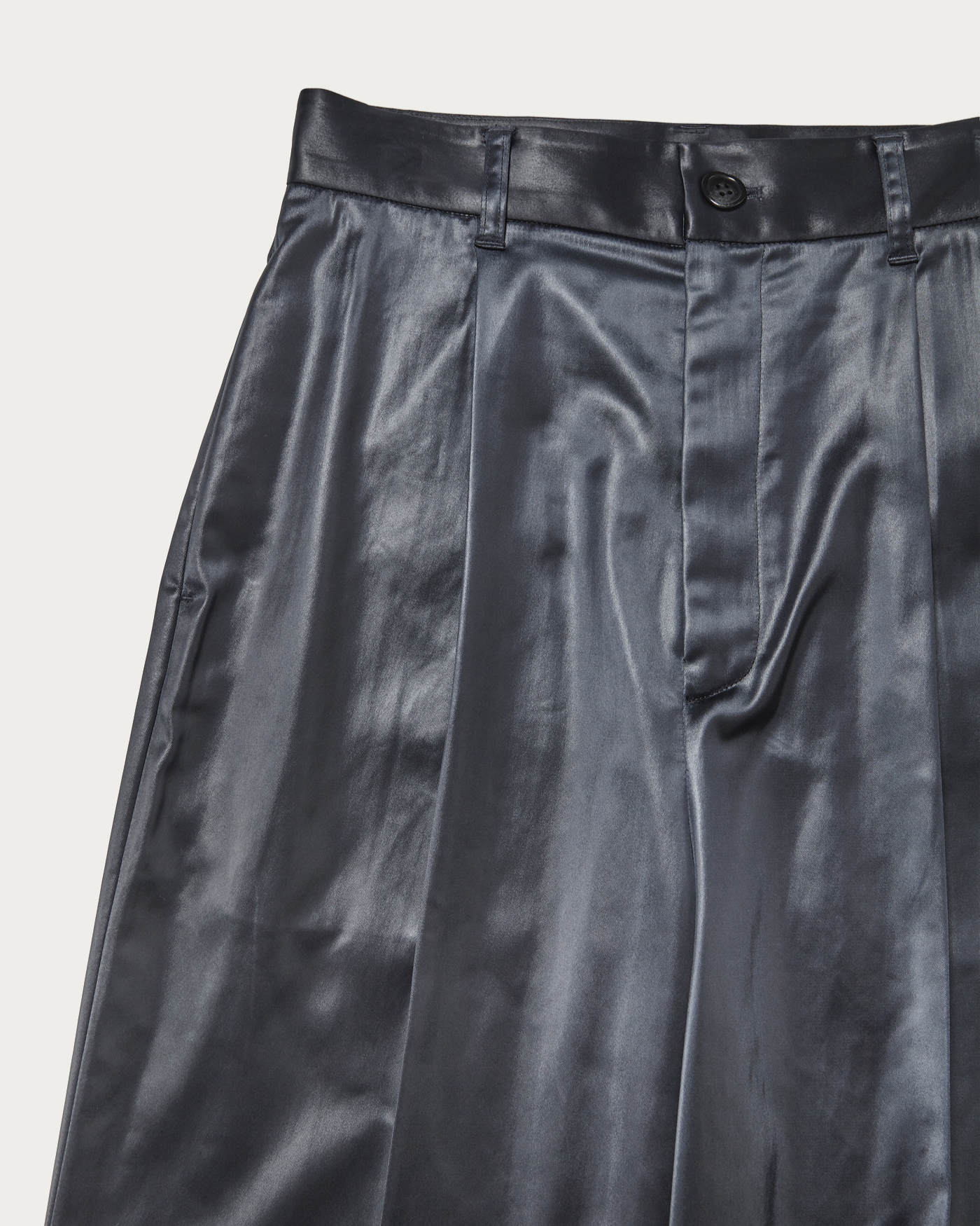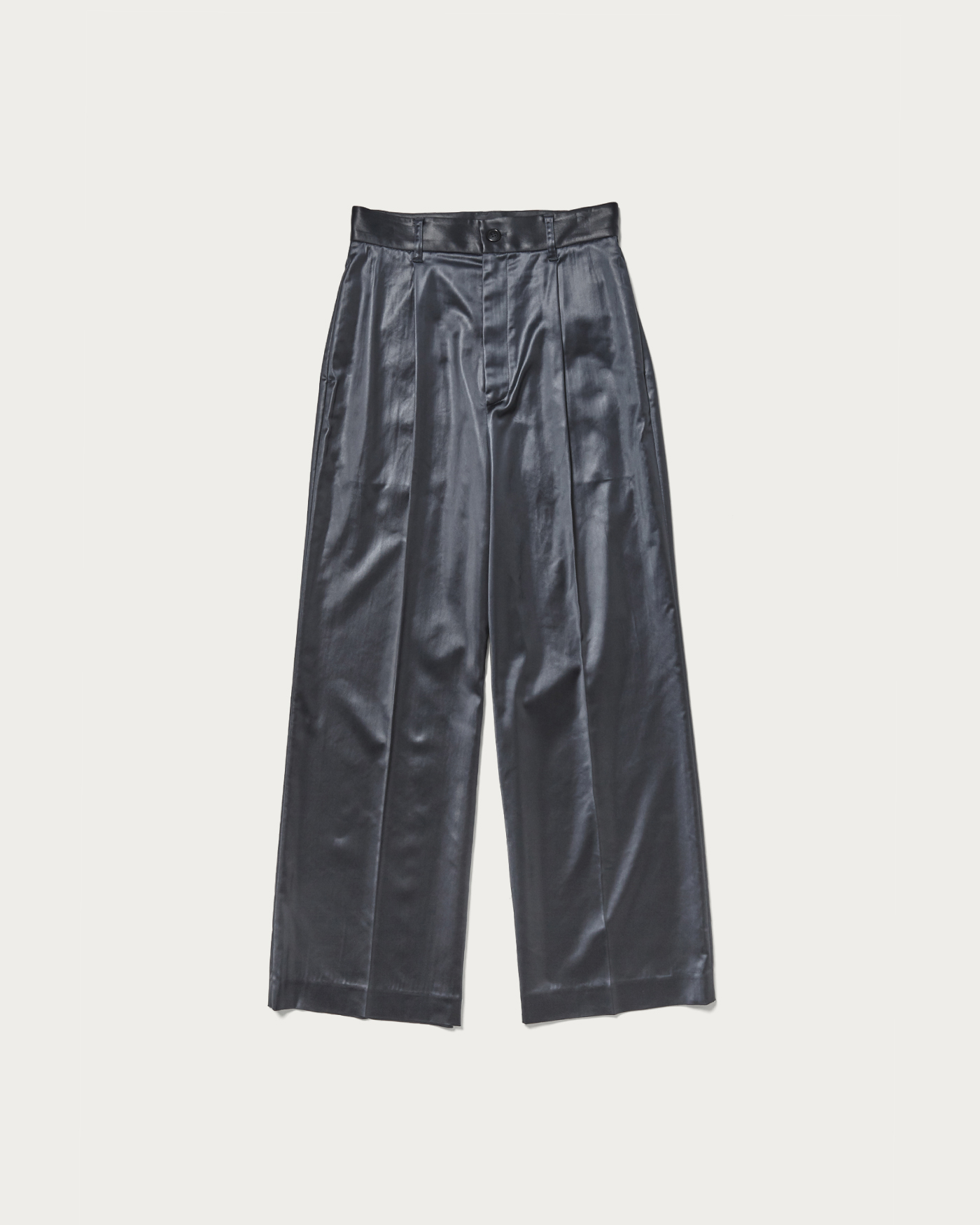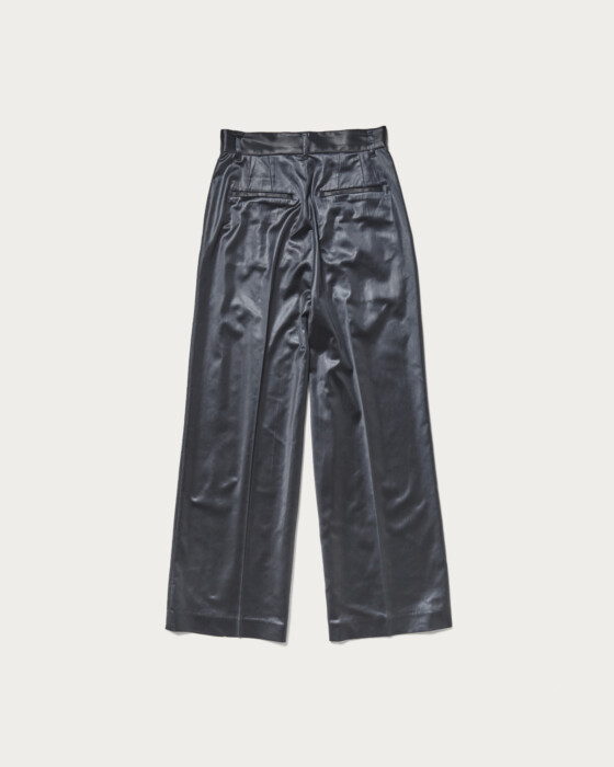 Straight pants crafted from glossy satin material. Featuring a single tuck, they offer a comfortable fit without being too wide, creating a sleek silhouette. With a simple design and leather-like texture, these pants are a standout piece that can easily become the centerpiece of any outfit.