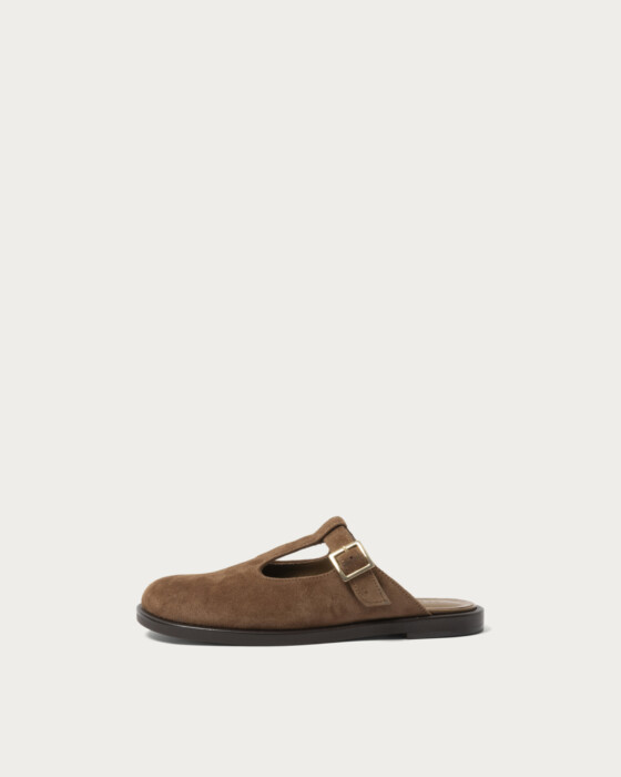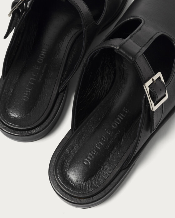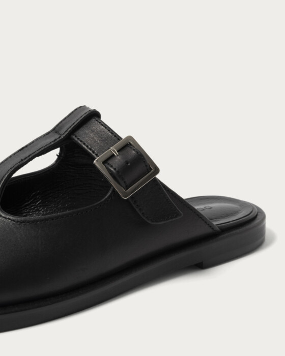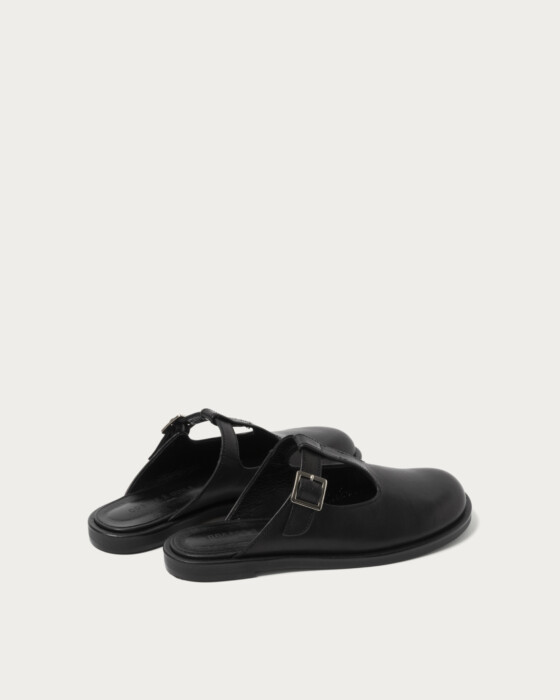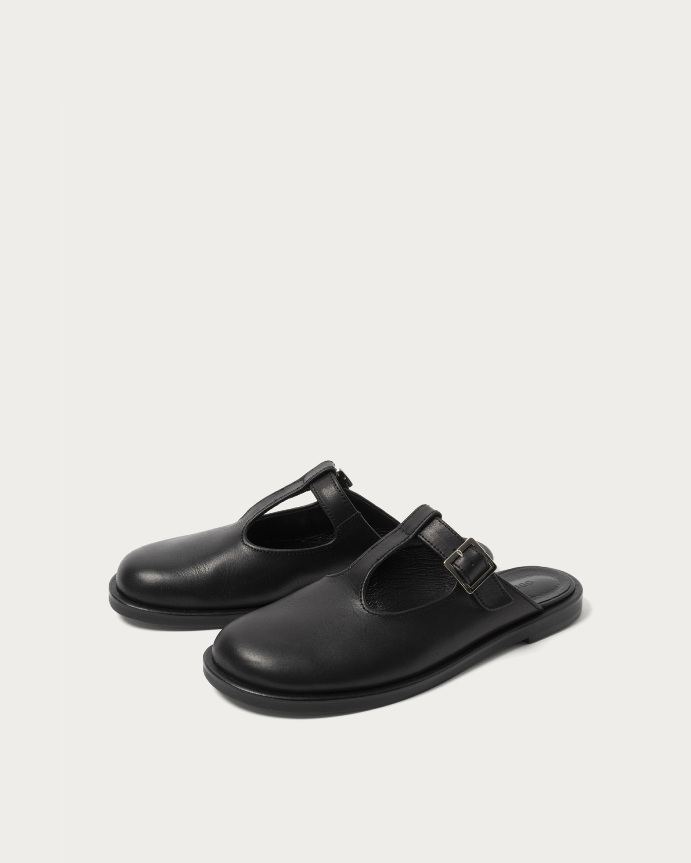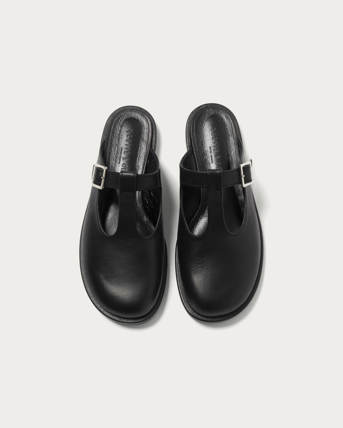 A T-strap mule that combines a casual vibe with a strong presence. The voluminous oblique toe adds a sophisticated touch, while the elastic strap and thick sole ensure comfort and ease of walking. These shoes can be slipped on effortlessly, adding a relaxed, mature mood to wide pants or a mannish style.