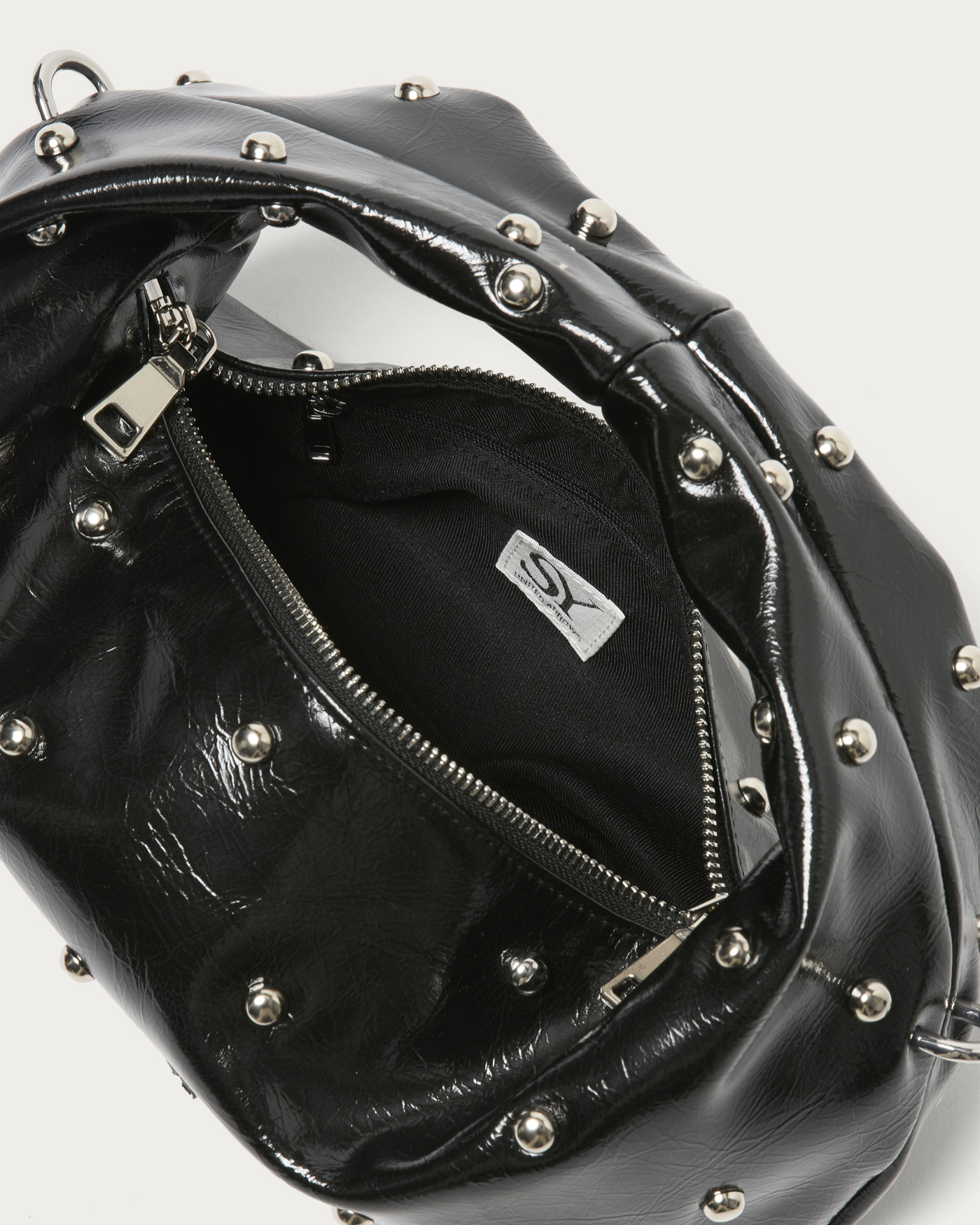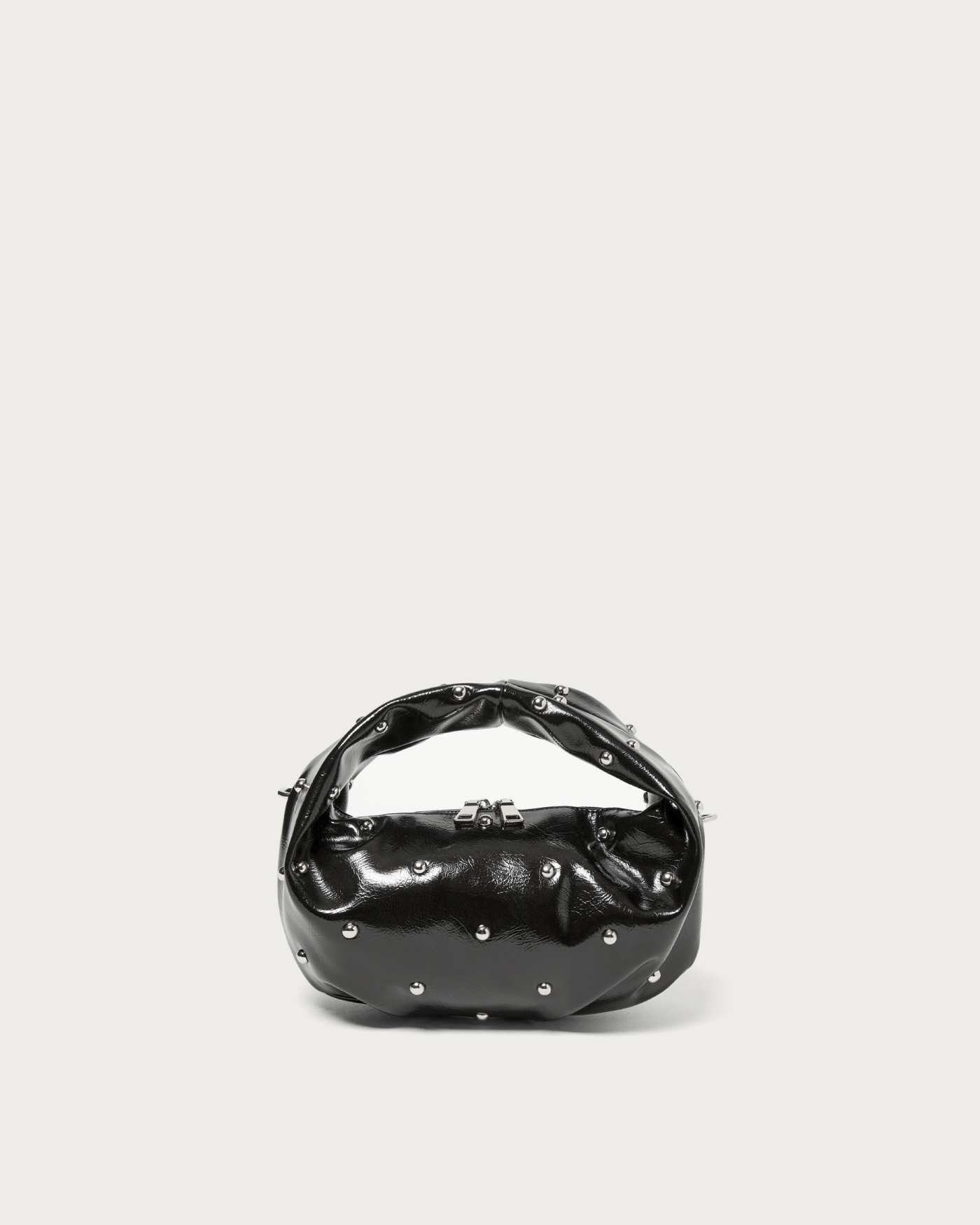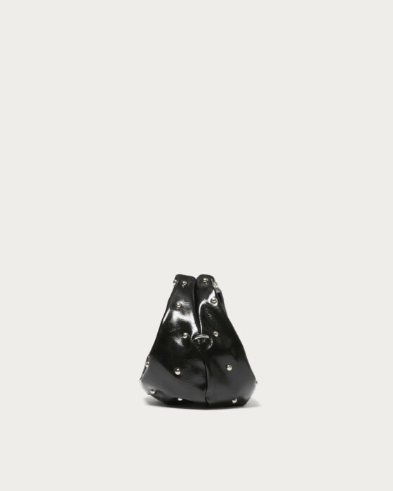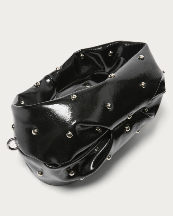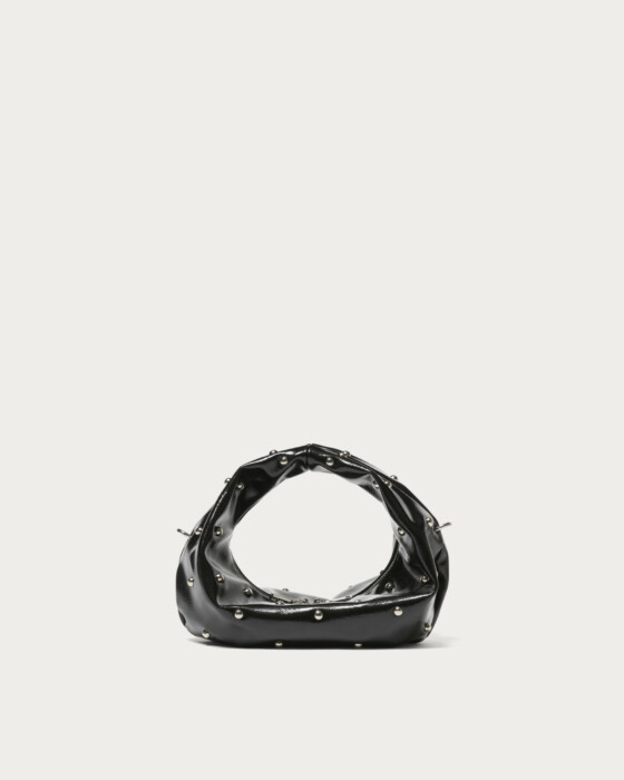The hobo bag, with its charmingly rounded form, is truly adorable. Despite its compact size, it boasts a design with a strong presence, featuring hemispherical studs scattered across its glossy body that emit an edgy shine. Simply adding it to a simple outfit, like monochrome or denim, instantly provides a fashionable accent.