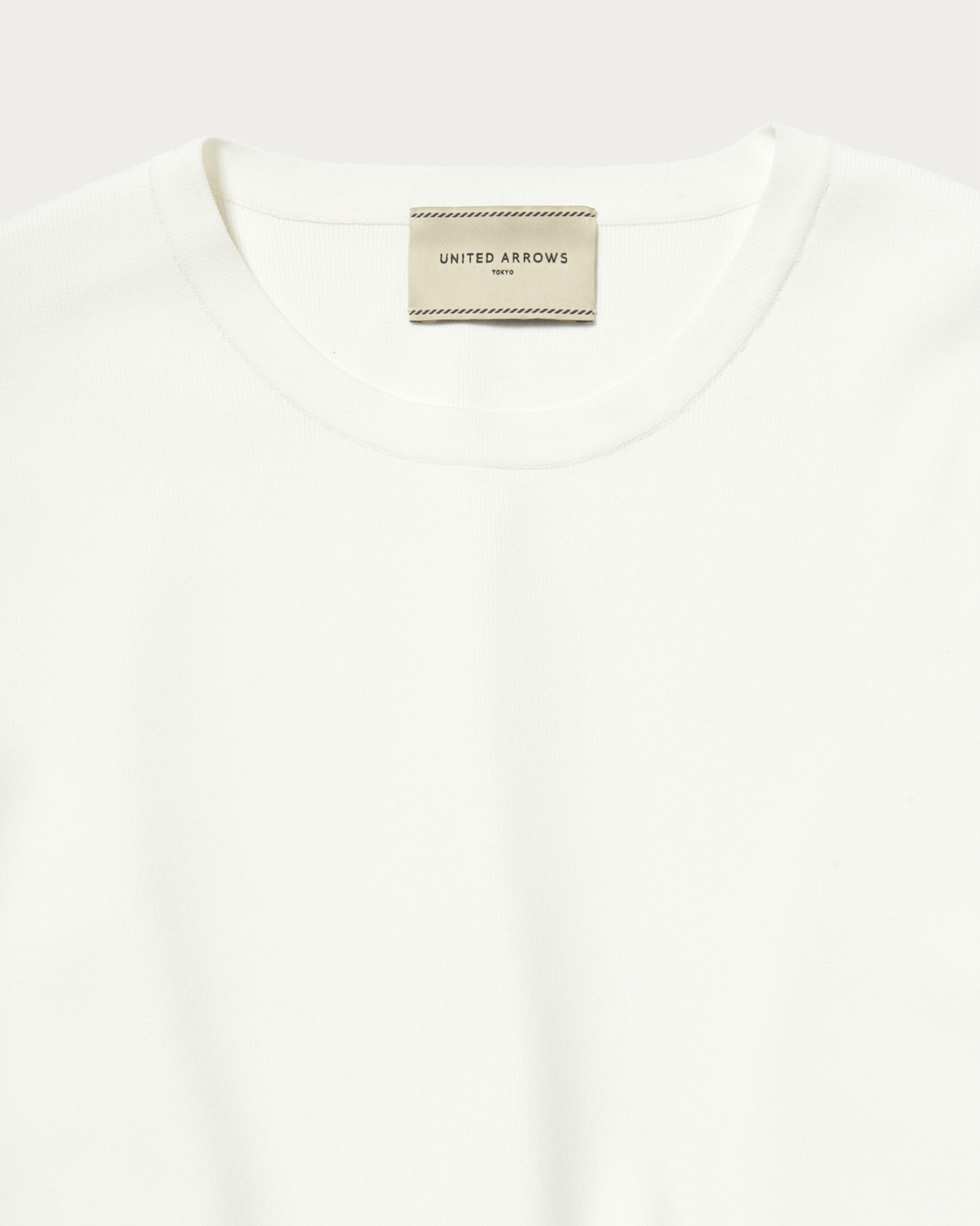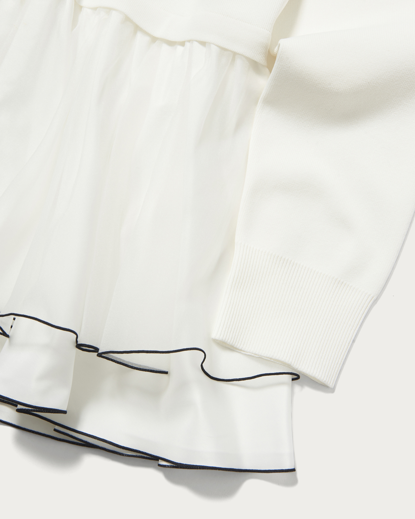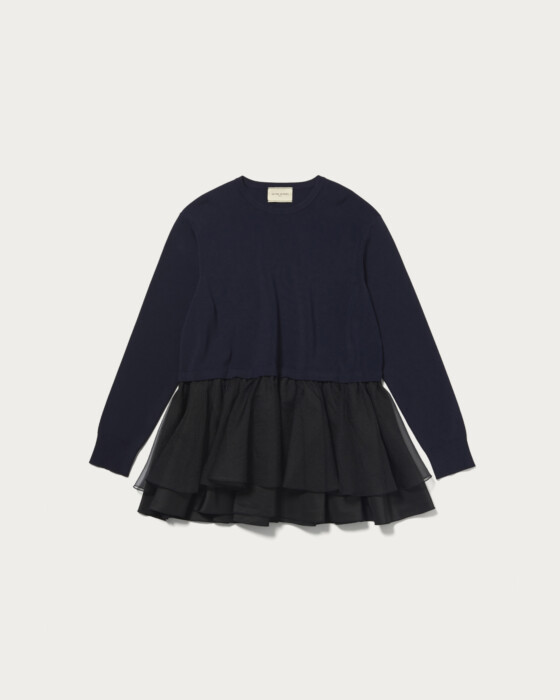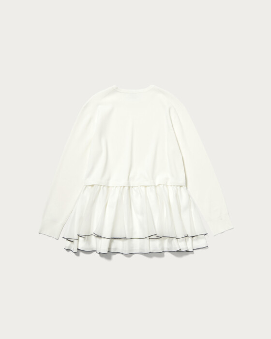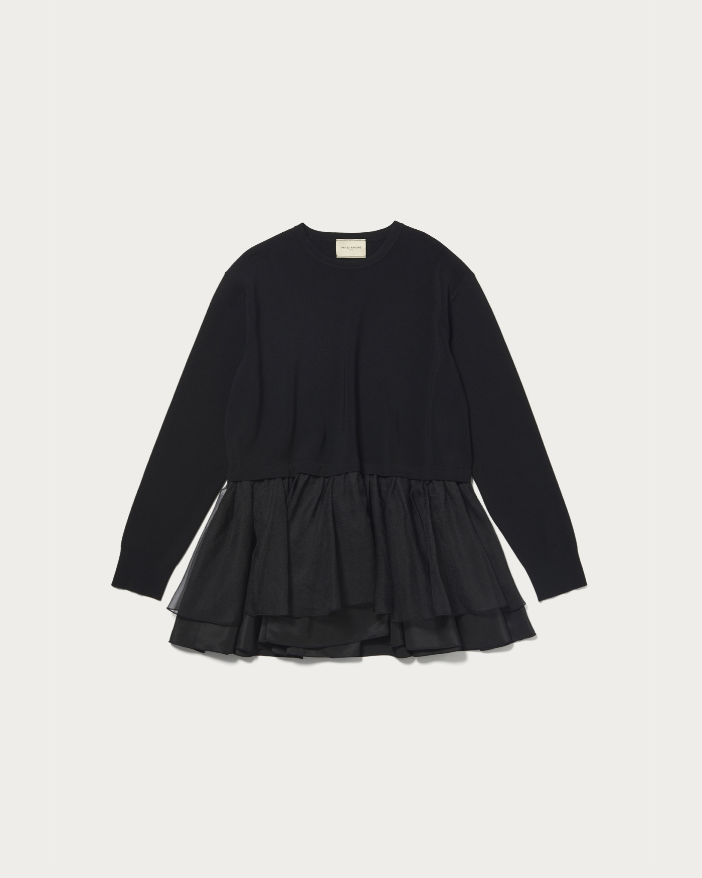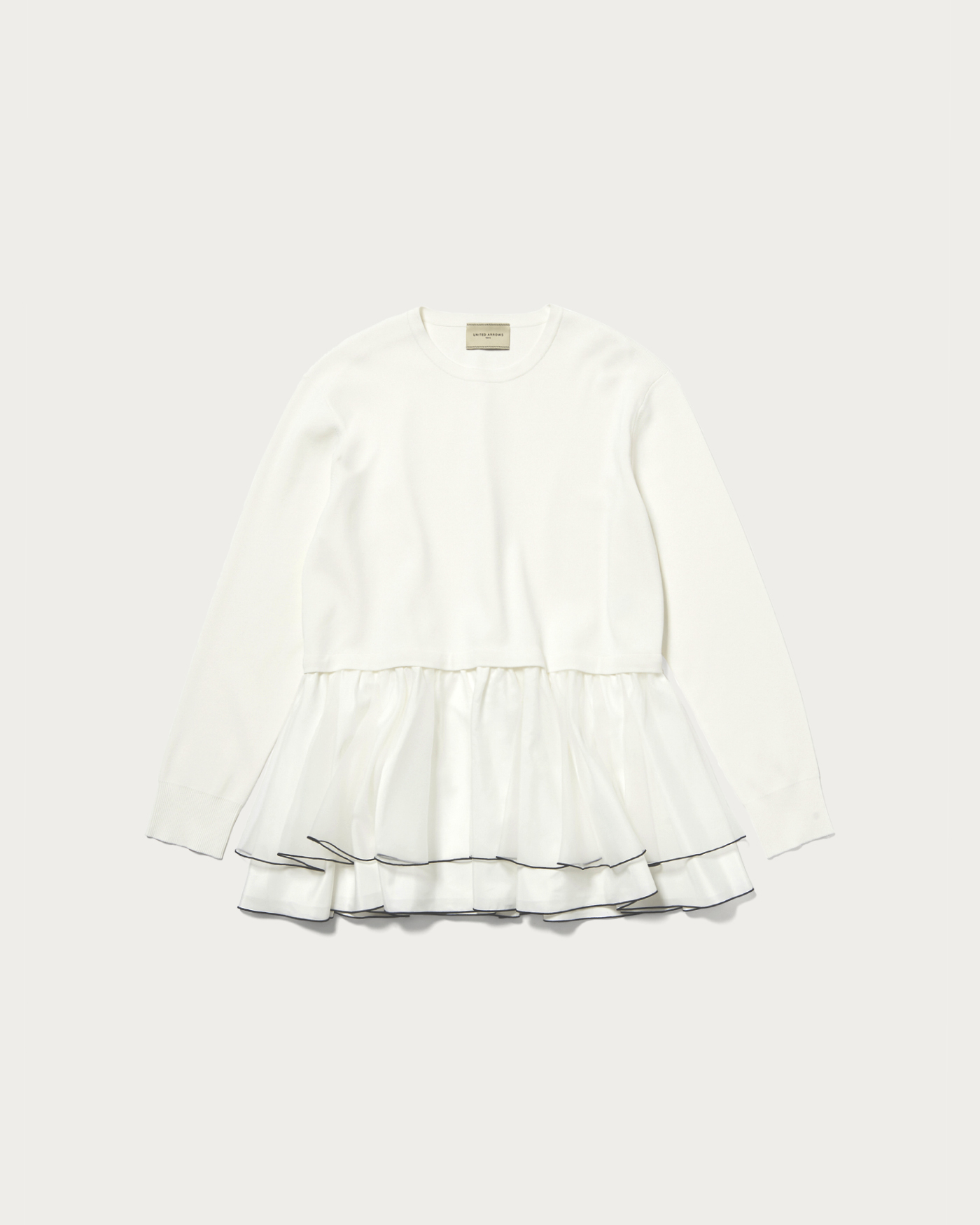 A striking combination knit with a change of material at the waist, creating a glamorous impression. The knit portion is made from a smooth rayon and nylon material, ensuring a comfortable wear. The tiered gathered frills have a voluminous feel, with the frill hems finished with a merrow edge for added accent. It is recommended to style it with sleek bottoms such as straight or tapered pants.