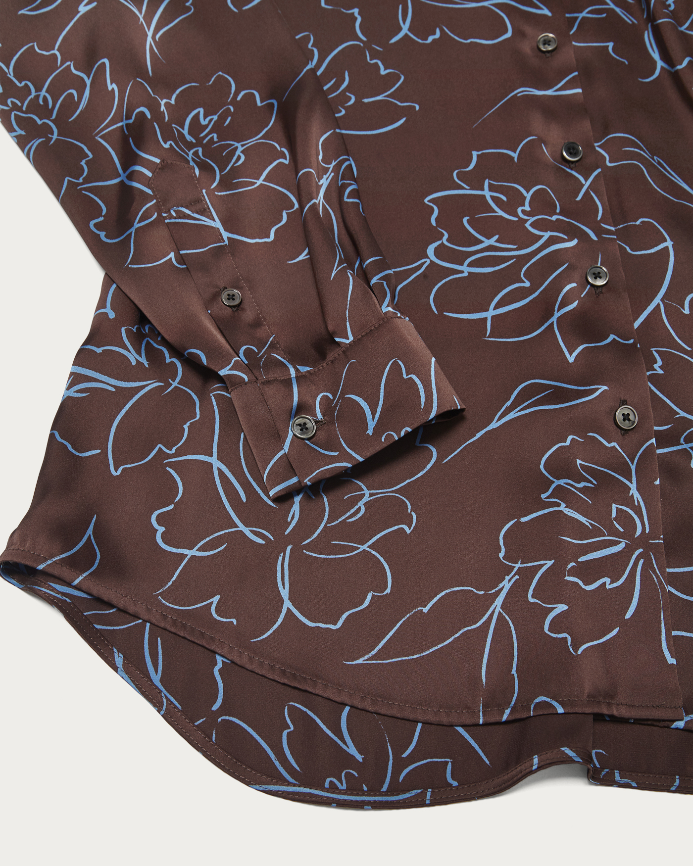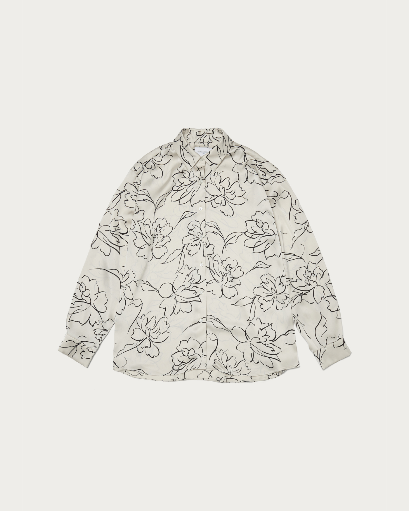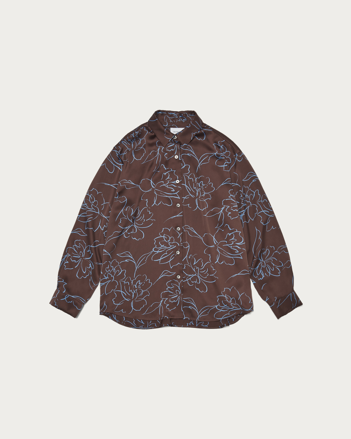 A full-pattern blouse made from drapey satin material, featuring an eye-catching floral design in a line-drawing style. The relaxed fit and smooth, skin-friendly satin naturally conform to the body, creating a sophisticated look. It pairs perfectly with matching bottoms for a coordinated set-up style, and its subtle sheen makes it a great match with structured pants as well. It can also be worn as a light outer layer, making it a versatile piece that can be enjoyed throughout the seasons.
