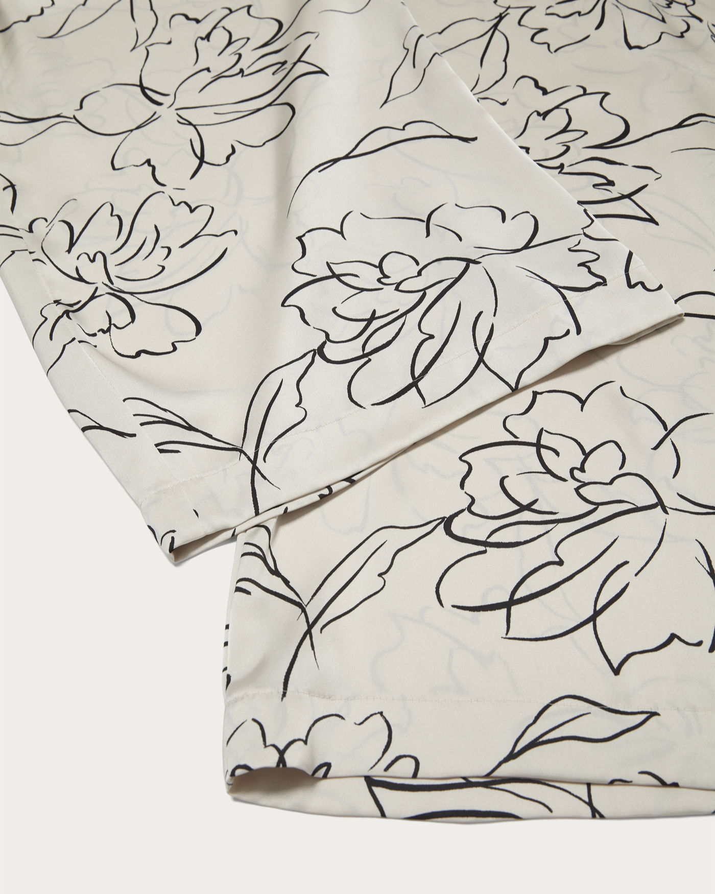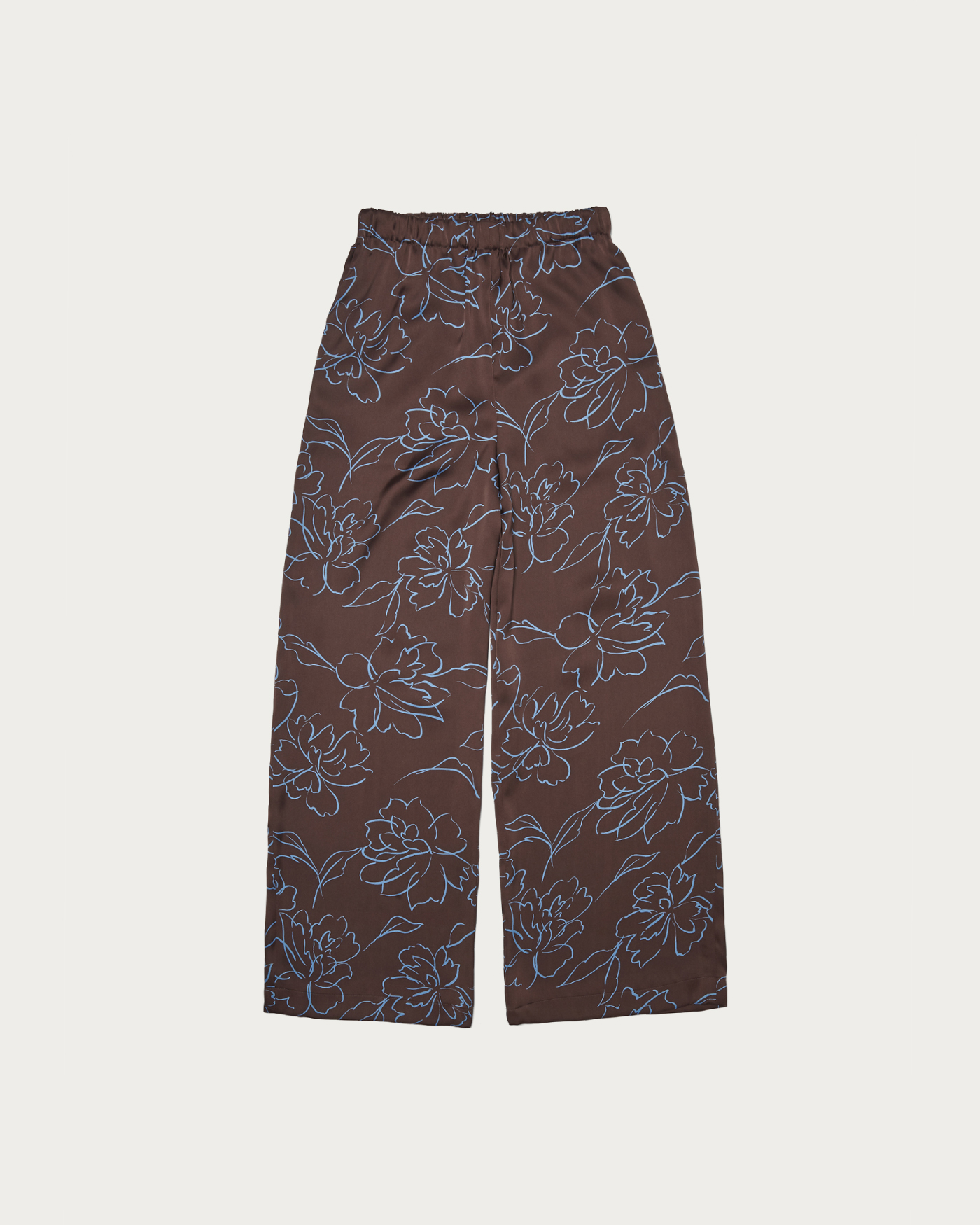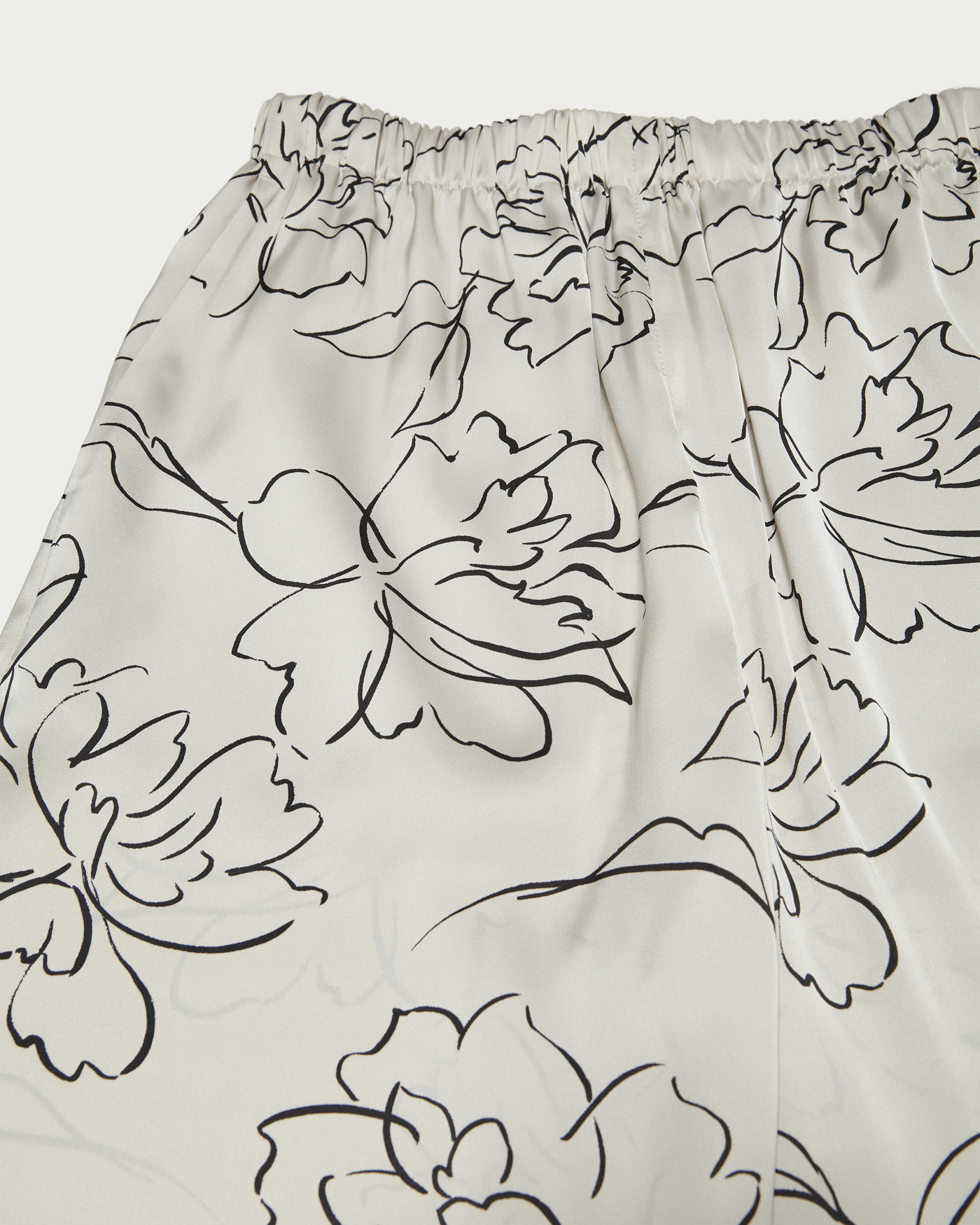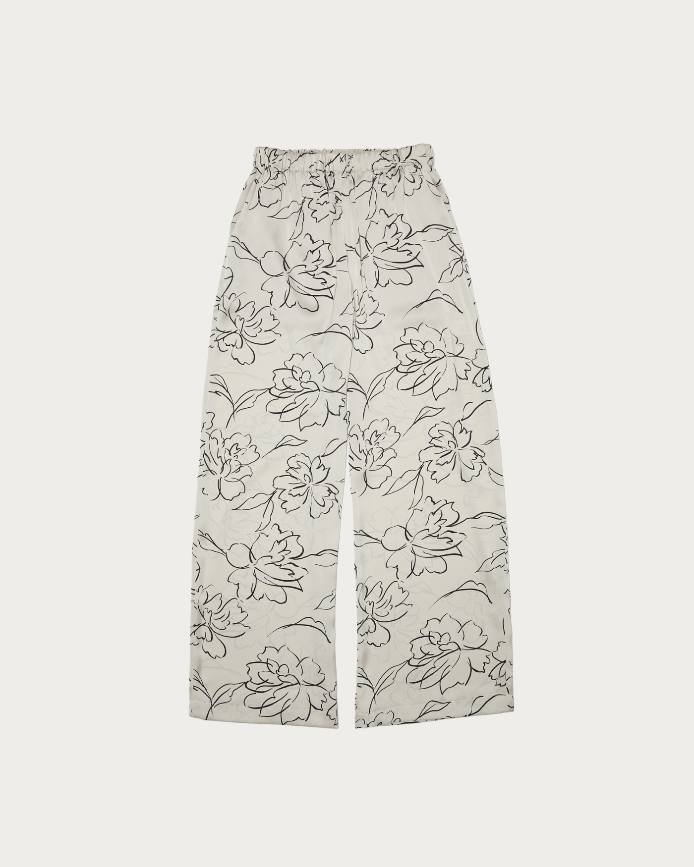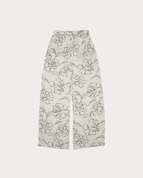 Easy pants made from drapey satin material featuring an eye-catching all-over floral pattern in a line-drawing style. The relaxed fit and smooth, skin-friendly satin naturally conform to the body, creating a sophisticated look. While they pair perfectly with a matching shirt for a coordinated set-up style, their subtle sheen also complements crisp shirts or oversized knits. The elastic waistband ensures a comfortable, relaxed fit.