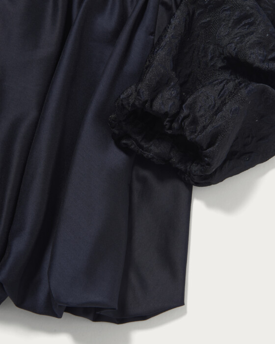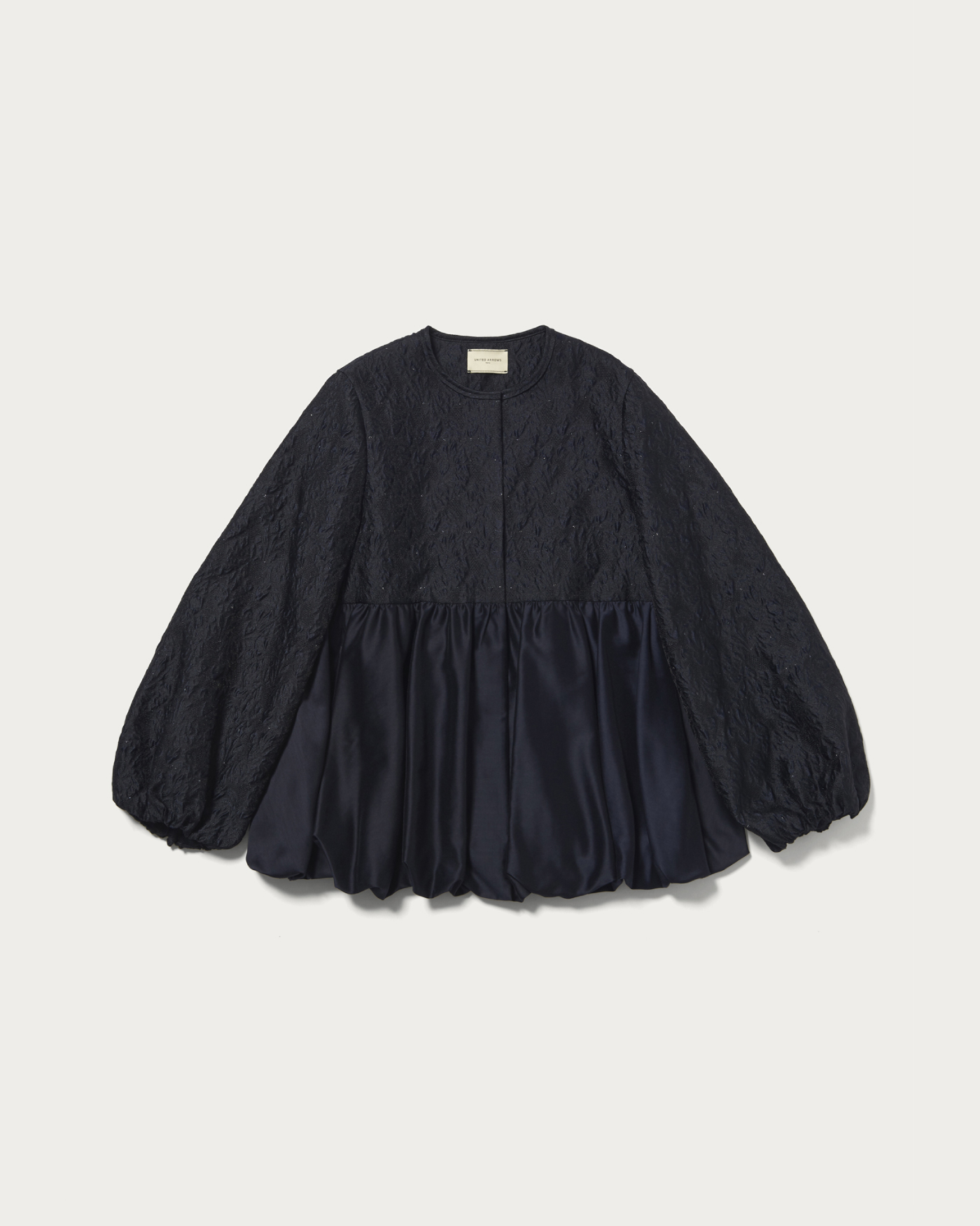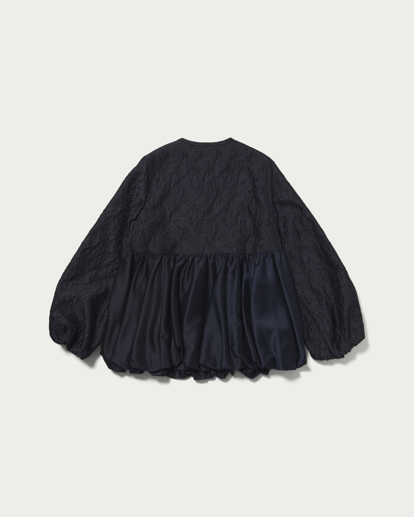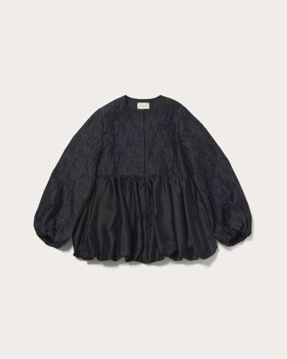 A standout blouson jacket in lightweight jacquard. This piece features a charming texture with a light touch of puckered jacquard and sections accented with lamé. The balloon silhouette, crafted from soft material, is enhanced with peplum details in contrasting fabrics, offering a feminine impression. The front is designed with concealed snap buttons, adding a subtle sparkle when opened. We recommend pairing it with matching pants or a dress made from the same material for a coordinated look.