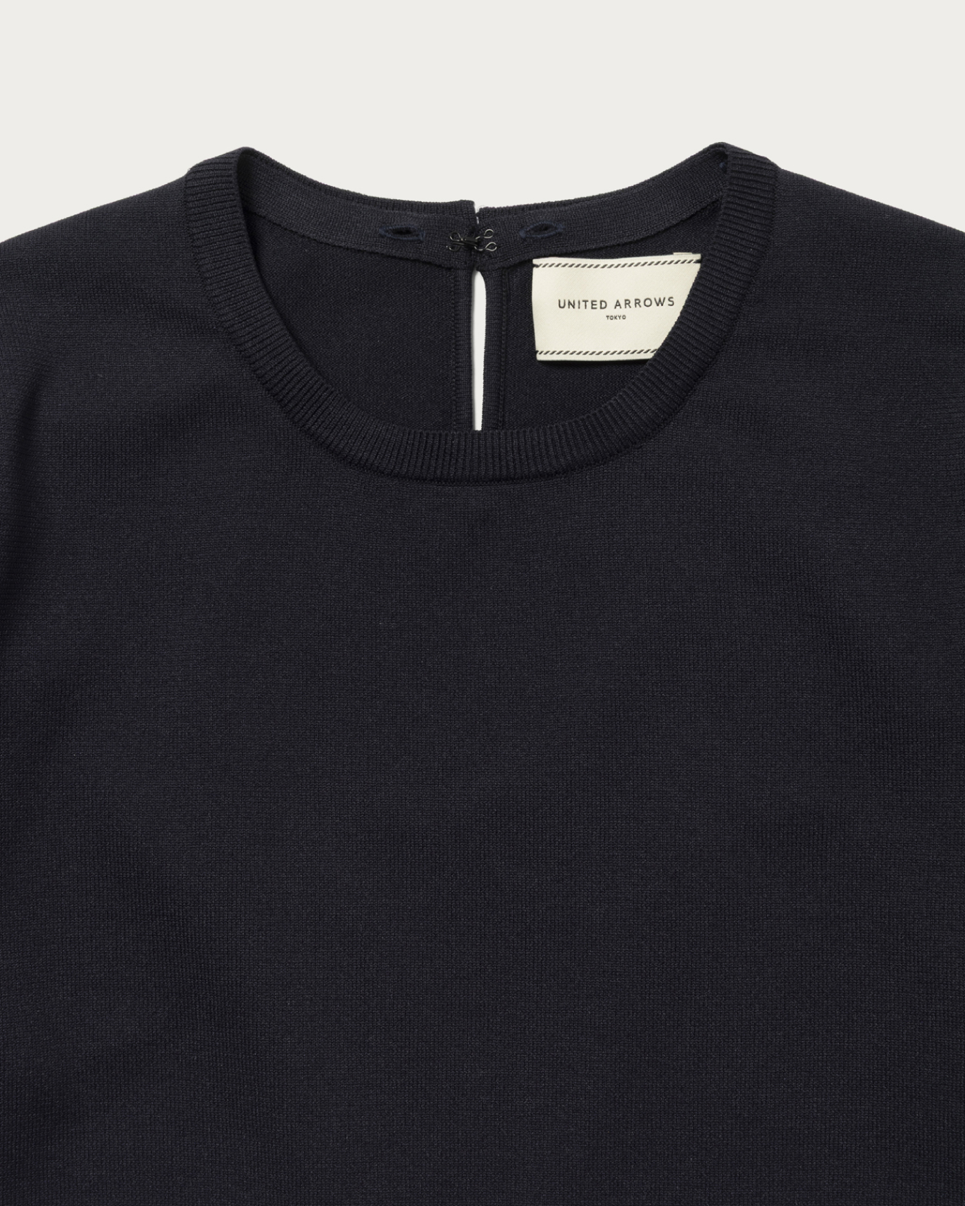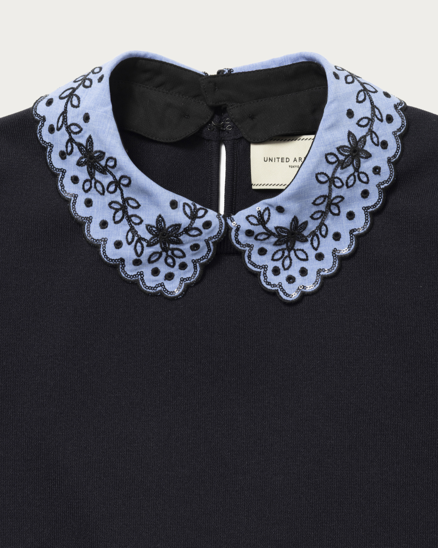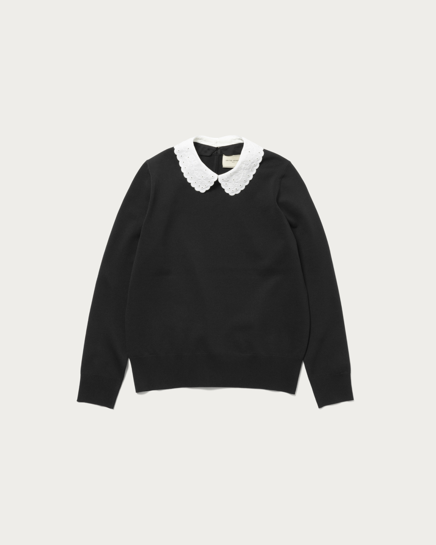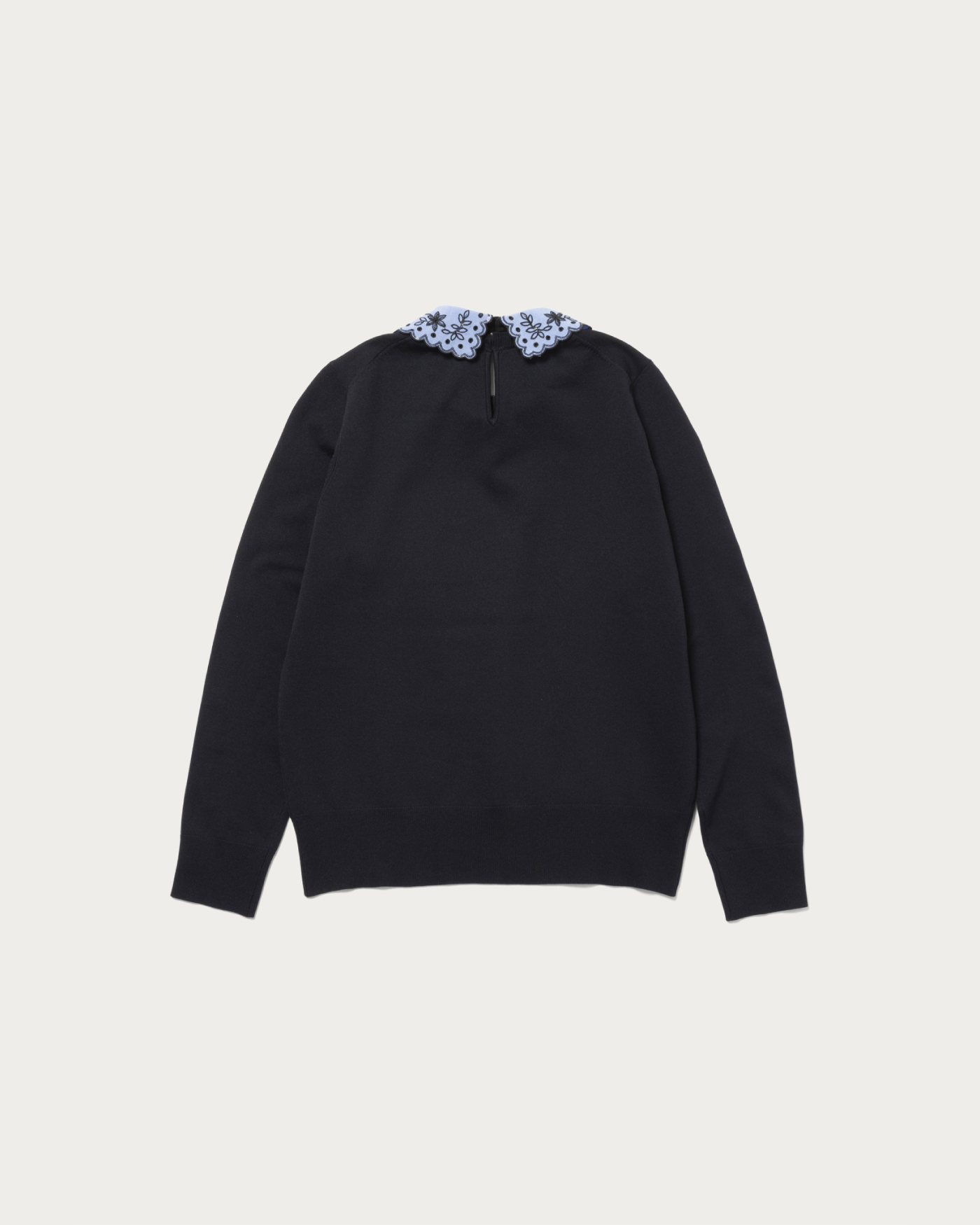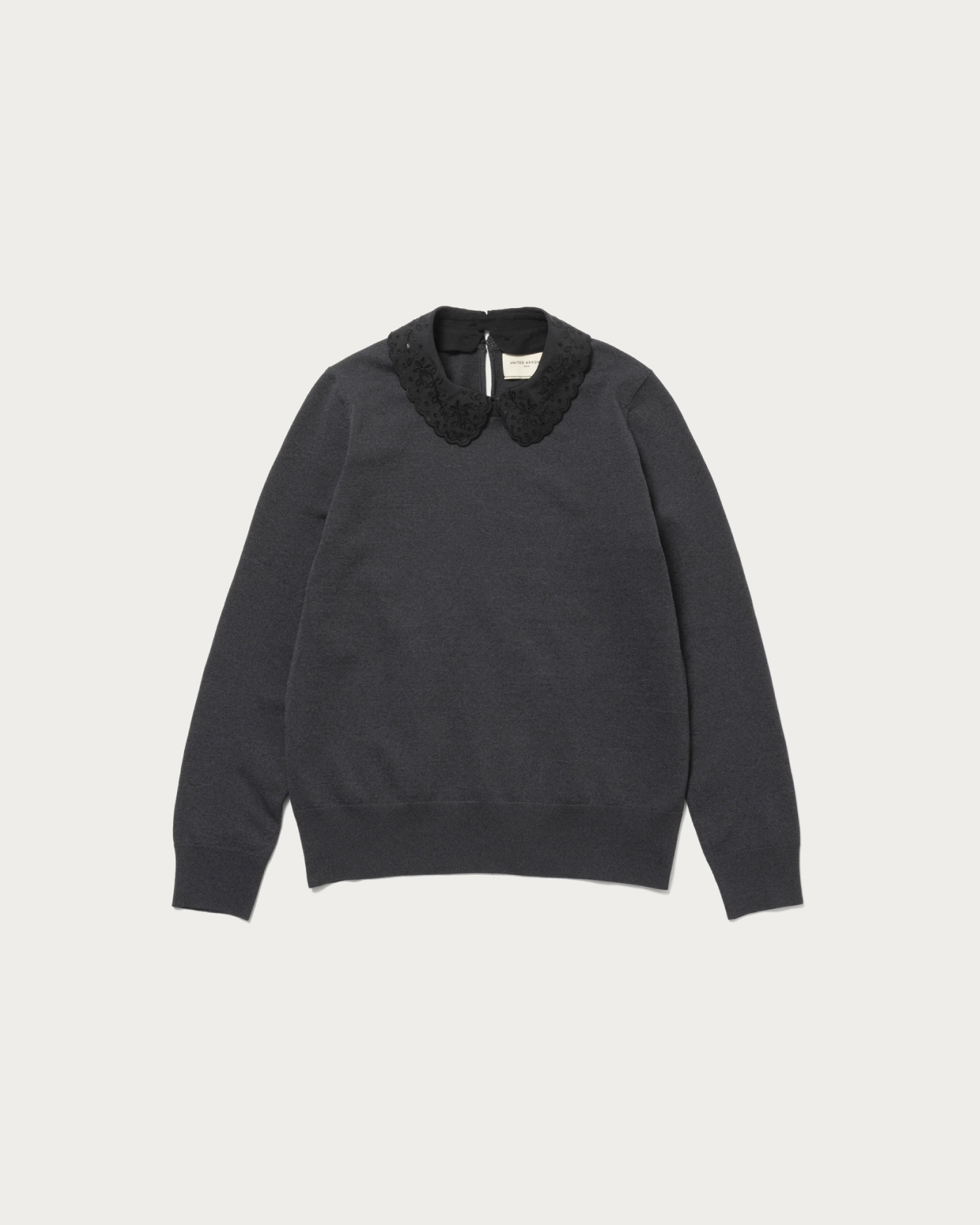 This knit features a subtly sparkling sequin-embroidered collar. The detachable collar adds a touch of glamour with its shimmering sequins and floral details. When the collar is removed, it transforms into a versatile basic knit, offering a different look with its 2-way design. This piece can be styled in a wide range of ways, from casual weekend outfits to office settings, depending on the bottoms you pair it with.