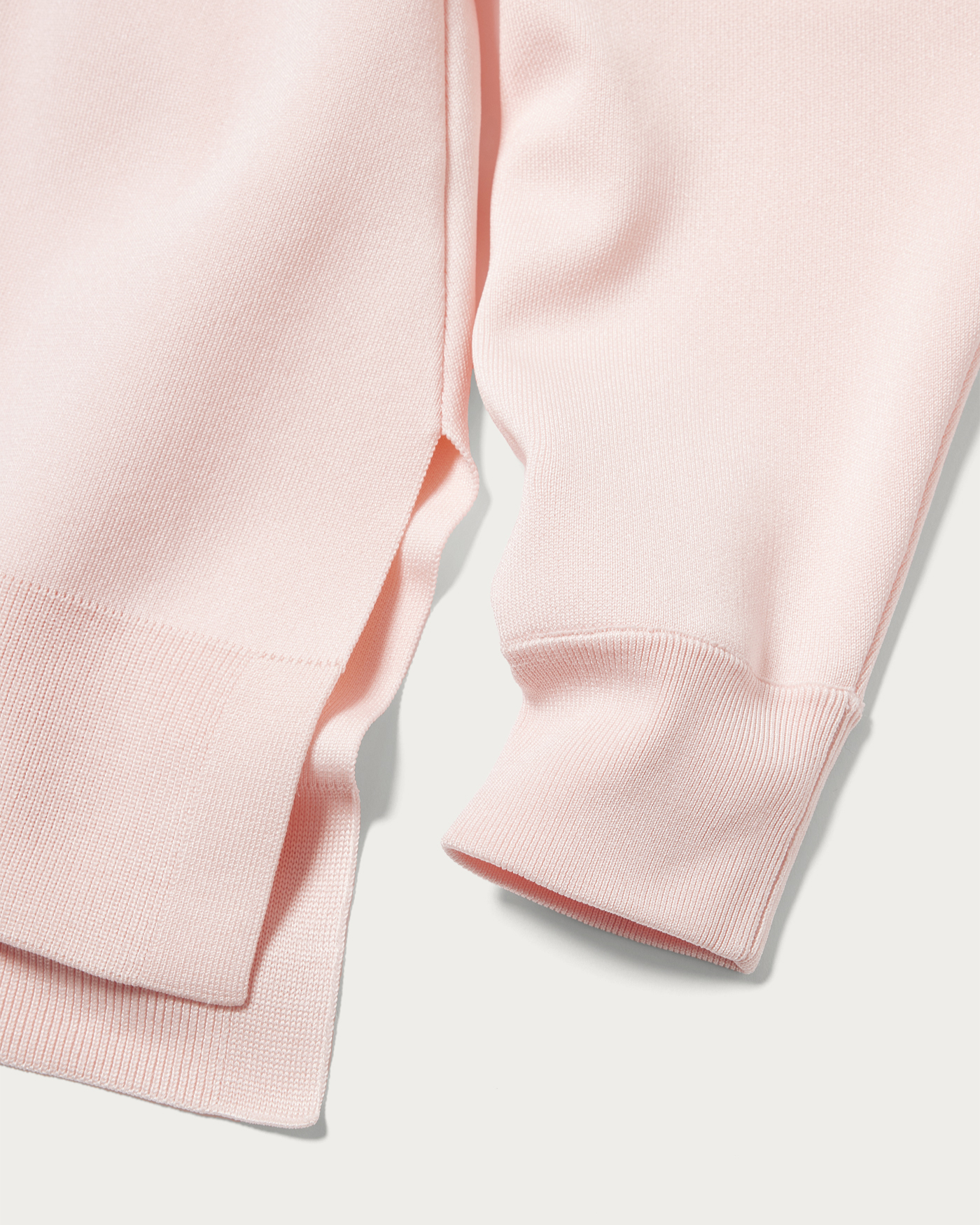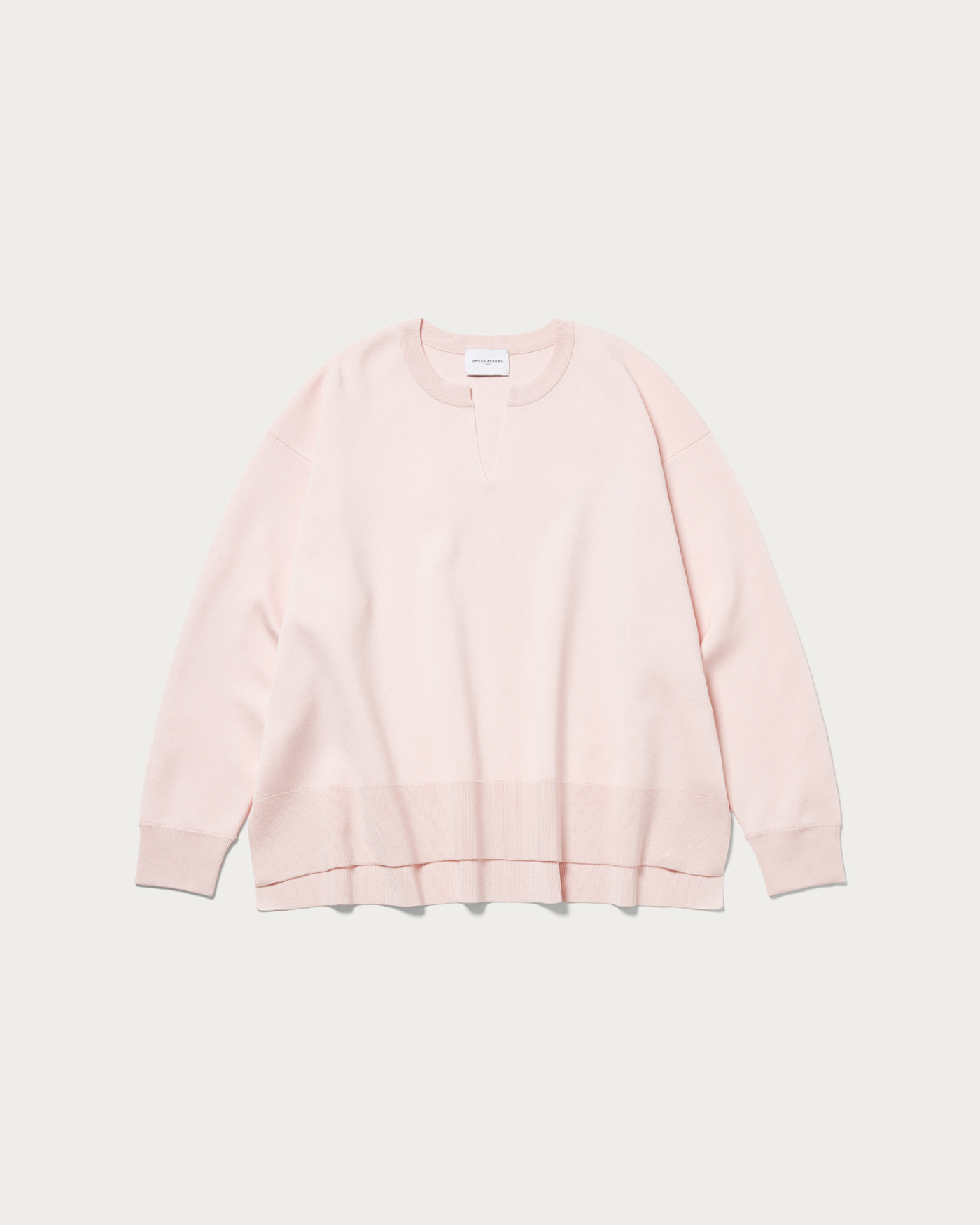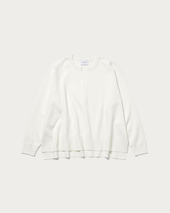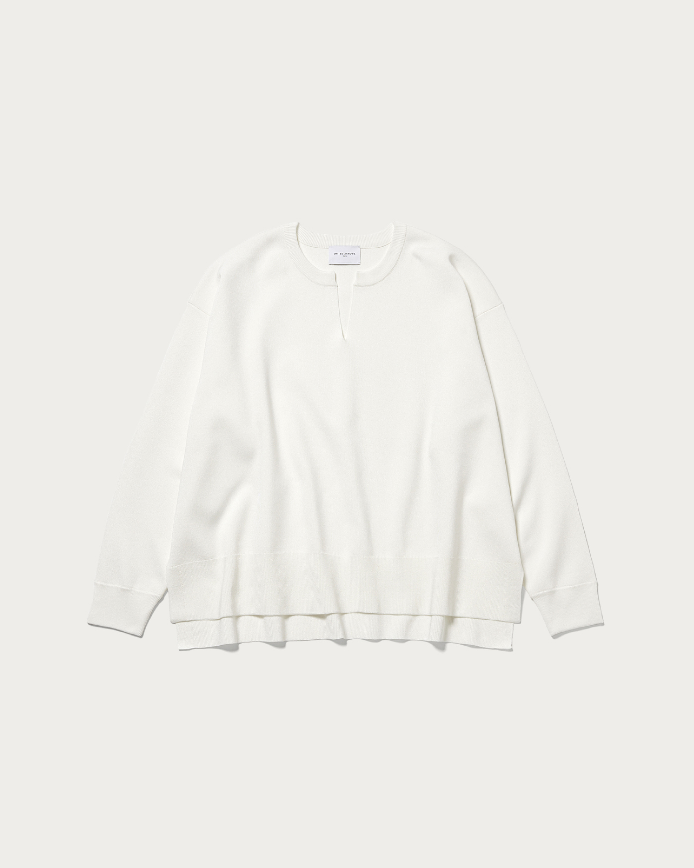 A skipper knit that achieves both elegance and a relaxed feel with its tent line design. Made from a comfortable polyester and acetate blend, it can be worn year-round and is easy to care for at home. While it can be worn on its own, its loose silhouette also makes it ideal for layering with a shirt or lightweight knit underneath. Despite its casual knit texture, it boasts a refined quality that gives it a sophisticated, mature look.