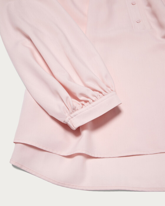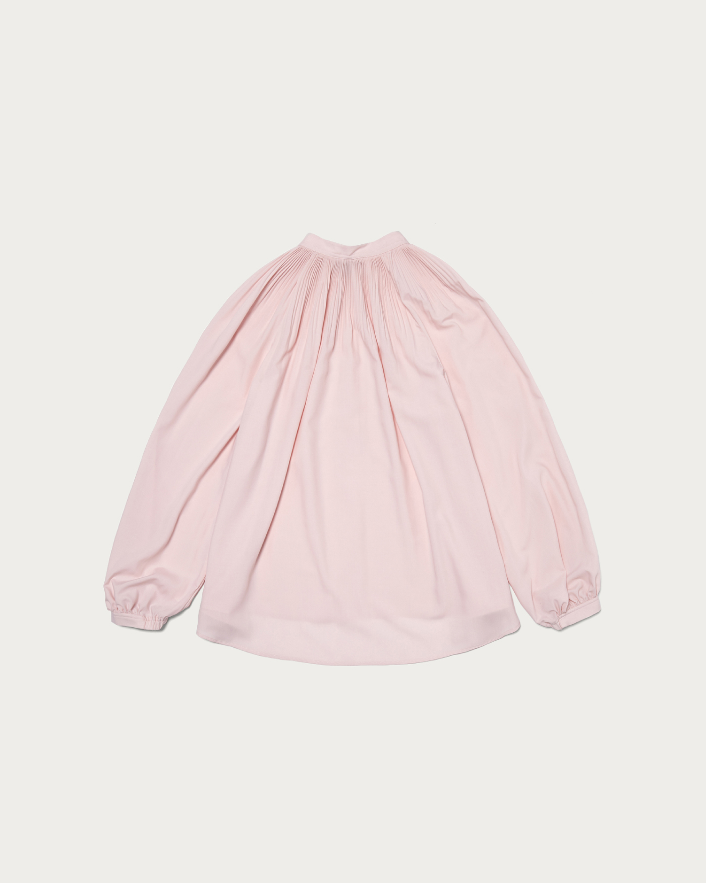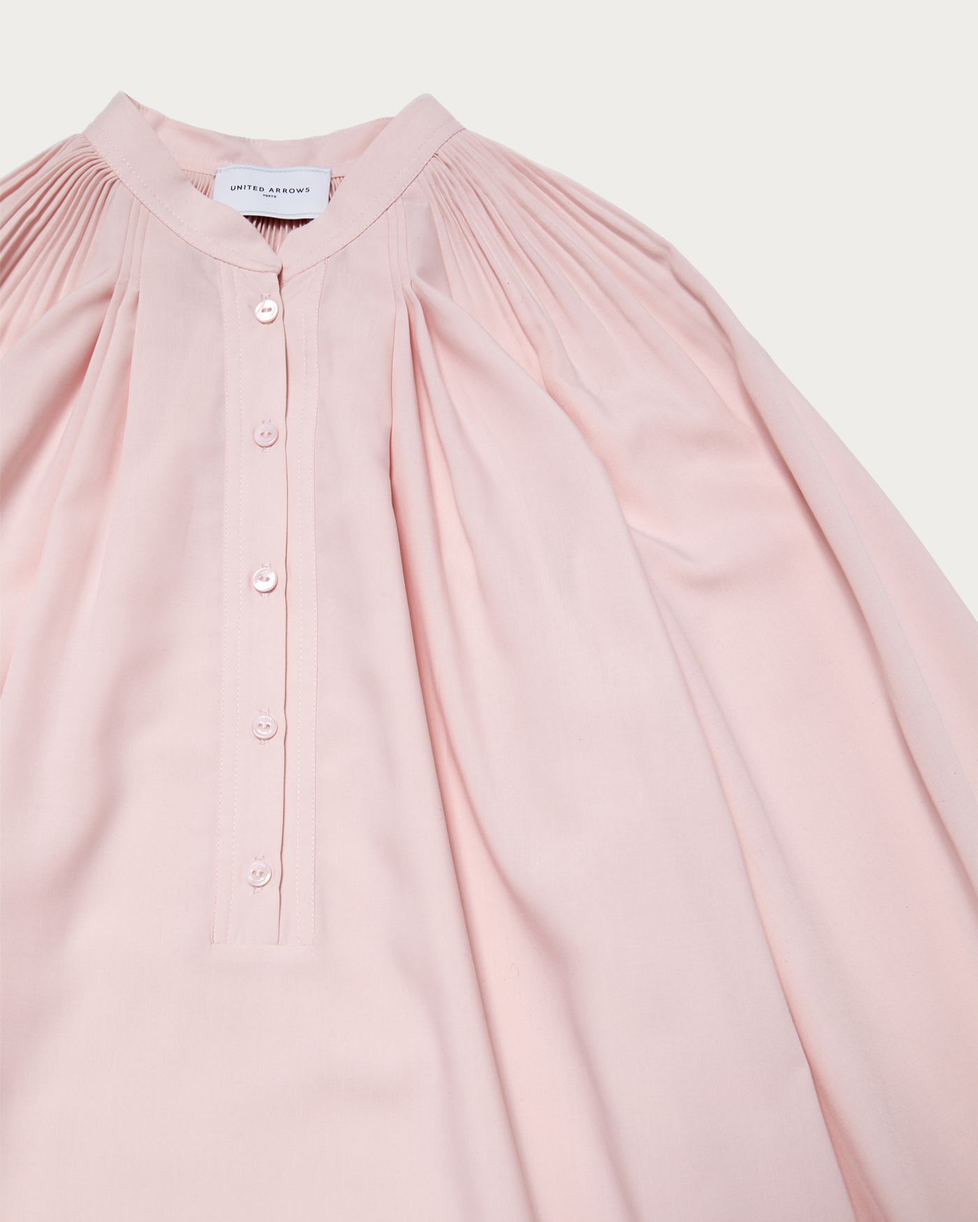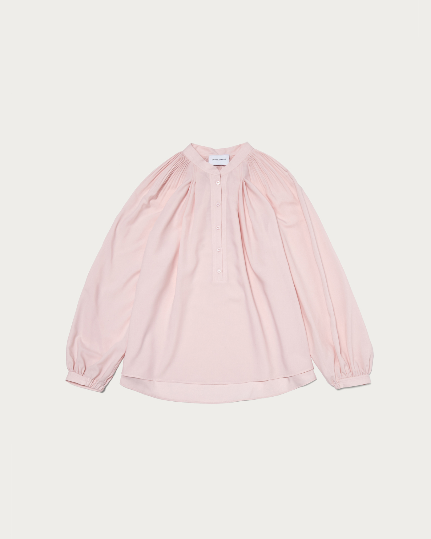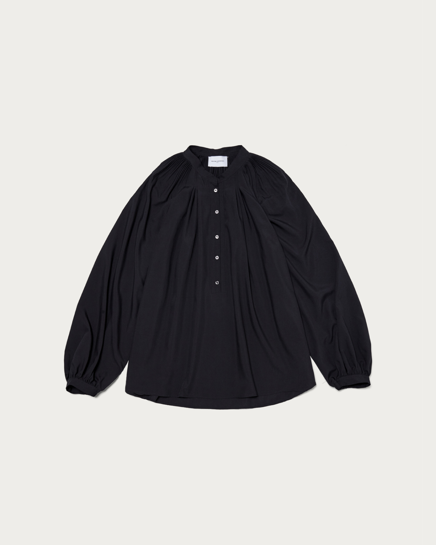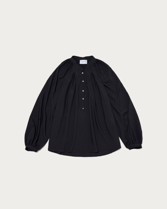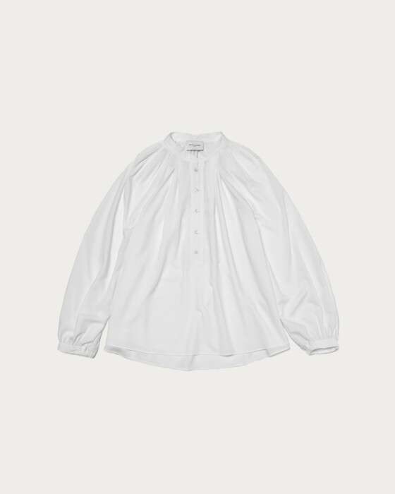 A beautifully voluminous blouse with a flare silhouette that unfolds from delicate pleats. Despite its volume, it maintains a graceful and neat appearance, with a band collar that gives a polished impression. It is recommended to pair it with slim tapered pants for a professional look. You can also unbutton it for a relaxed Henley neck style.