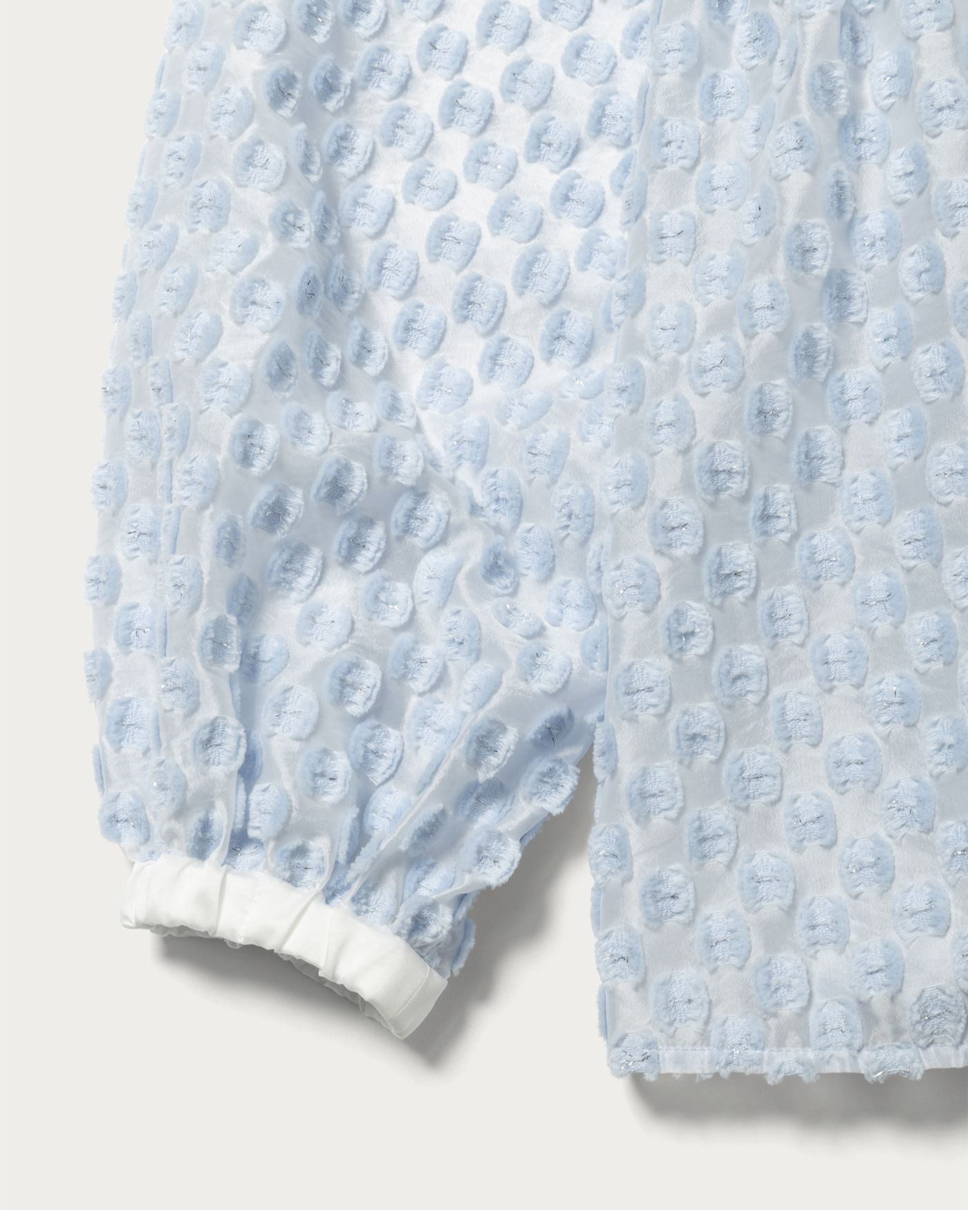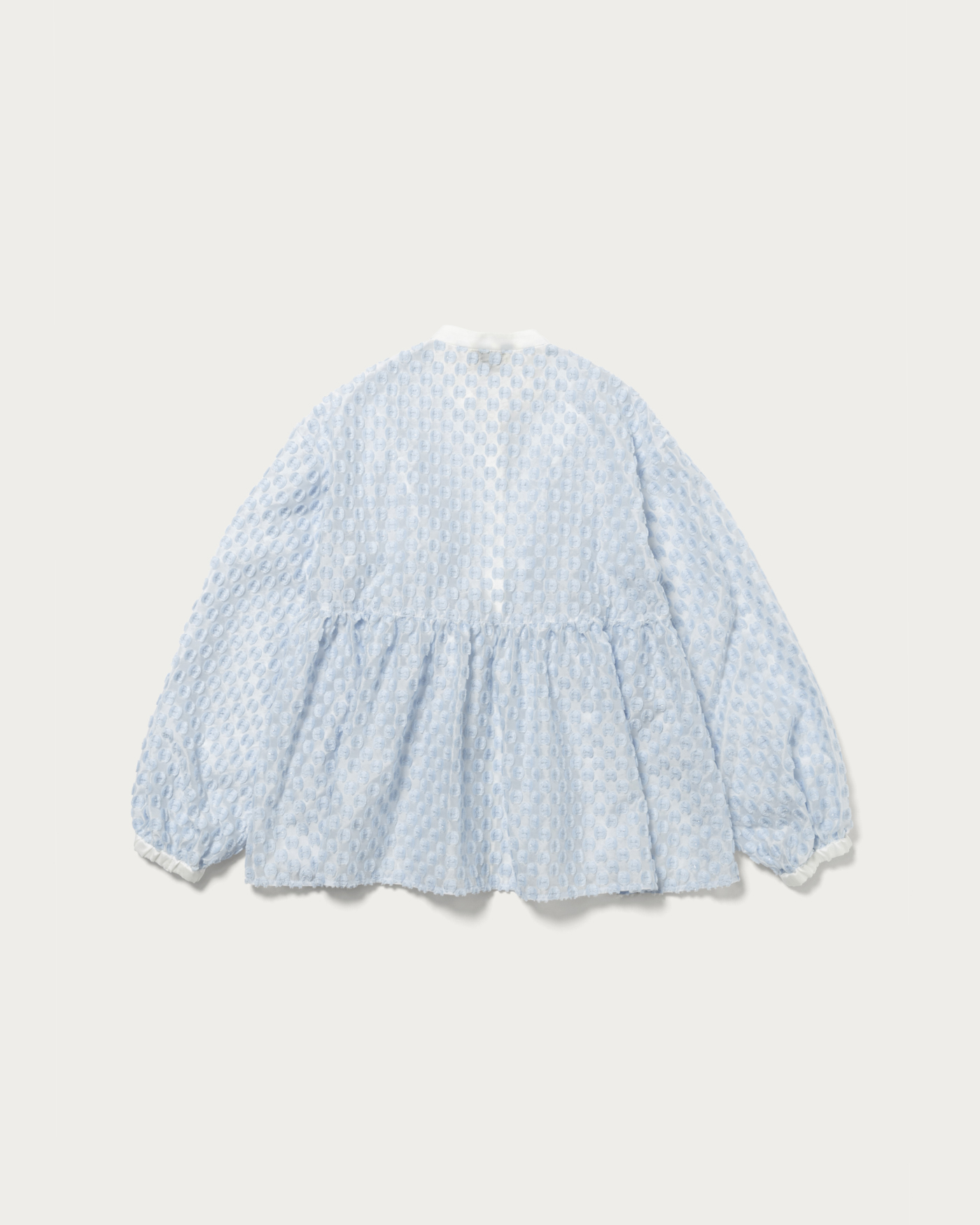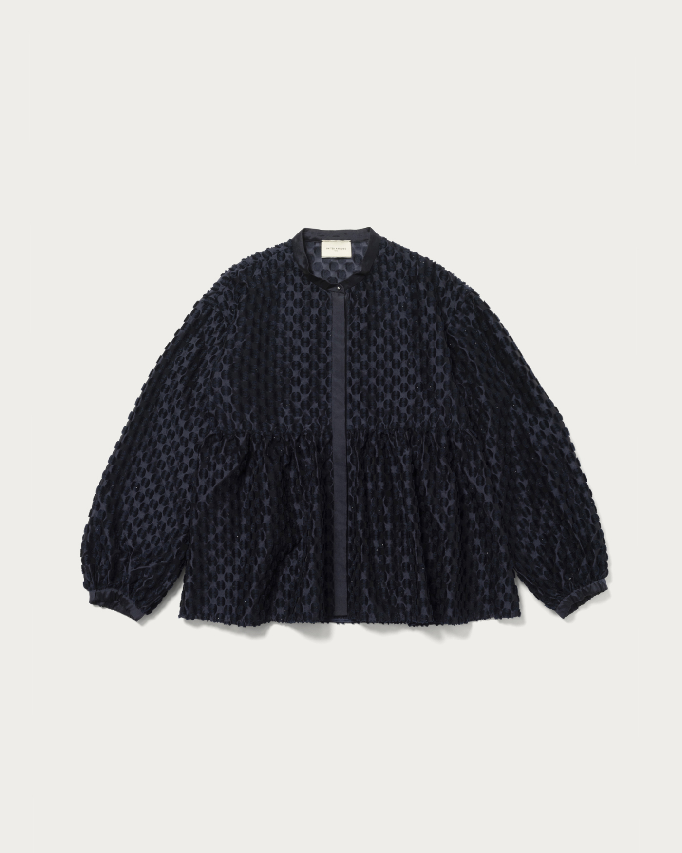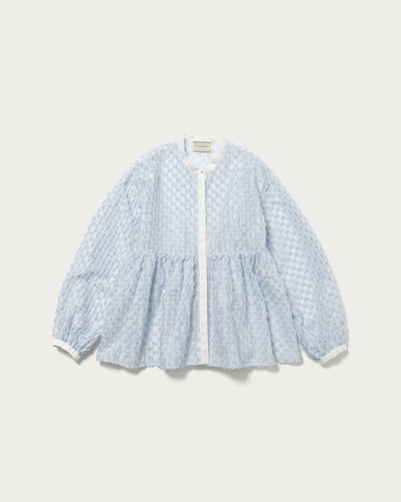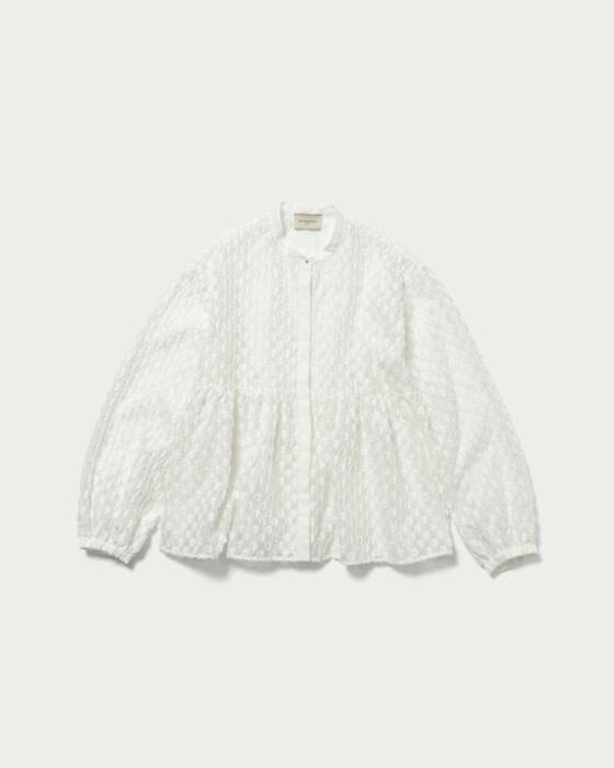 A peplum blouse with eye-catching shimmering polka dots. The silhouette features a slightly higher waistline, creating a feminine impression. The cuffs are equipped with flat elastic, allowing you to adjust the sleeve length freely. Solid fabric is used as a point, and the combination of different materials adds a subtle accent. This piece can be styled in a wide range from casual to feminine.