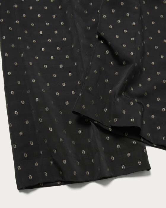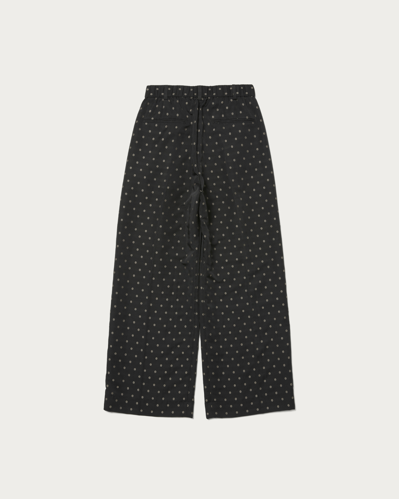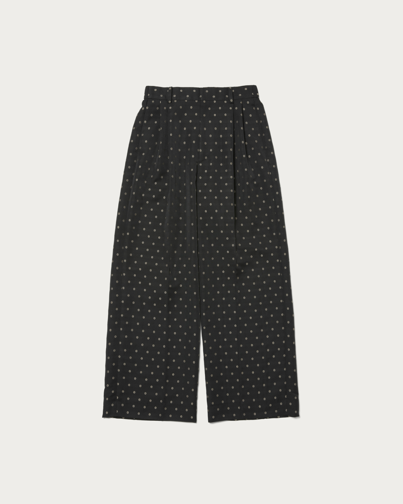At first glance, these wide pants may seem simple, but they feature intricate floral jacquard motifs that add a striking accent. The waist is designed with two tucks for a perfect fit, and the back includes an elastic band, offering a polished appearance while ensuring comfortable wear. Despite the all-over pattern, the delicate design makes them ideal for sophisticated styling when paired with shirts, knits, or jackets.