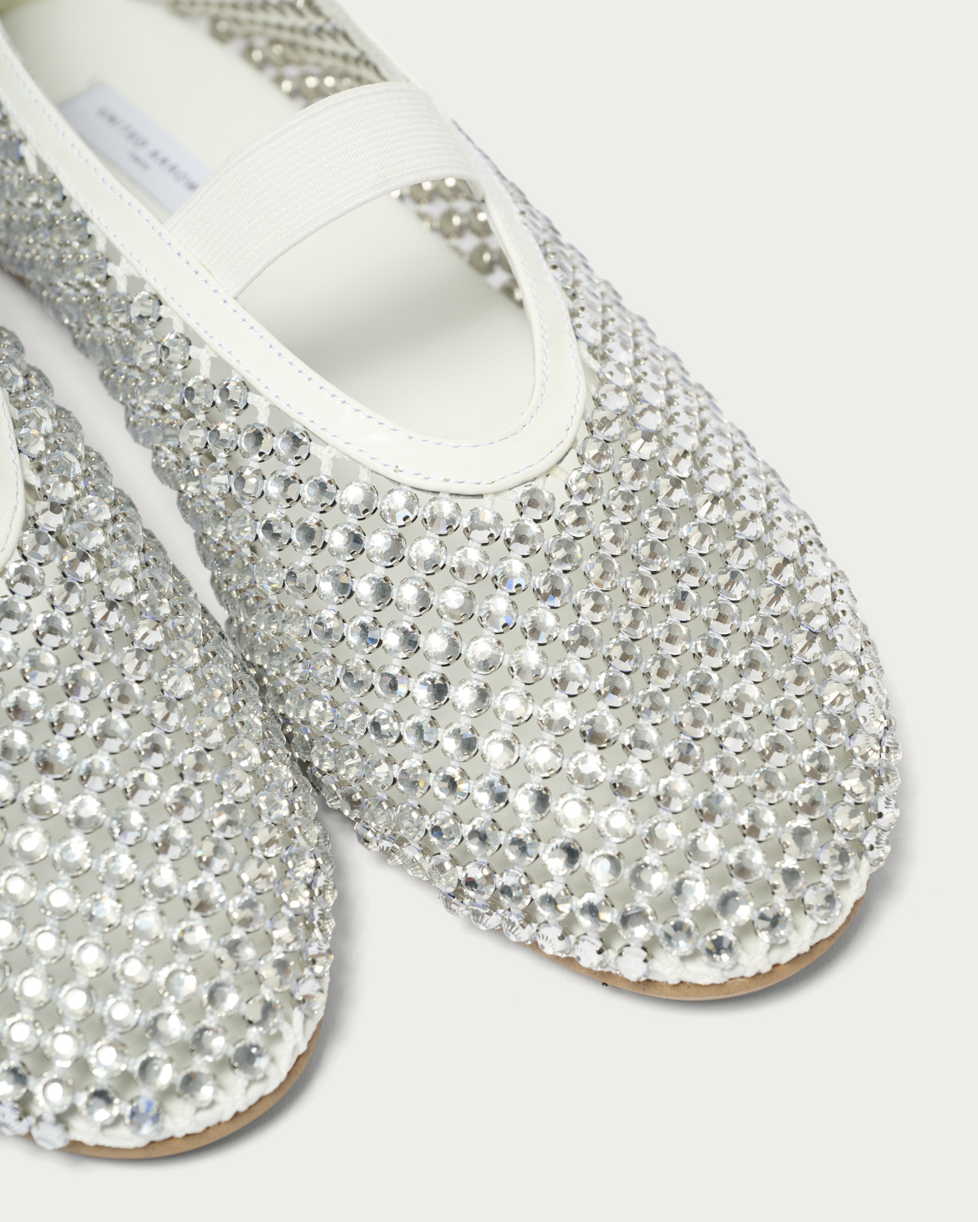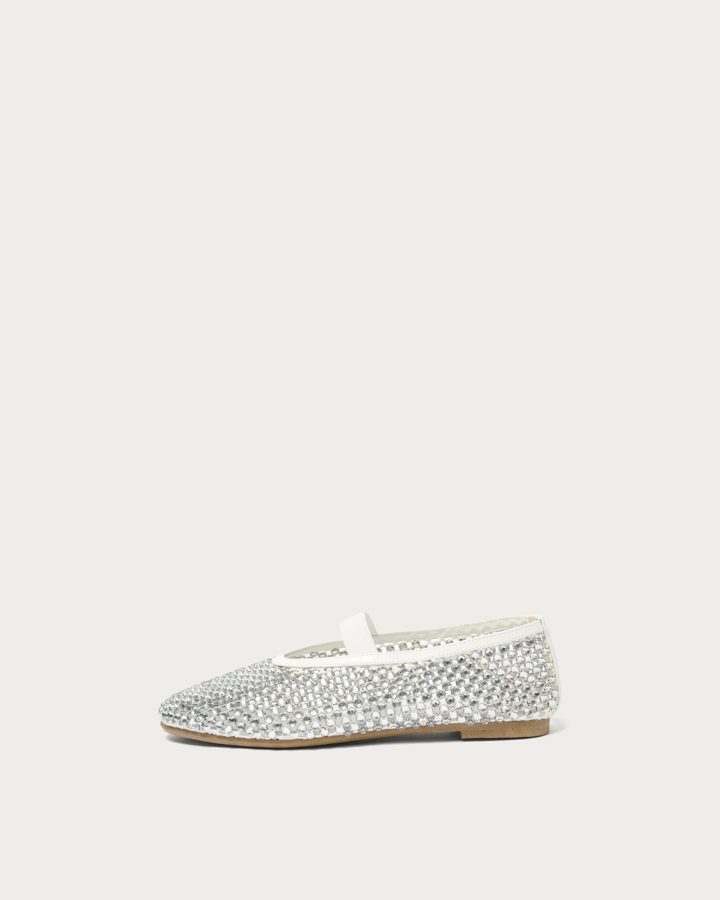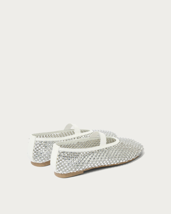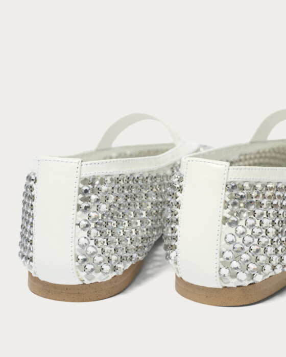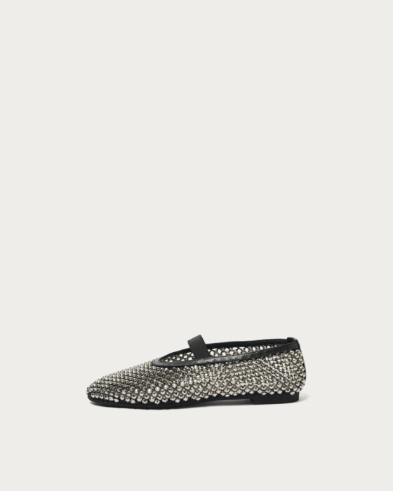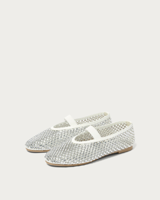 A pair of glamorous flat shoes adorned with sparkling jewels on a cool mesh. The lavishly arranged jewels make these shoes the star of your outfit. The jewels are securely fastened from the back, ensuring they stay in place and giving you peace of mind. The rubber strap adds a touch of effortless style, making them easy to pair with casual outfits. During colder months, pair them with socks, and in spring, they are perfect for wearing barefoot.
